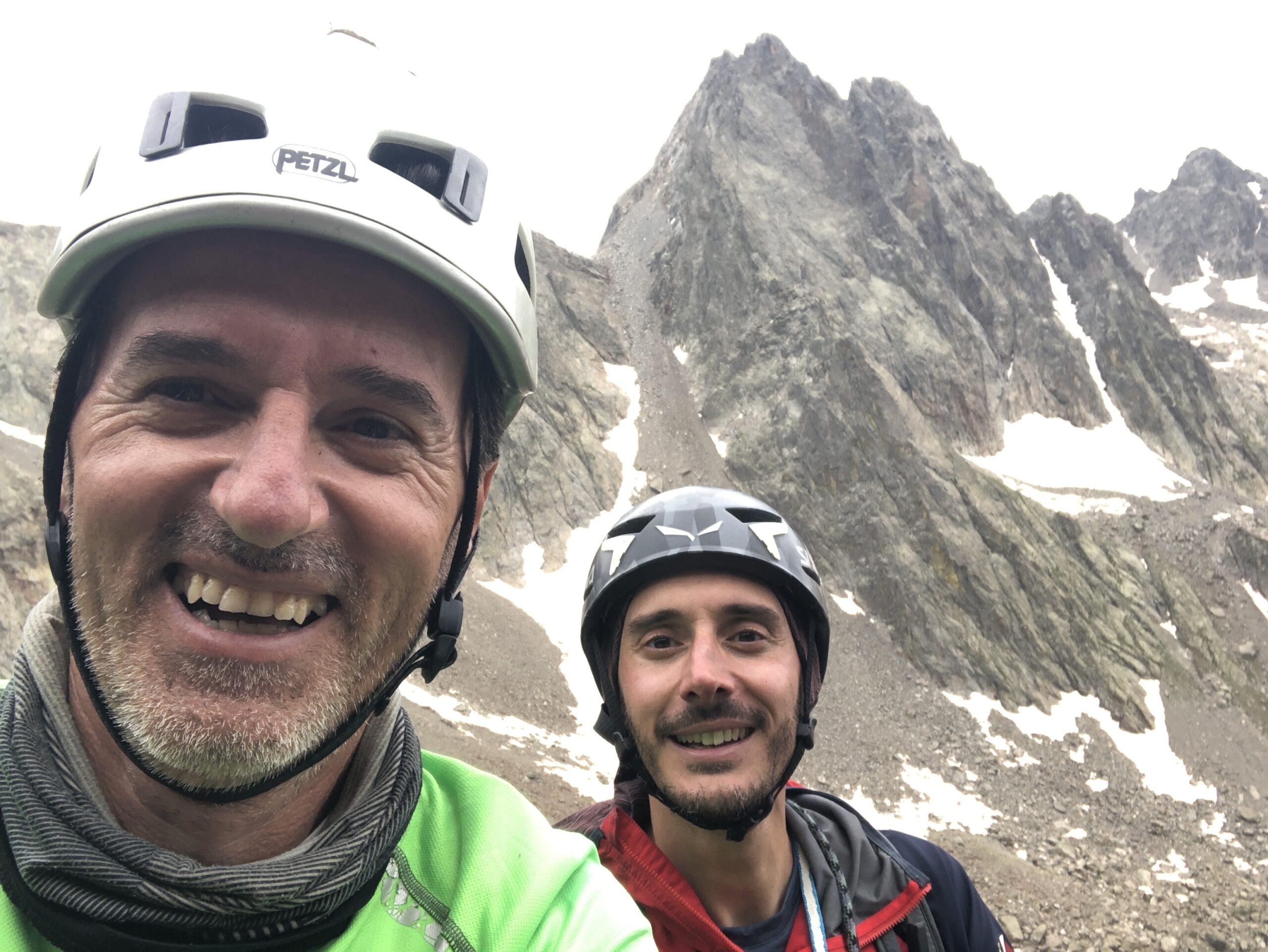 Da non amante dei camini, dopo il bel diedro dell’ultimo tiro, anziché uscire dove questo diventa camino, sono uscito in placca a destra, tra l’altro con ottima possibilità di proteggersi su solido spuntoncino.