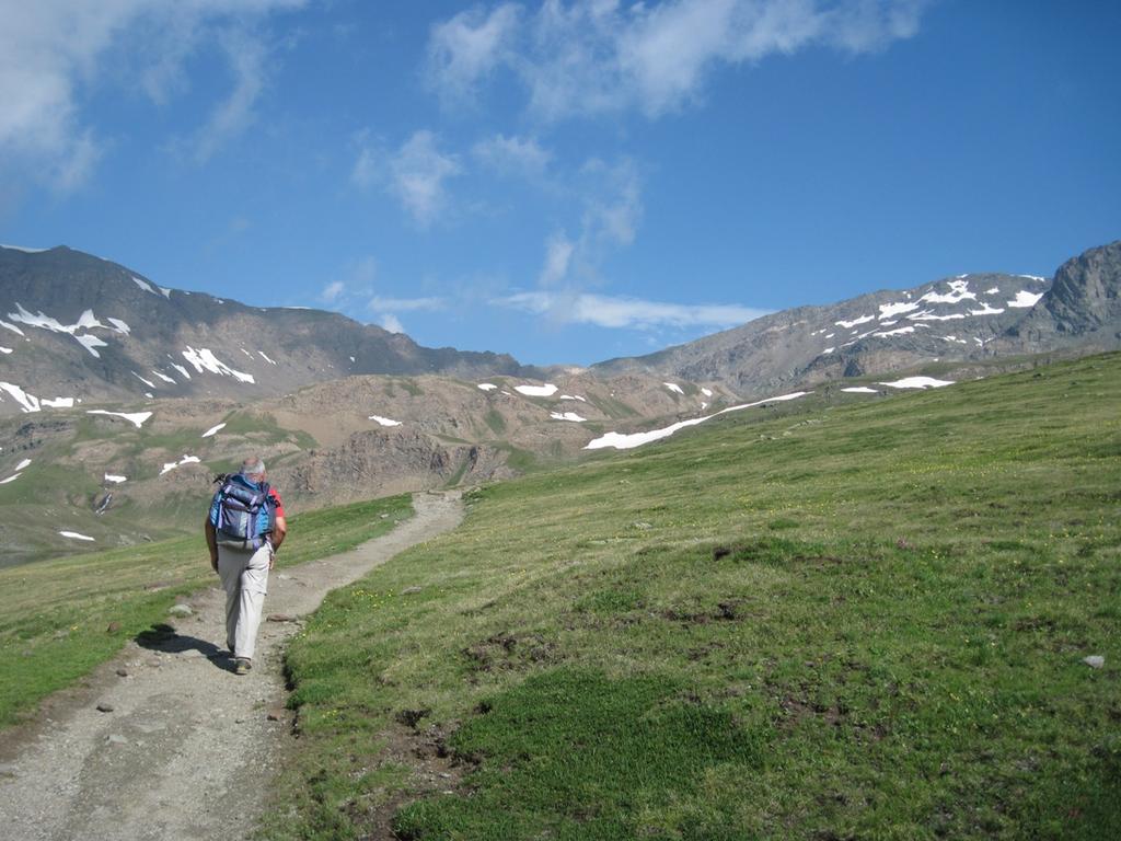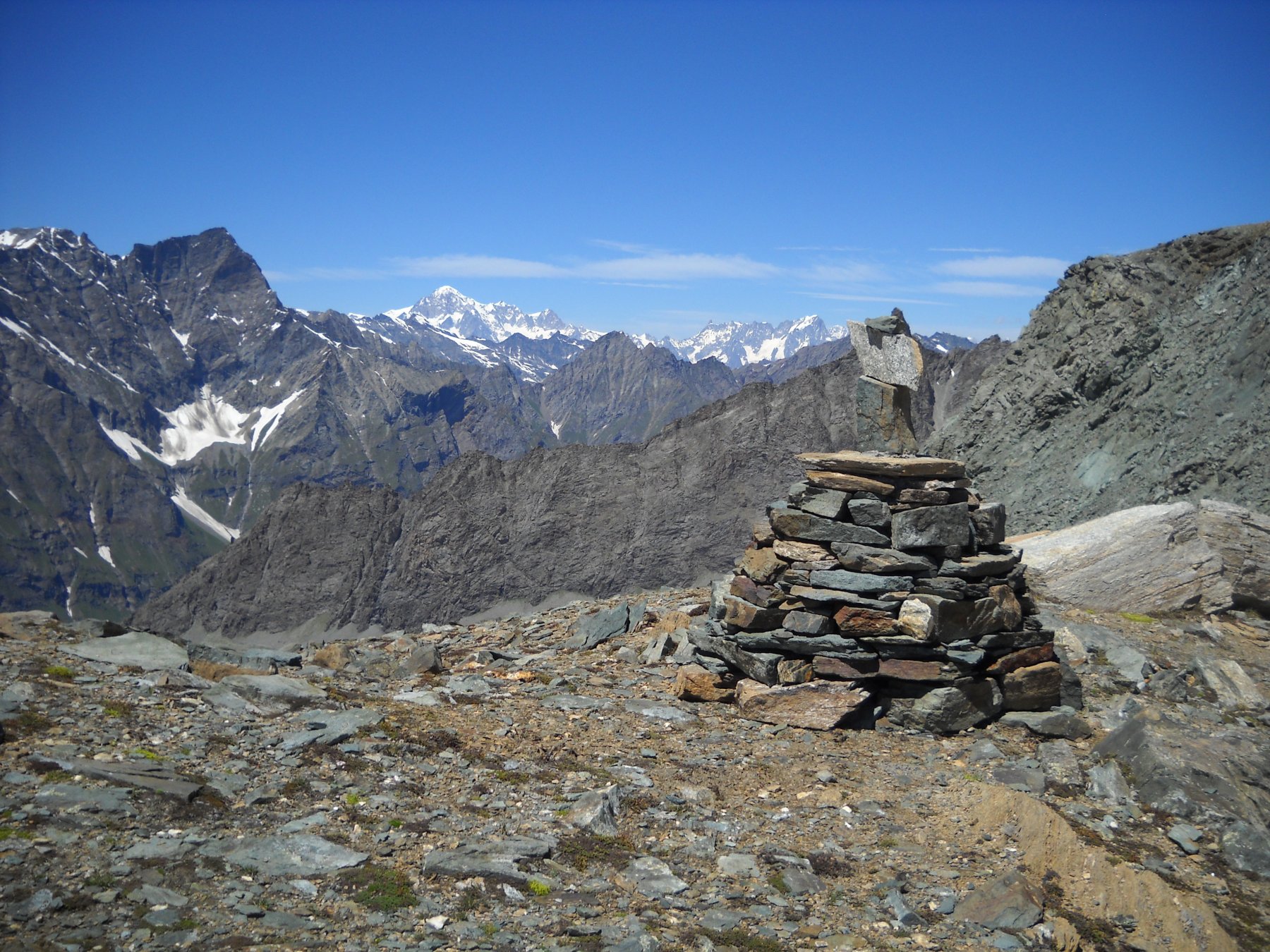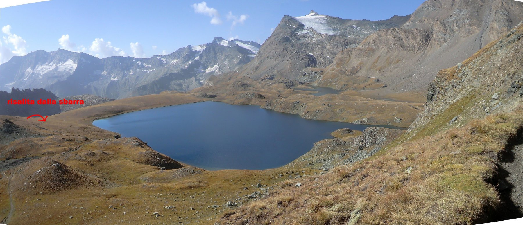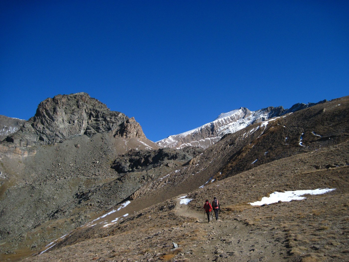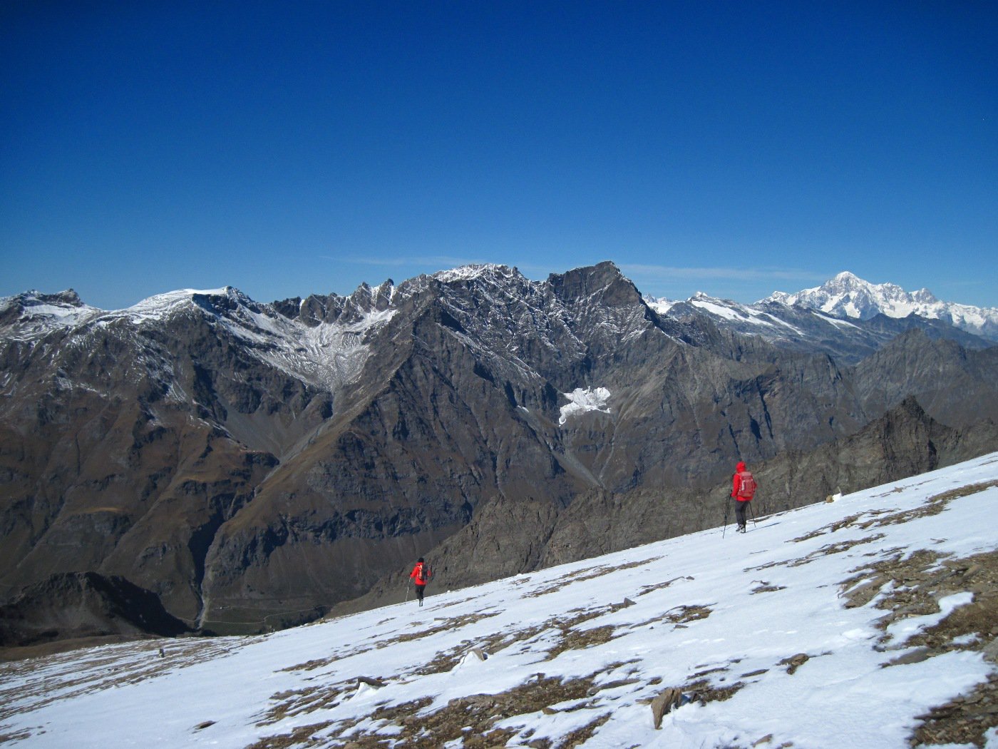 Dal colle ci si tiene sul versante ovest (valle di Rhemes) fino a un colletto panoramico. Evitare le varie tracce che piegano a destra prima, perchè tutte più difficoltose di quella segnata.