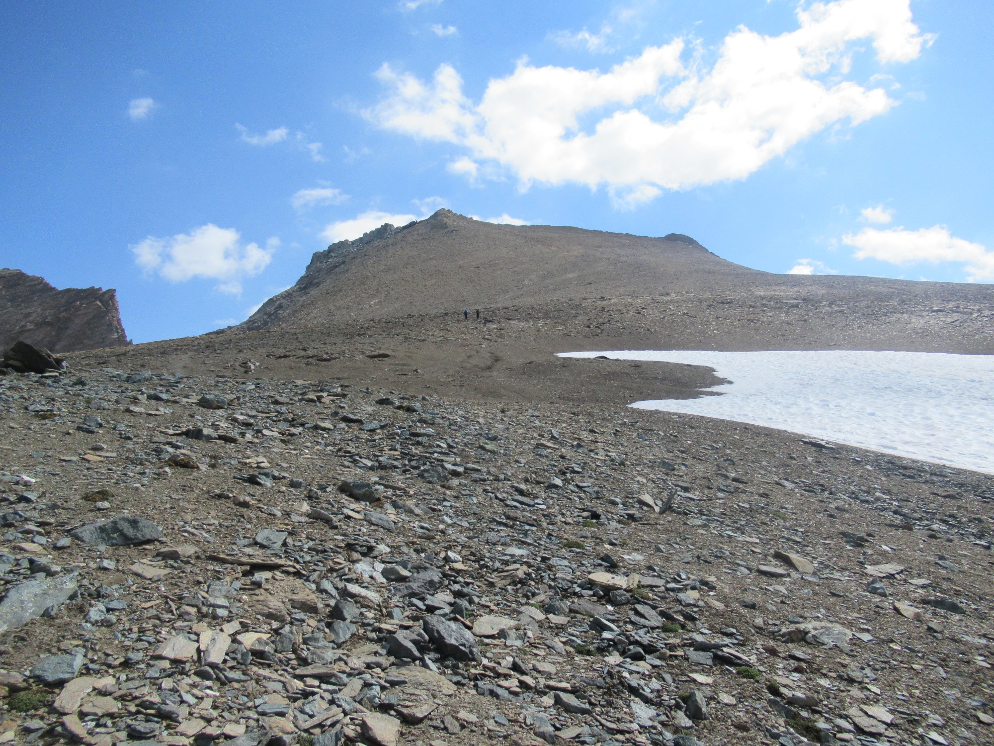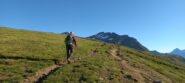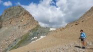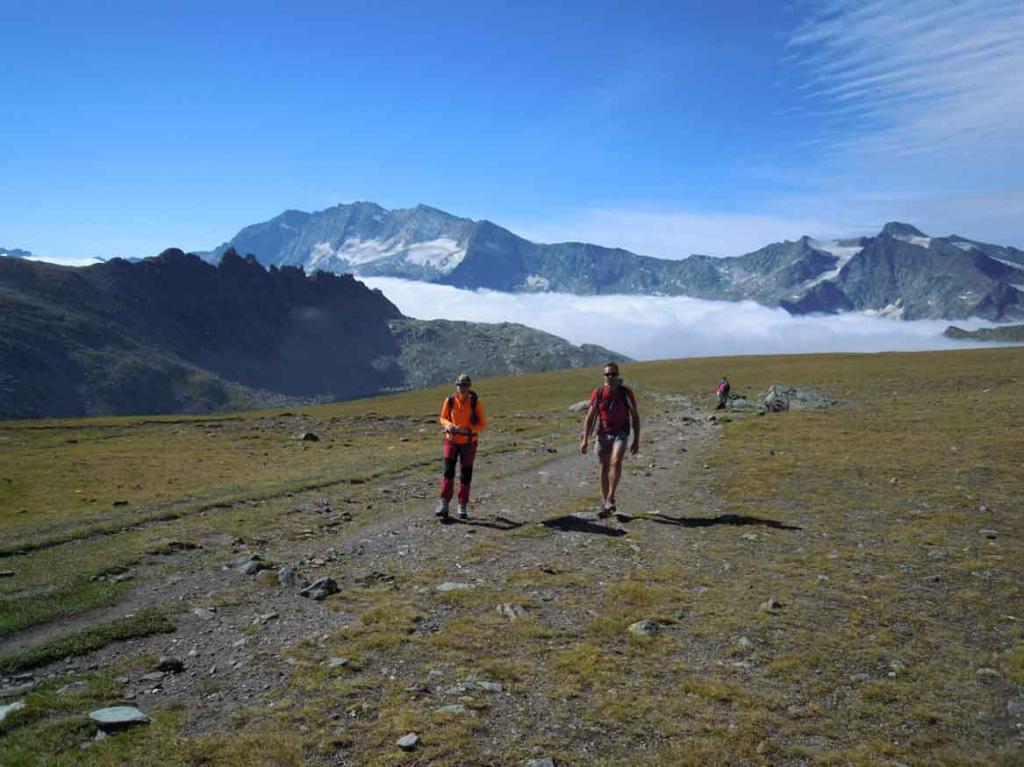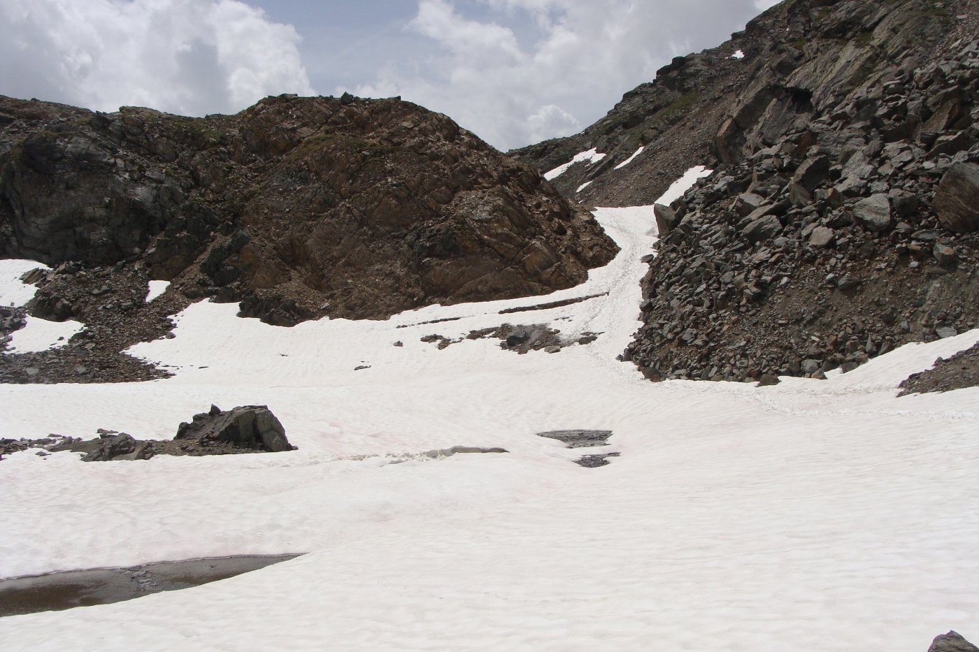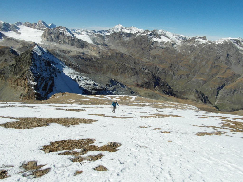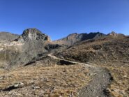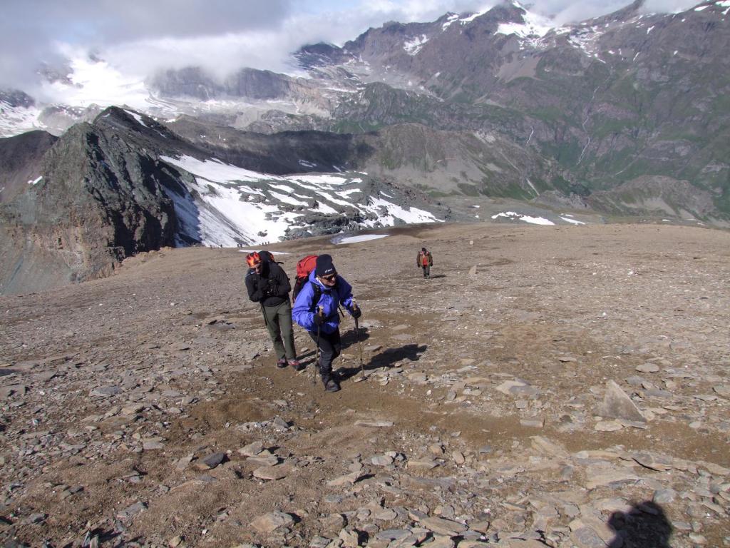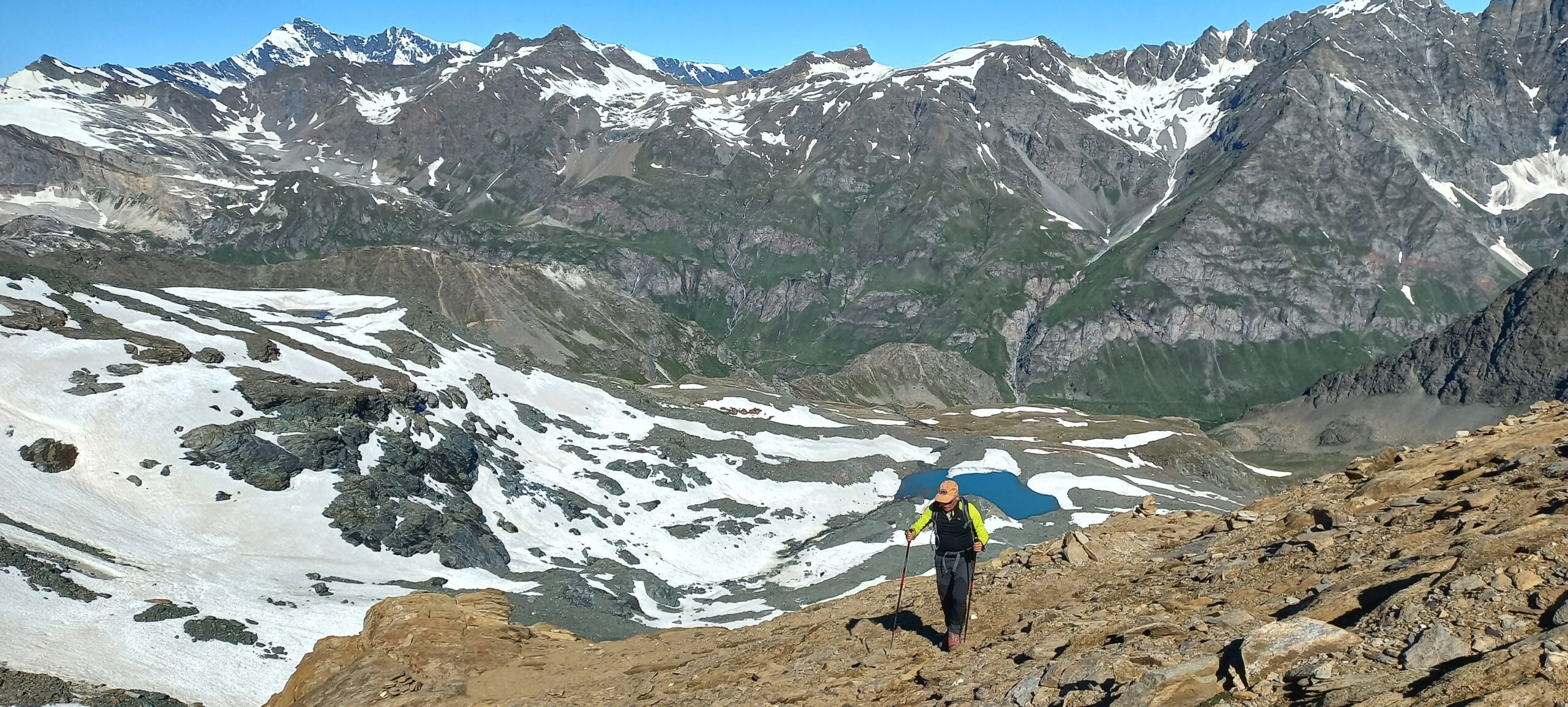 Dal colle ci si tiene sul versante ovest (valle di Rhemes) fino a un colletto panoramico. Evitare le varie tracce che piegano a destra prima, perchè tutte più difficoltose di quella segnata.