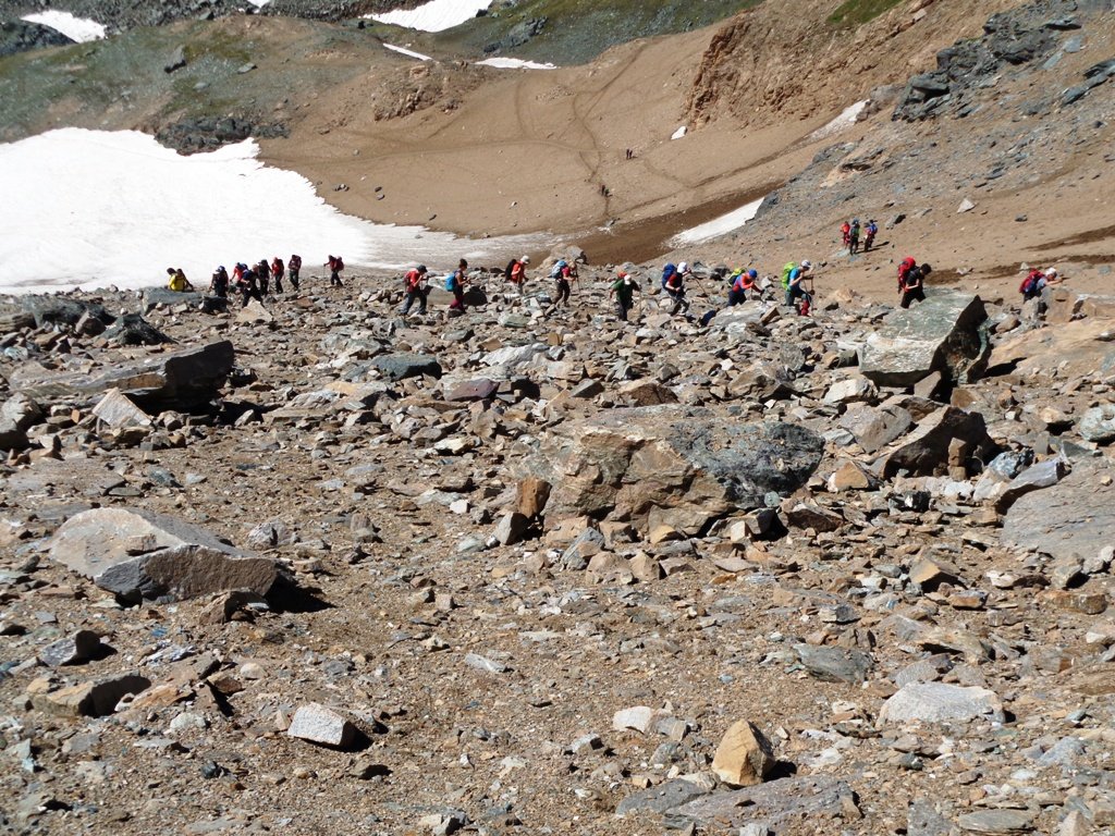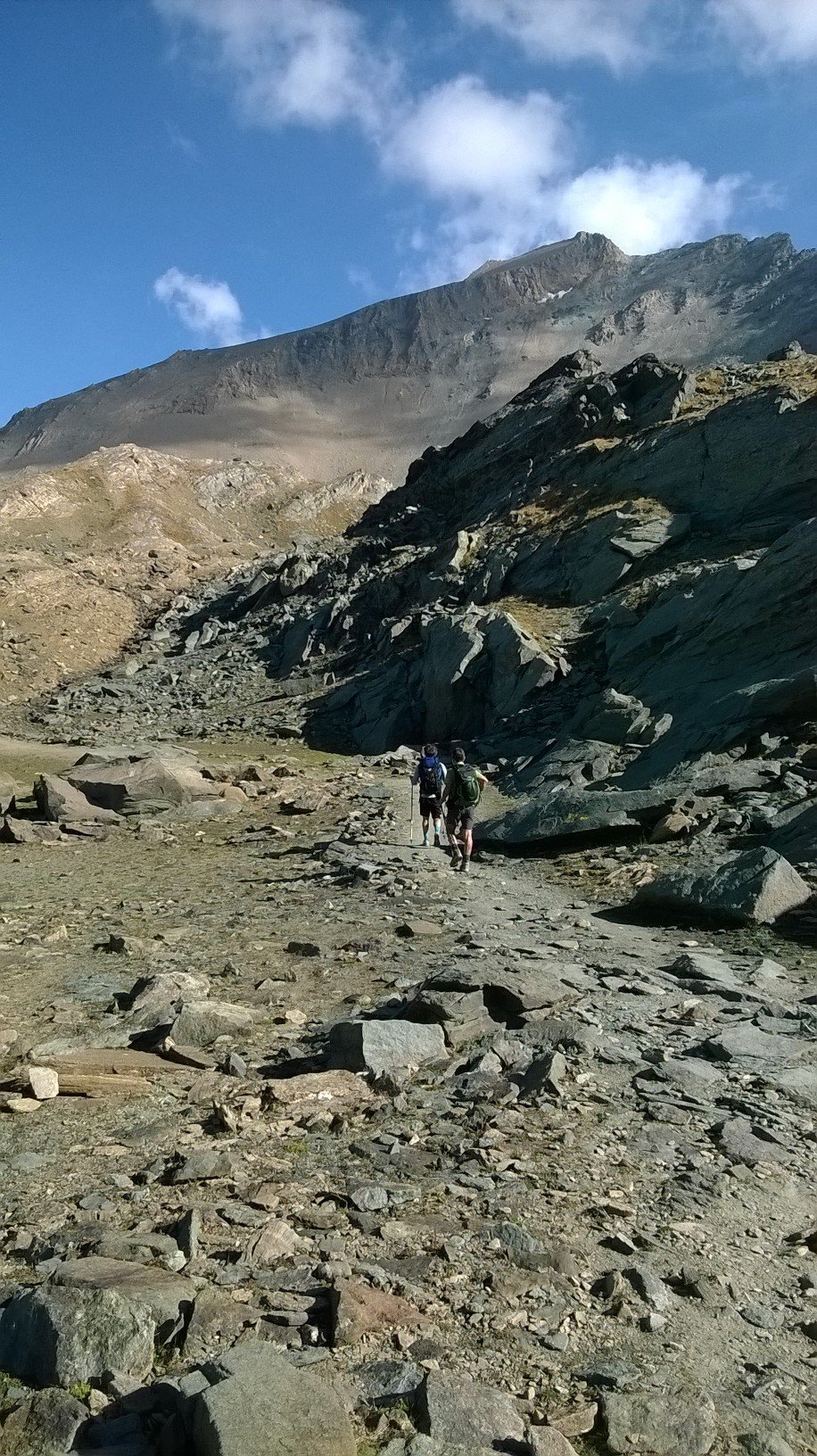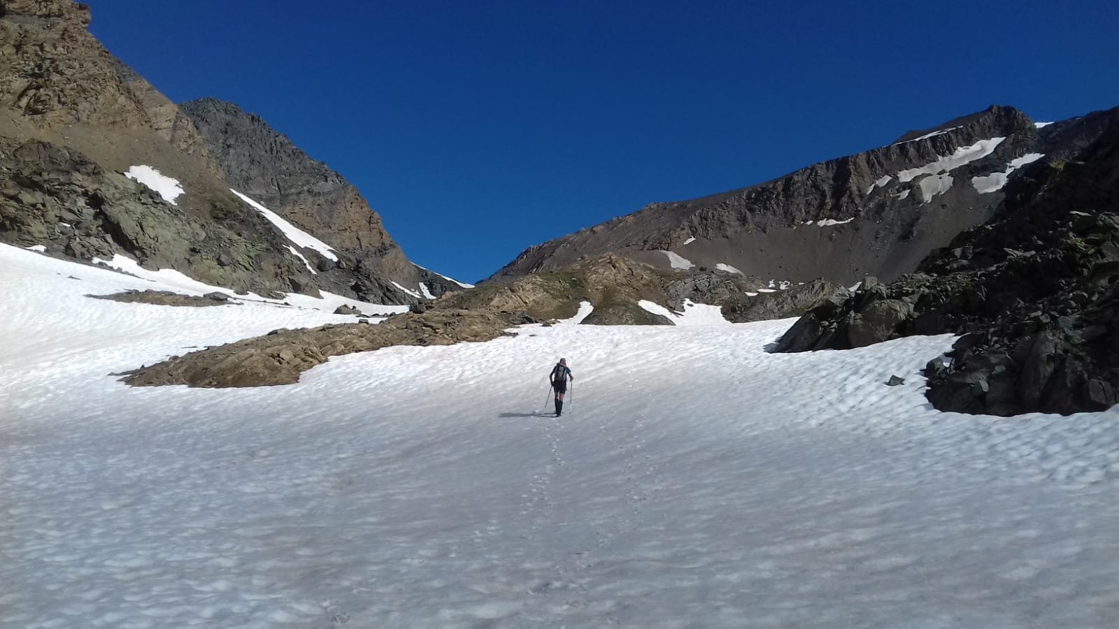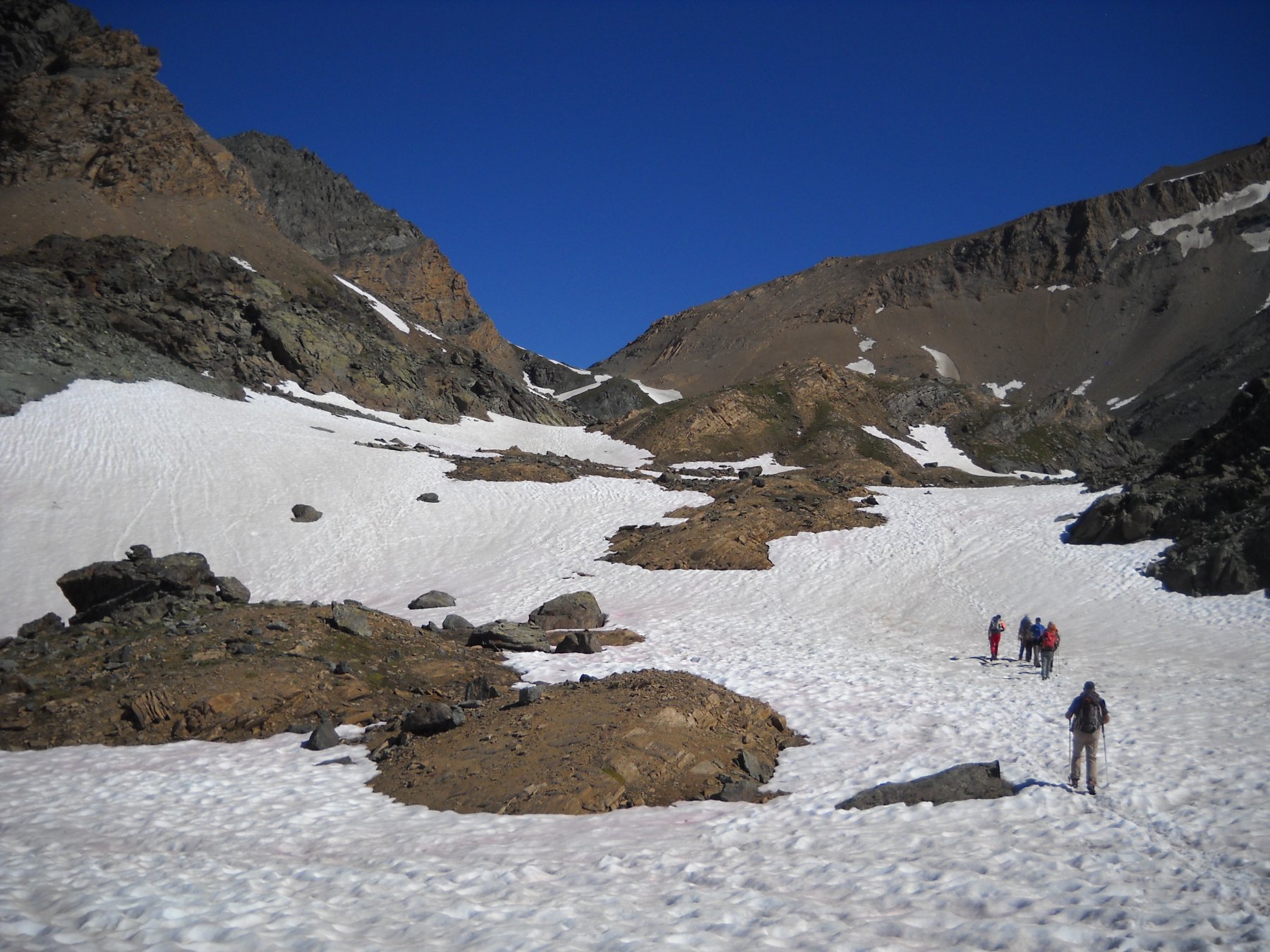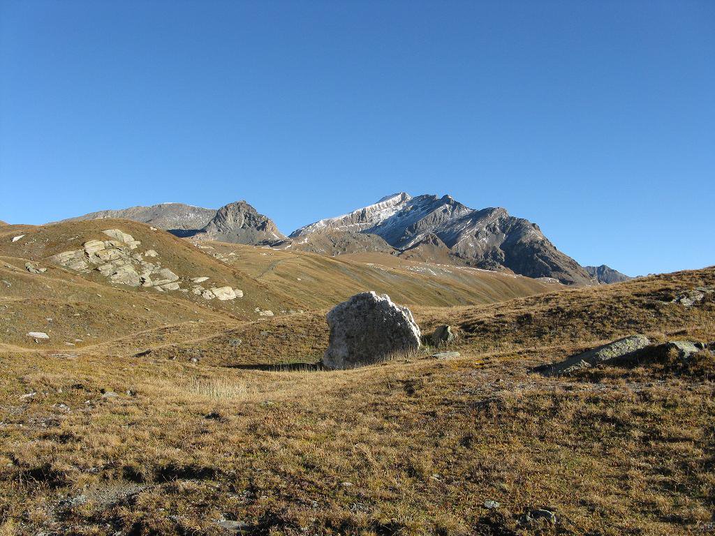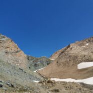 Dal colle ci si tiene sul versante ovest (valle di Rhemes) fino a un colletto panoramico. Evitare le varie tracce che piegano a destra prima, perchè tutte più difficoltose di quella segnata.