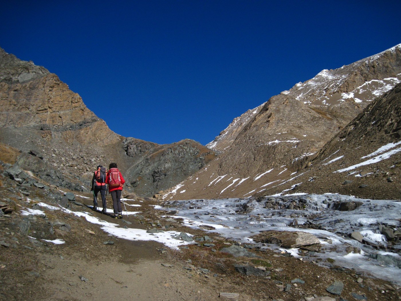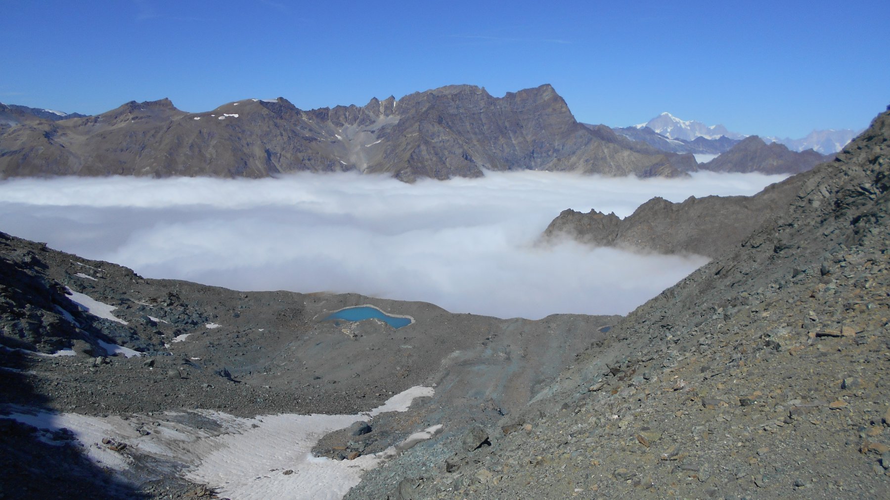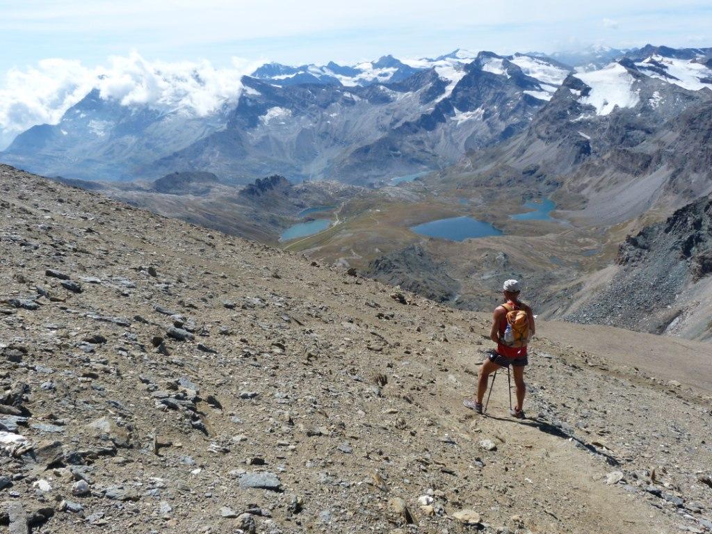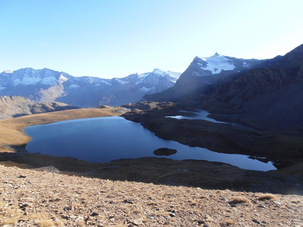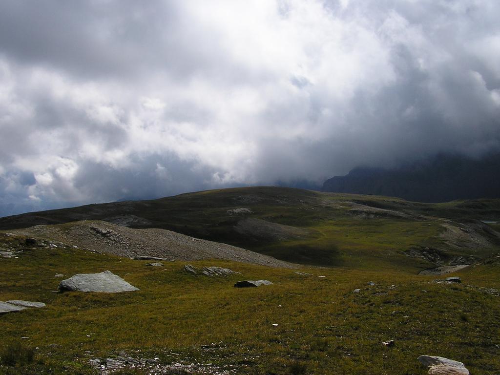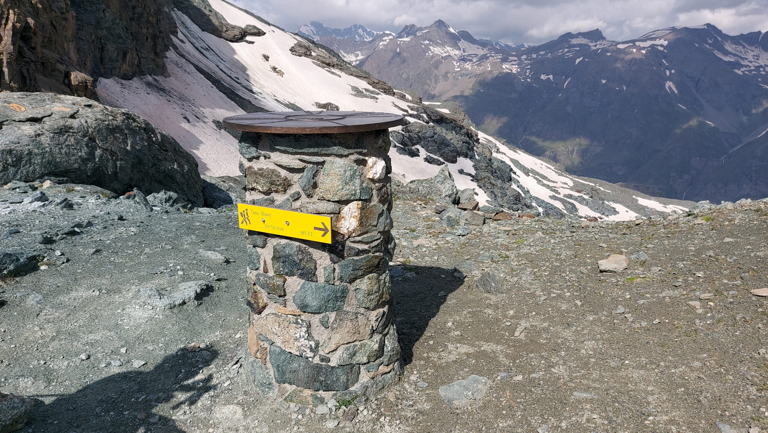 Dal colle ci si tiene sul versante ovest (valle di Rhemes) fino a un colletto panoramico. Evitare le varie tracce che piegano a destra prima, perchè tutte più difficoltose di quella segnata.