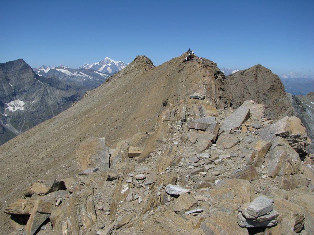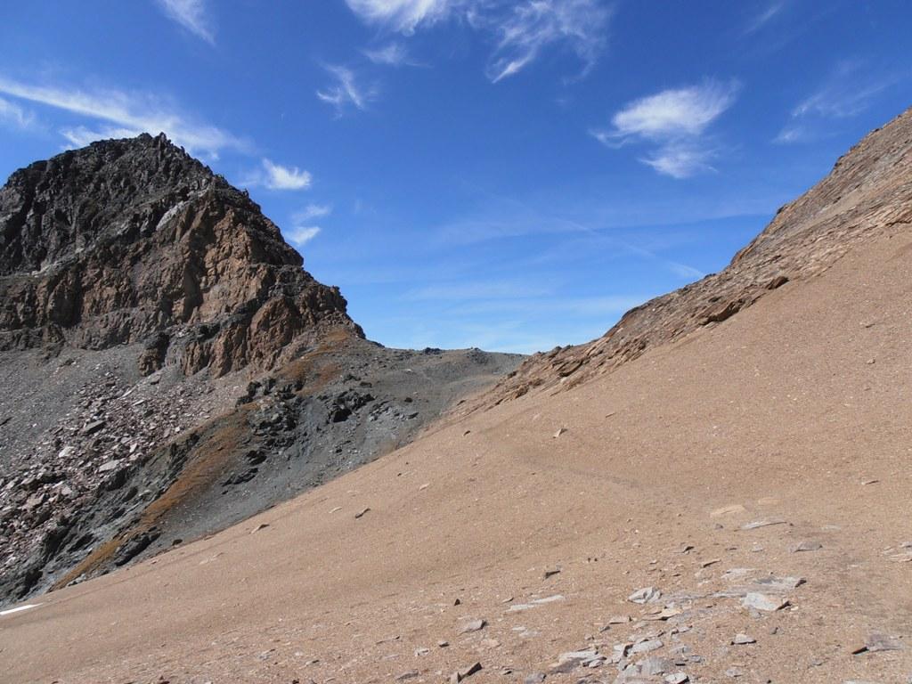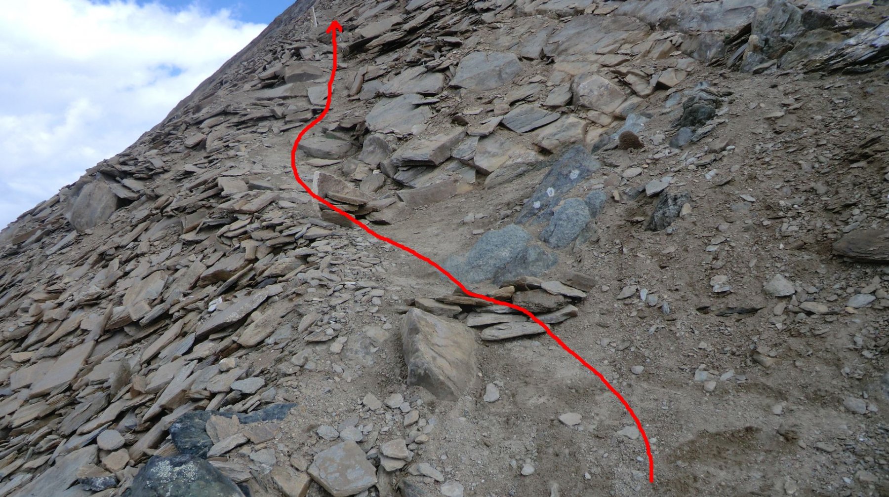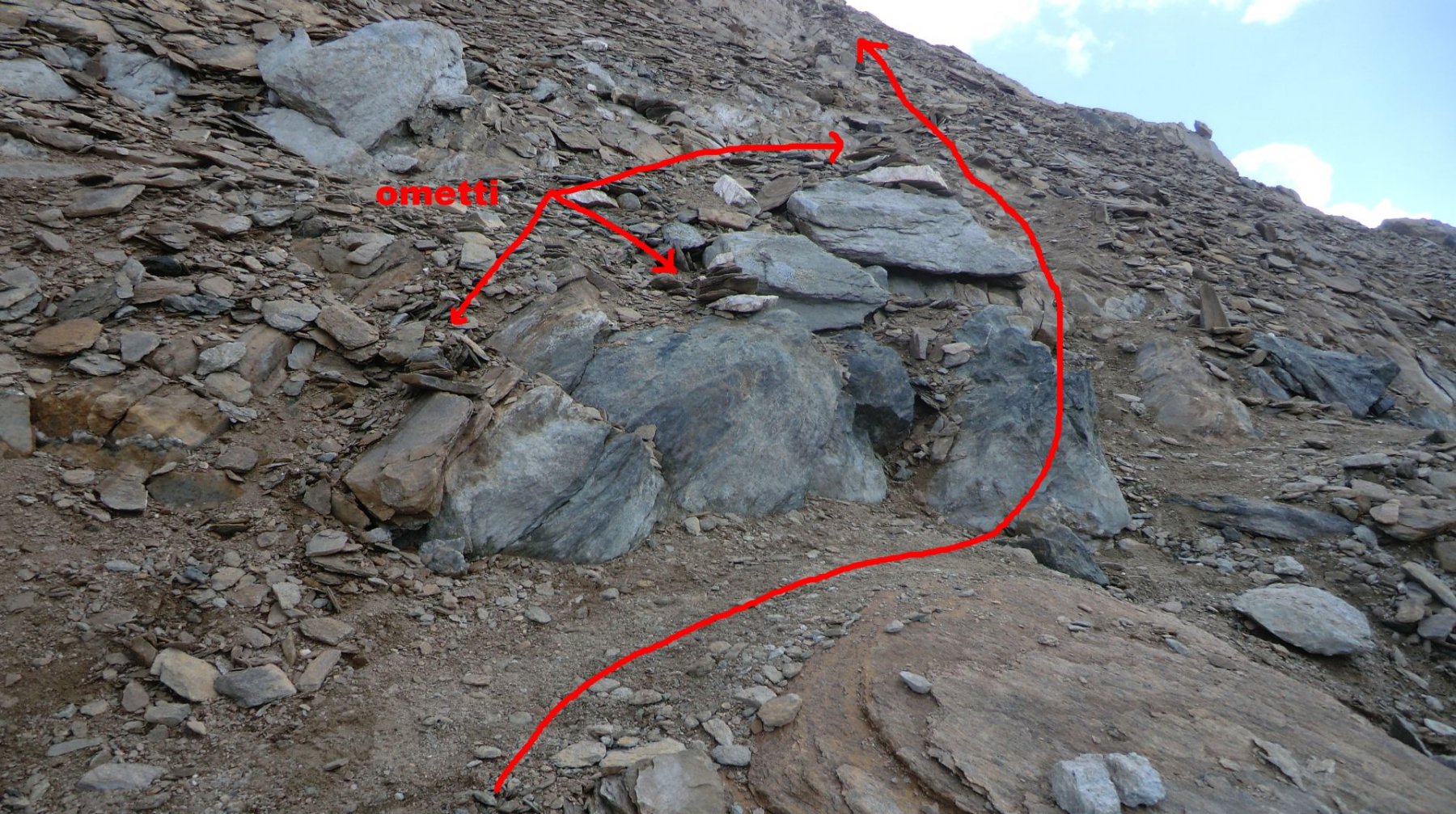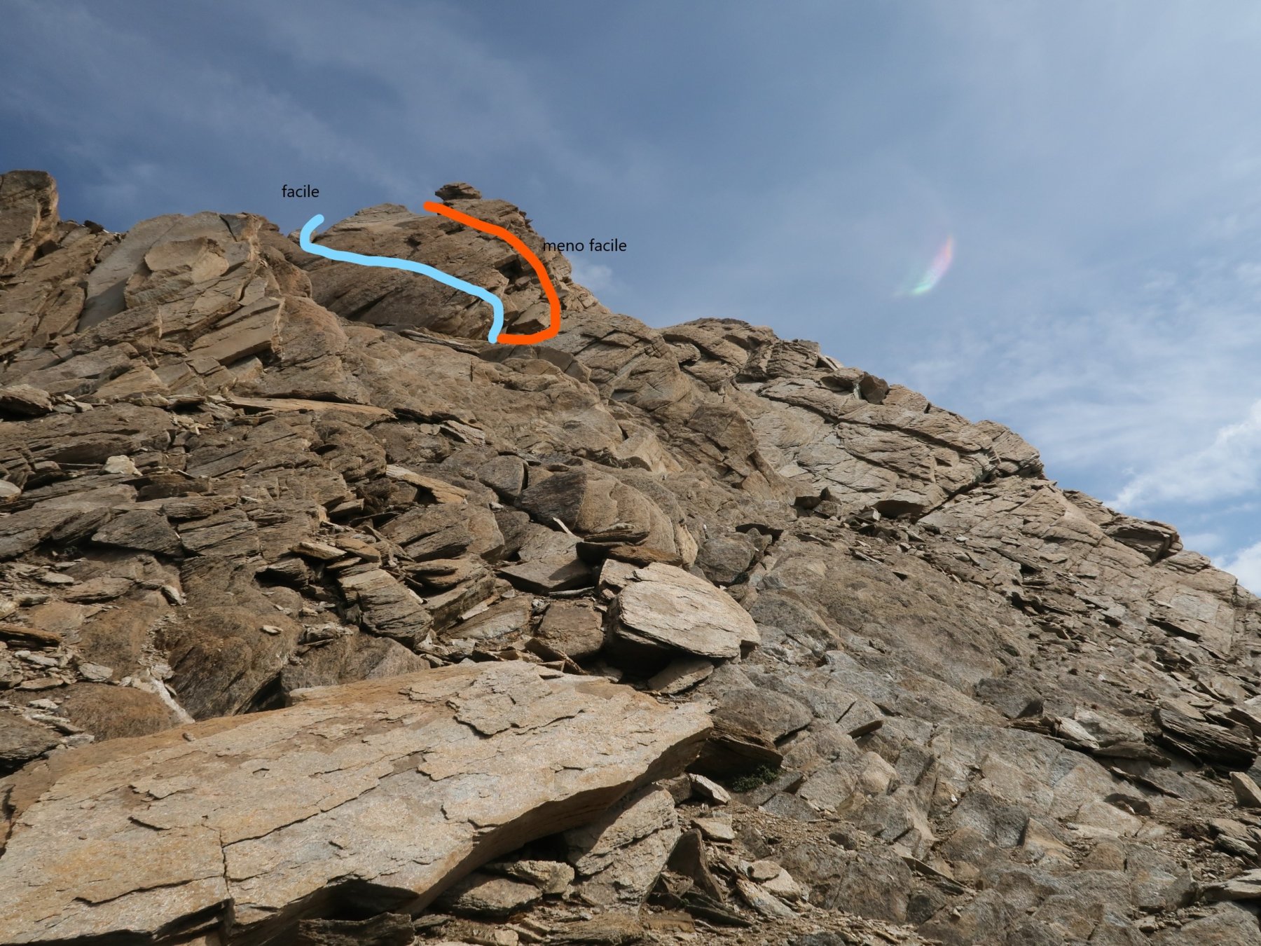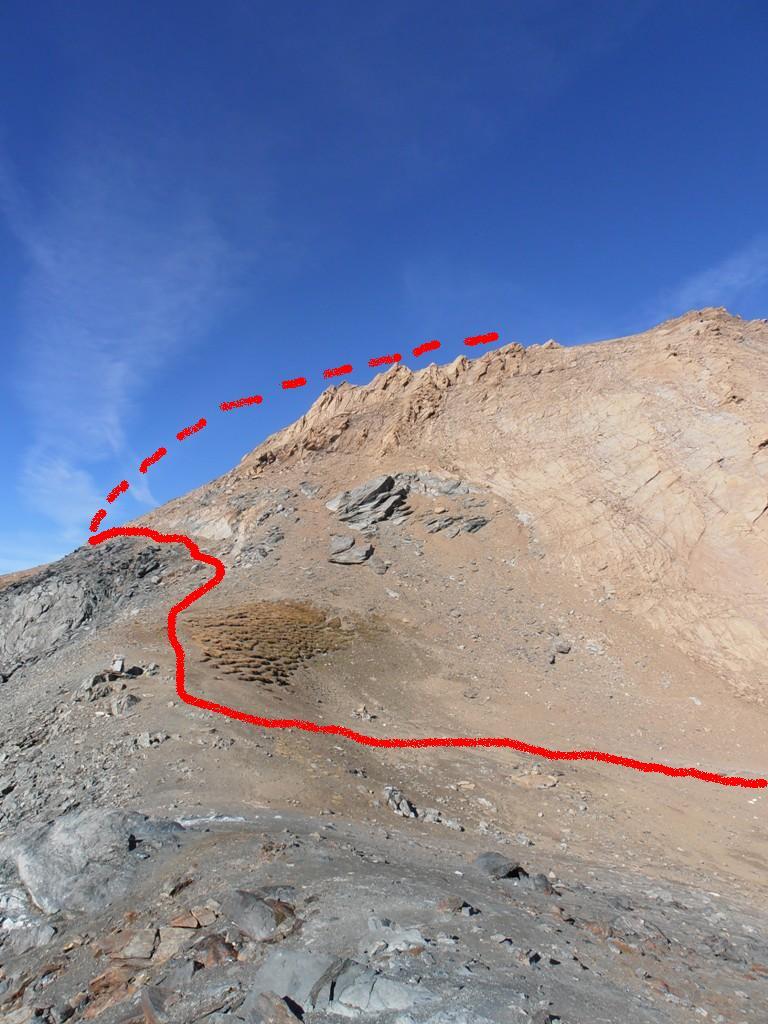 Dal colletto piegare a dx e salire su traccia ripidissima e sfasciumi (ometti). Si giunge ad un punto dove la traccia è sbarrata da un grosso ometto. Qui piegare a destra e salire su una cengia inclinata, ma con buoni appigli, molto breve. Si esce e quasi subito la pendenza si abbatte e si prosegue su buona traccia indicata da ometti sul terreno di sfasciumi. Il sentiero prima va a nord, con grande vista sul Monte Bianco, poi piega verso sud-est salendo con pendenze non eccessive. Ultimo tratto, di nuovo verso nord, più ripido.