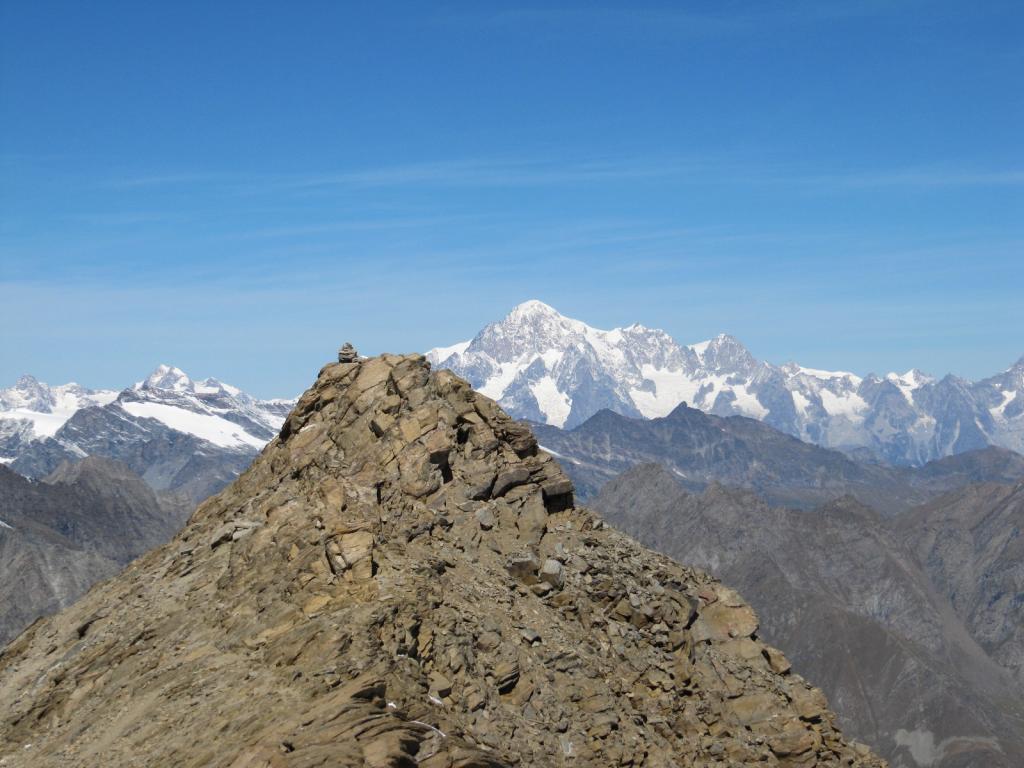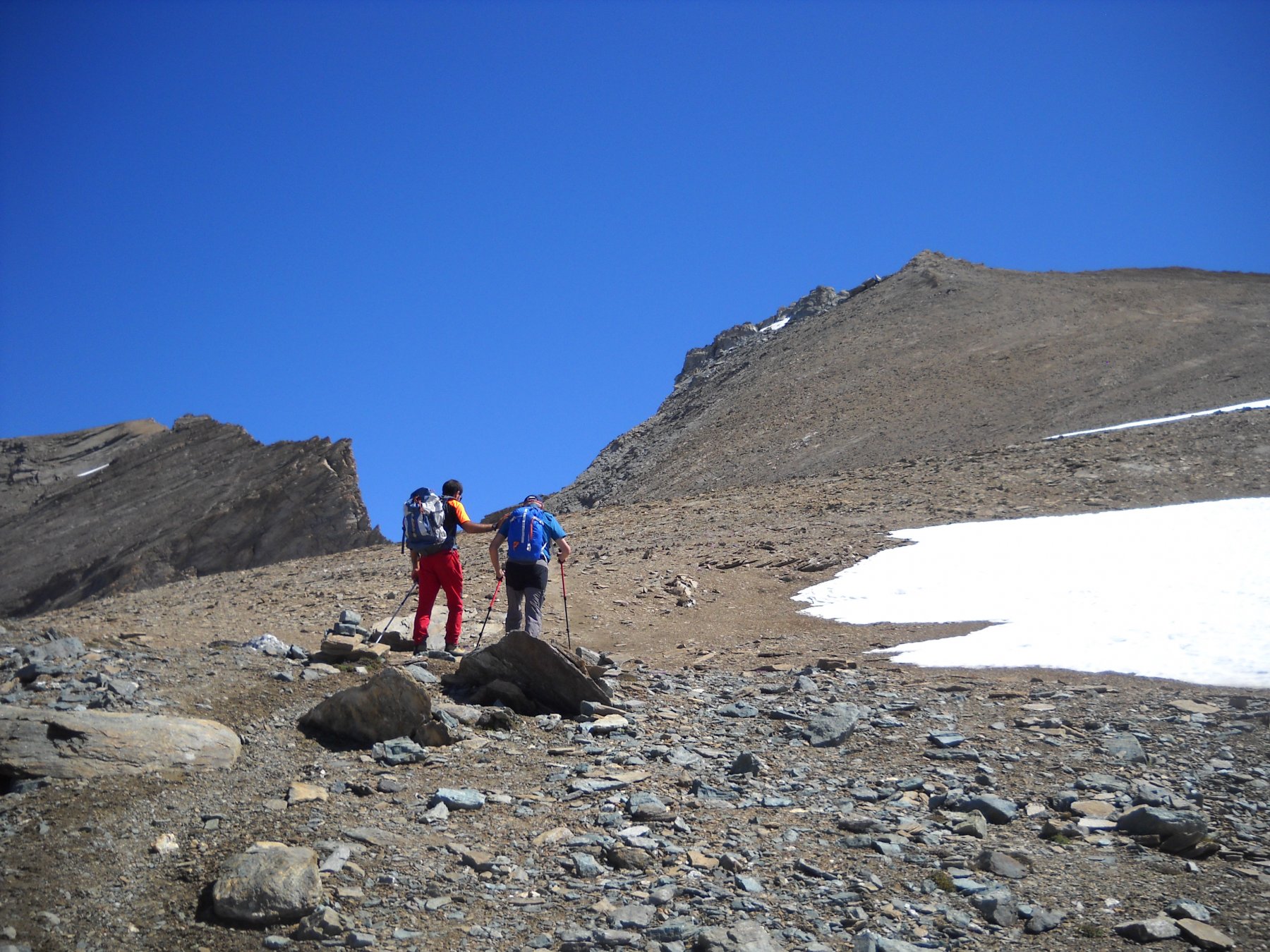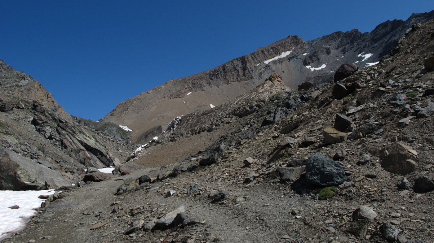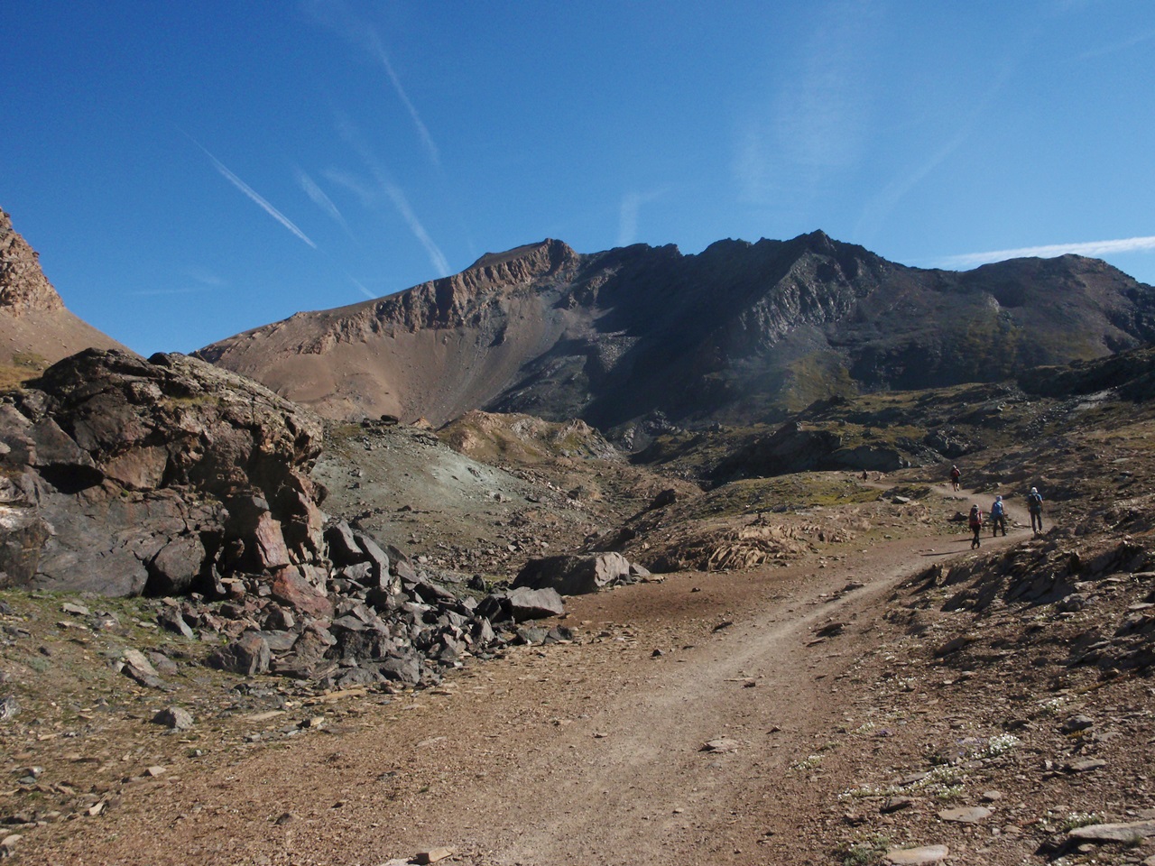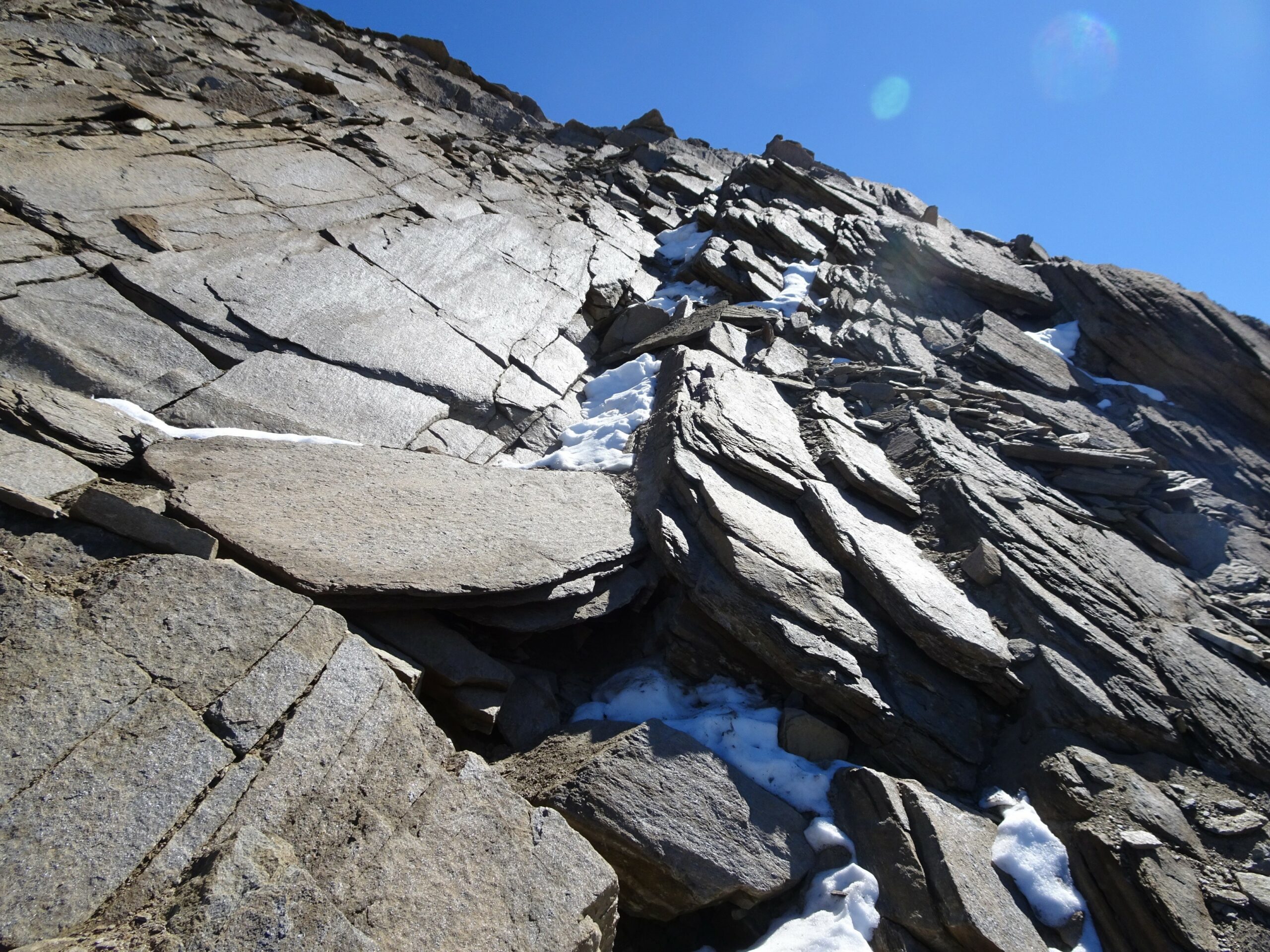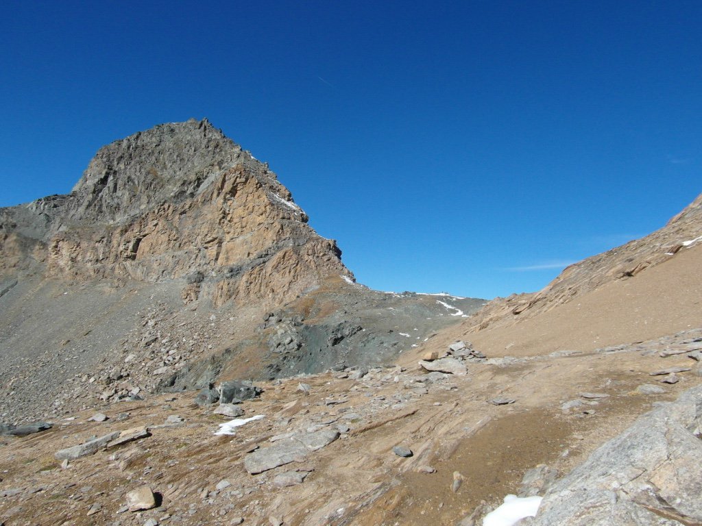 Dal colletto piegare a dx e salire su traccia ripidissima e sfasciumi (ometti). Si giunge ad un punto dove la traccia è sbarrata da un grosso ometto. Qui piegare a destra e salire su una cengia inclinata, ma con buoni appigli, molto breve. Si esce e quasi subito la pendenza si abbatte e si prosegue su buona traccia indicata da ometti sul terreno di sfasciumi. Il sentiero prima va a nord, con grande vista sul Monte Bianco, poi piega verso sud-est salendo con pendenze non eccessive. Ultimo tratto, di nuovo verso nord, più ripido.