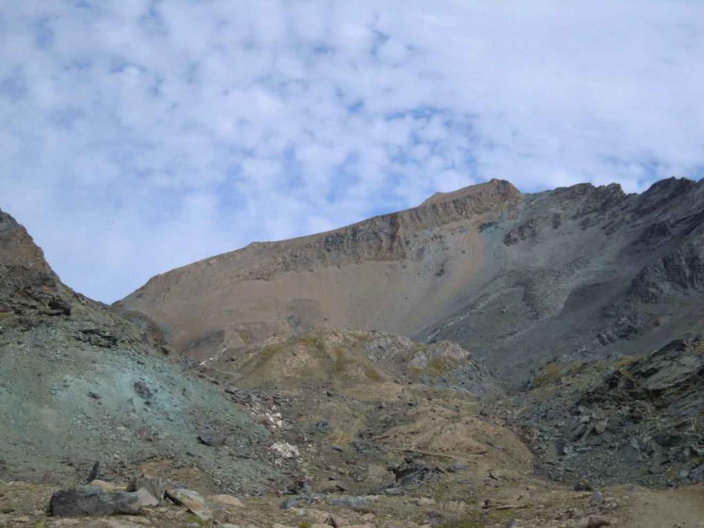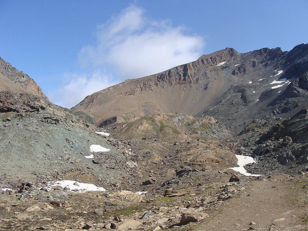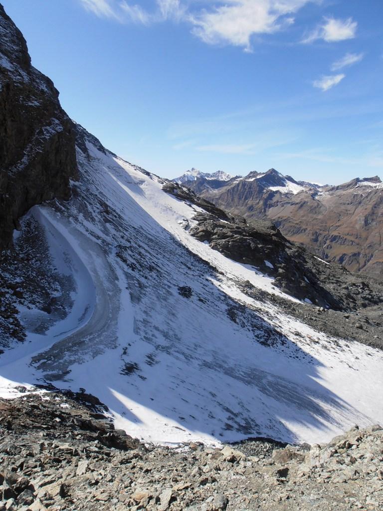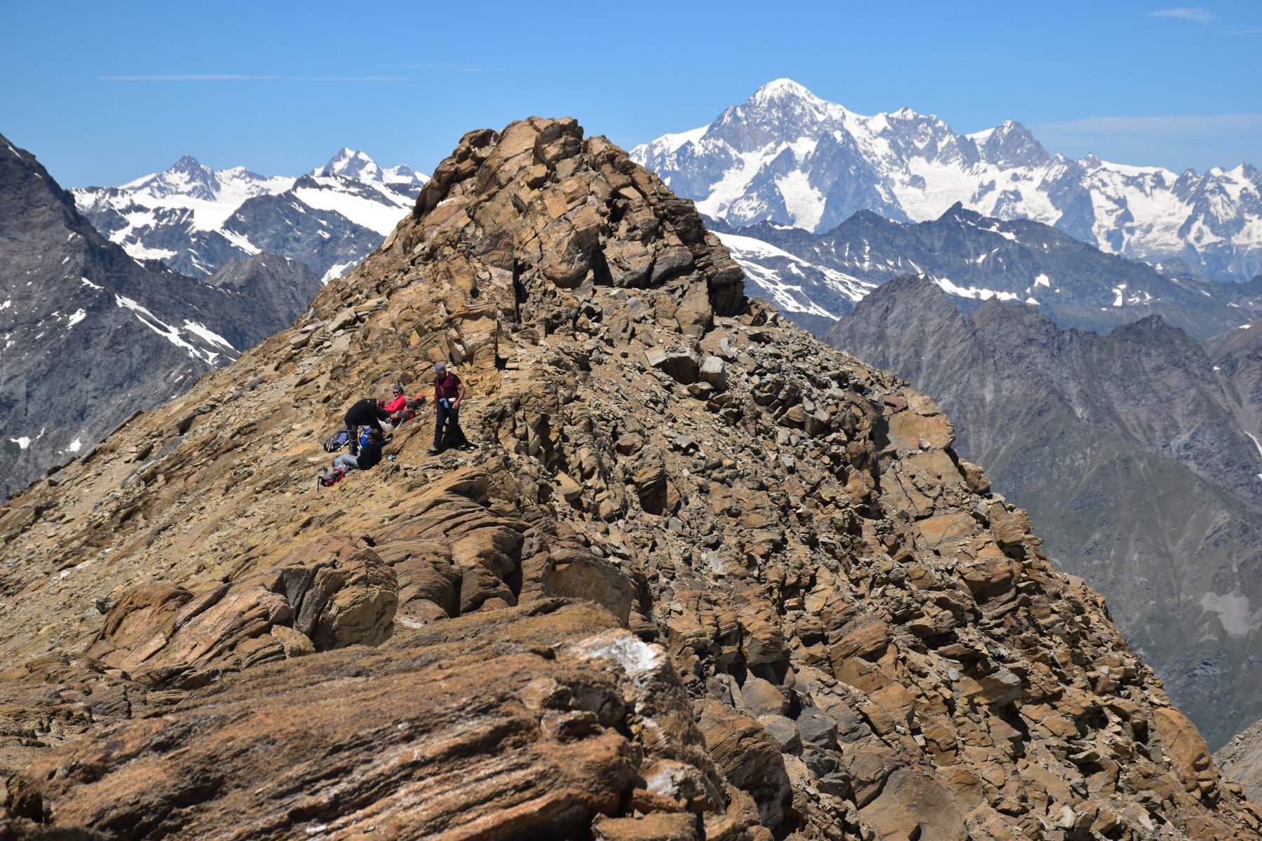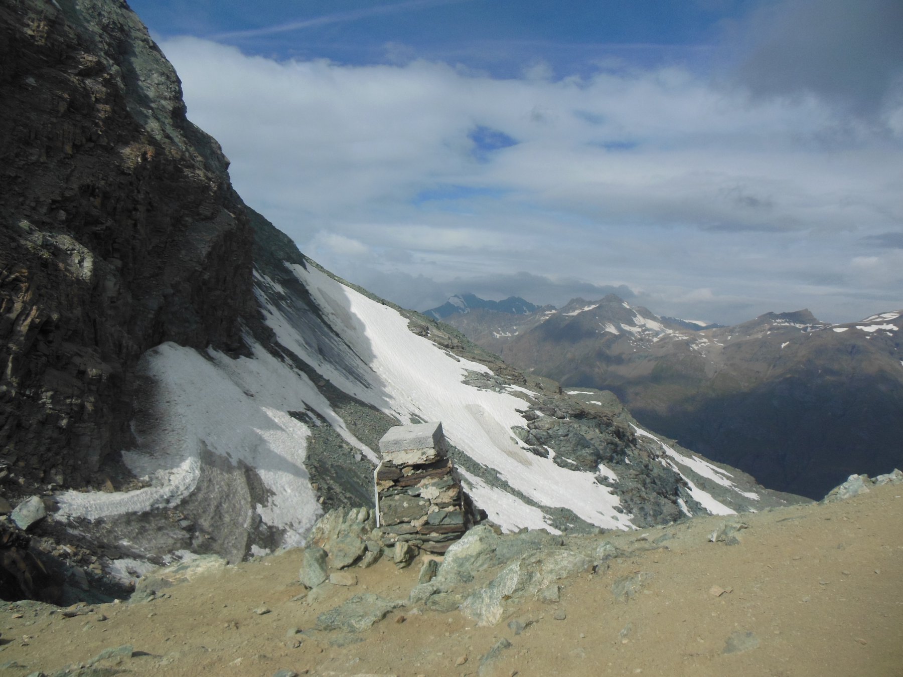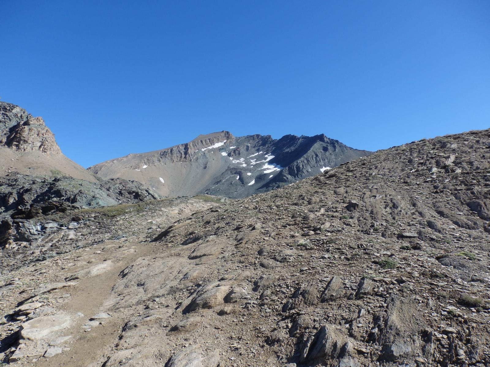 Dal colletto piegare a dx e salire su traccia ripidissima e sfasciumi (ometti). Si giunge ad un punto dove la traccia è sbarrata da un grosso ometto. Qui piegare a destra e salire su una cengia inclinata, ma con buoni appigli, molto breve. Si esce e quasi subito la pendenza si abbatte e si prosegue su buona traccia indicata da ometti sul terreno di sfasciumi. Il sentiero prima va a nord, con grande vista sul Monte Bianco, poi piega verso sud-est salendo con pendenze non eccessive. Ultimo tratto, di nuovo verso nord, più ripido.