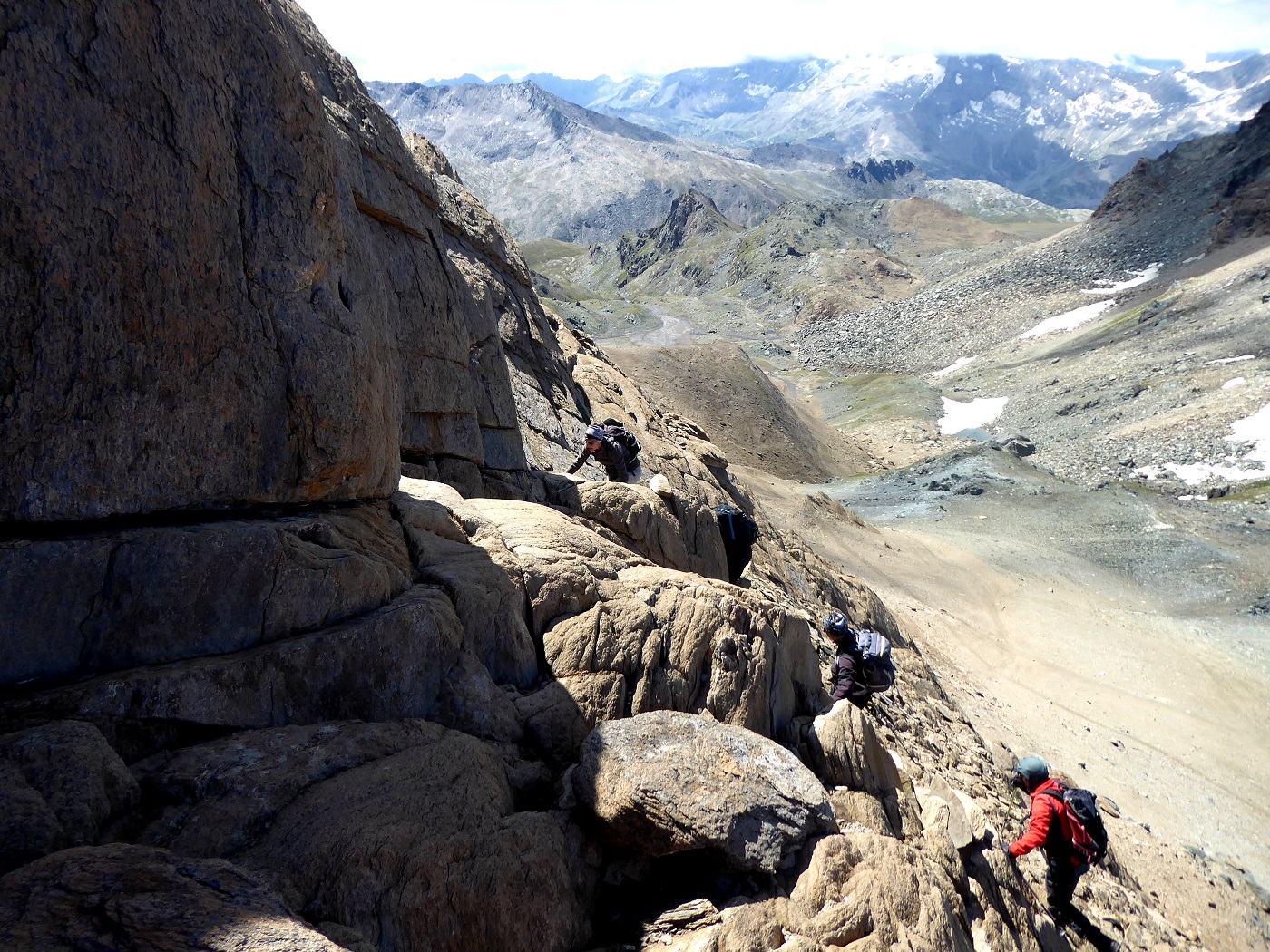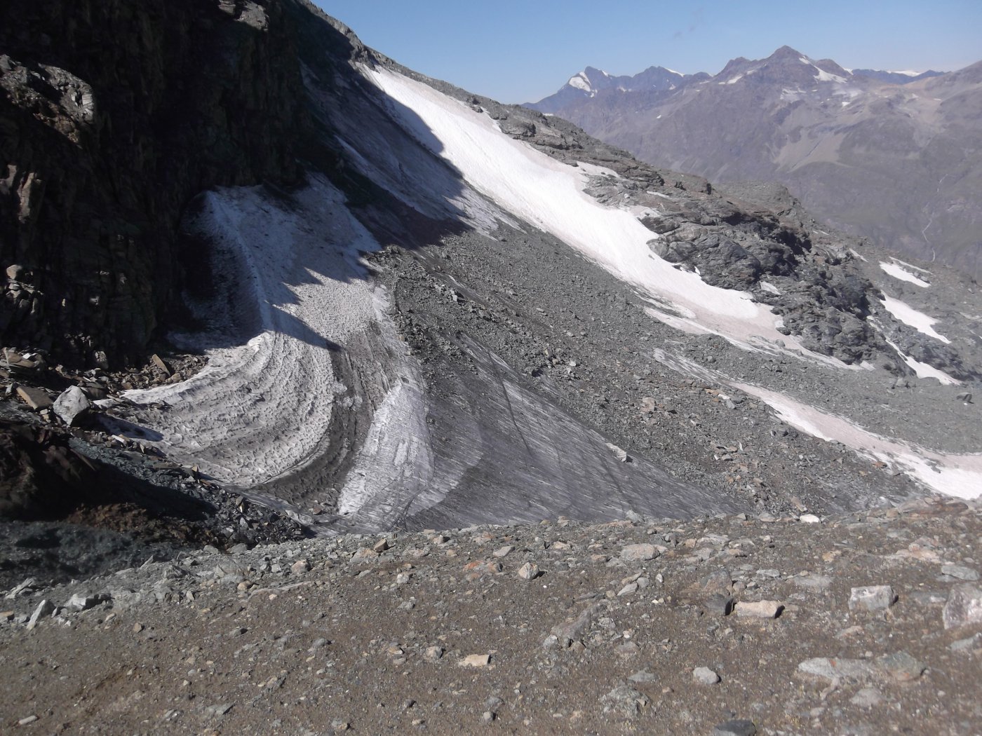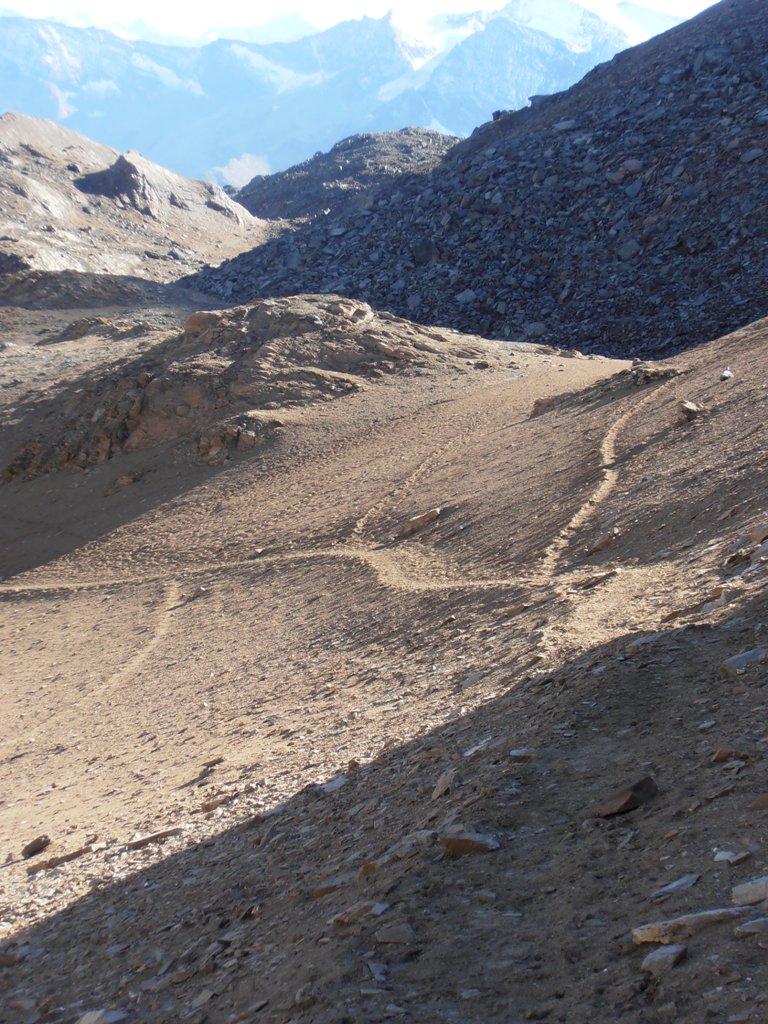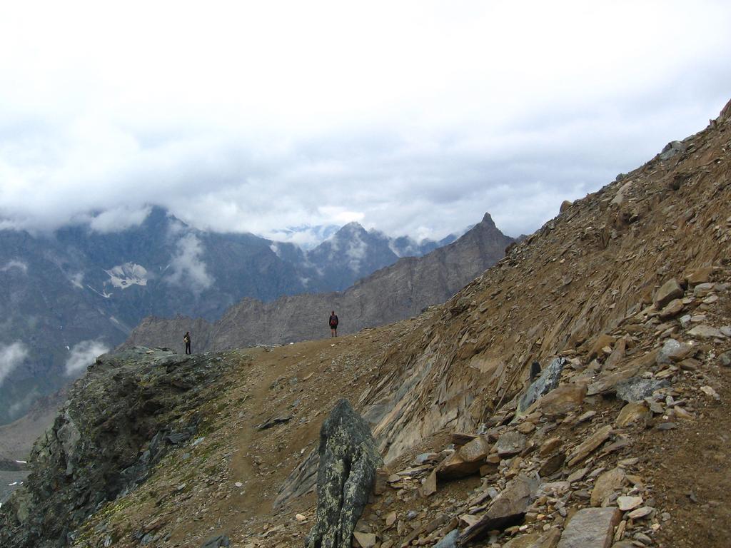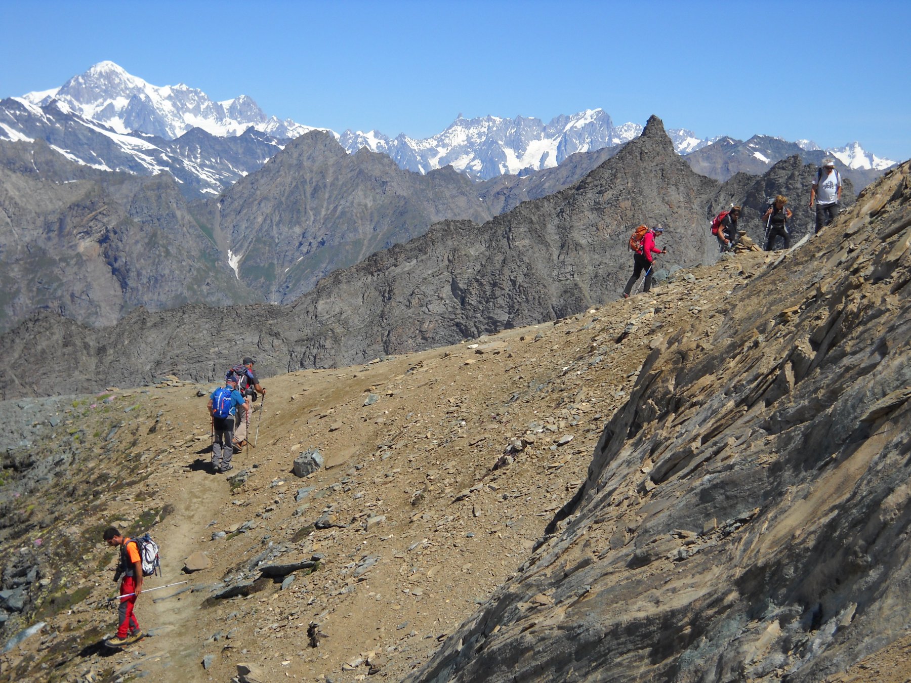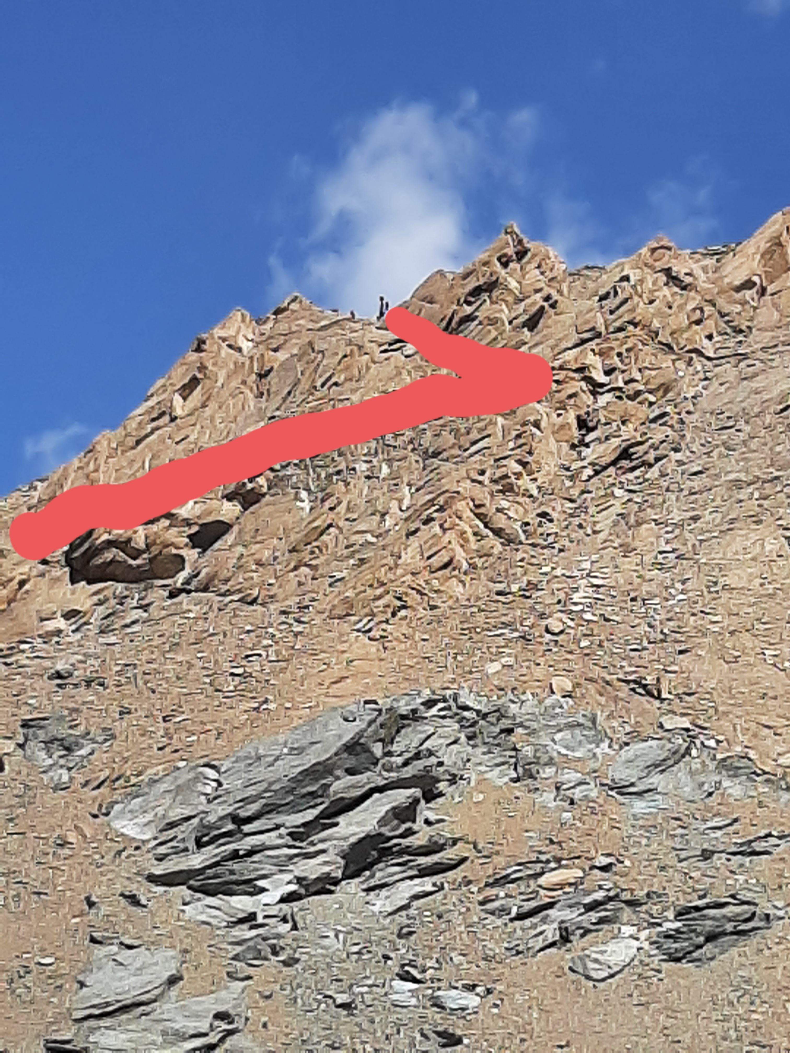 Dal colletto piegare a dx e salire su traccia ripidissima e sfasciumi (ometti). Si giunge ad un punto dove la traccia è sbarrata da un grosso ometto. Qui piegare a destra e salire su una cengia inclinata, ma con buoni appigli, molto breve. Si esce e quasi subito la pendenza si abbatte e si prosegue su buona traccia indicata da ometti sul terreno di sfasciumi. Il sentiero prima va a nord, con grande vista sul Monte Bianco, poi piega verso sud-est salendo con pendenze non eccessive. Ultimo tratto, di nuovo verso nord, più ripido.