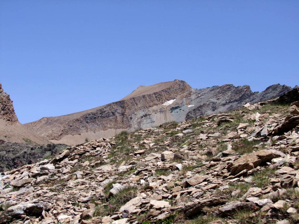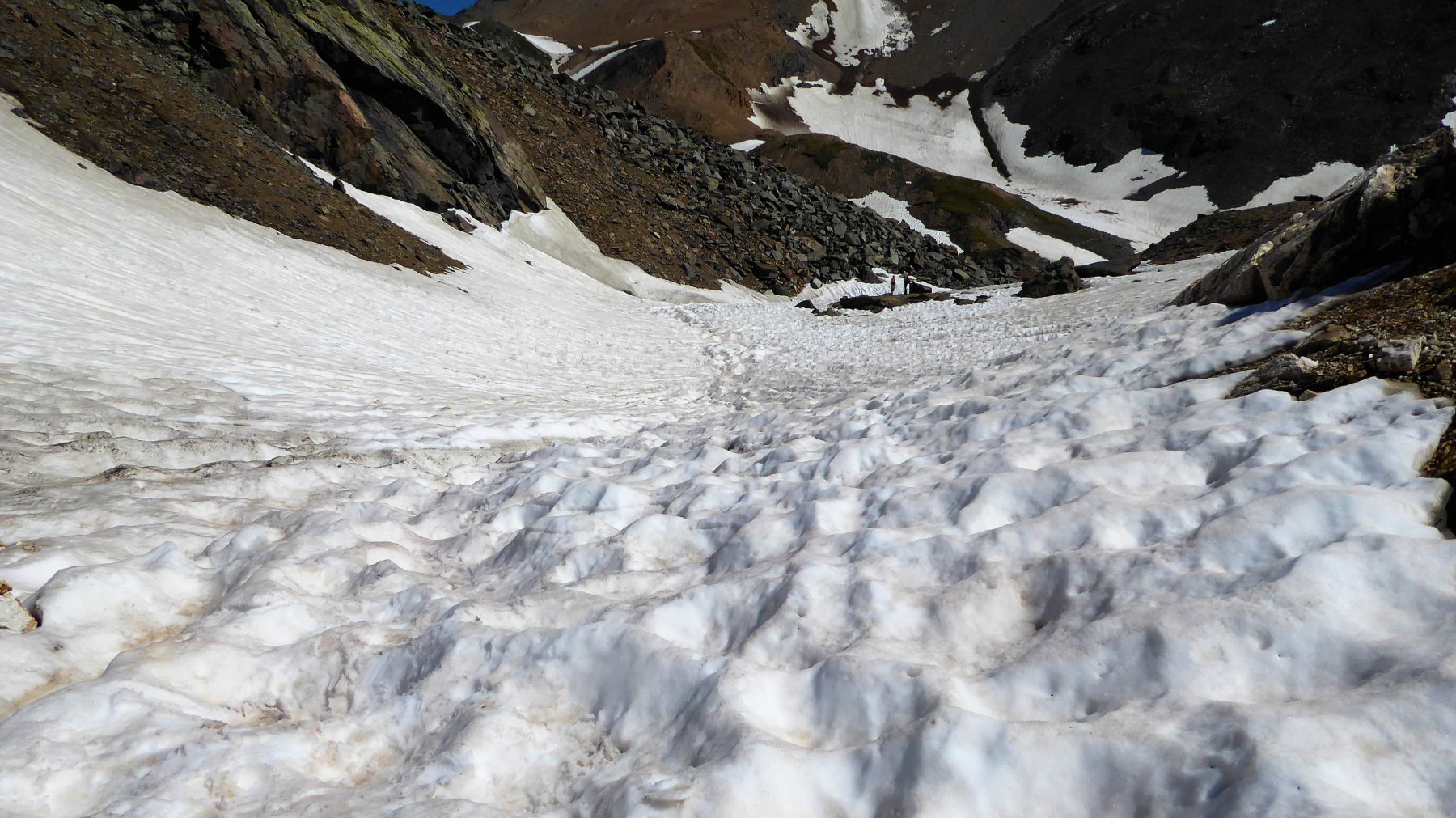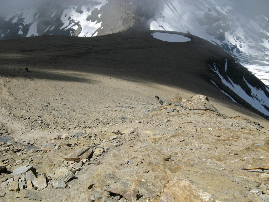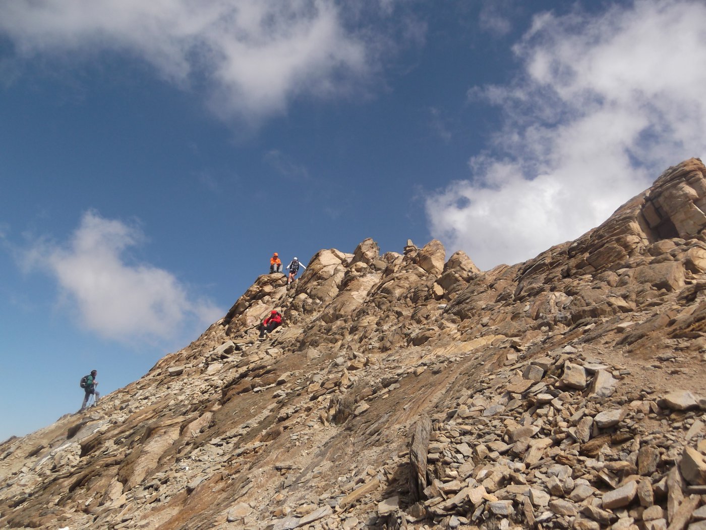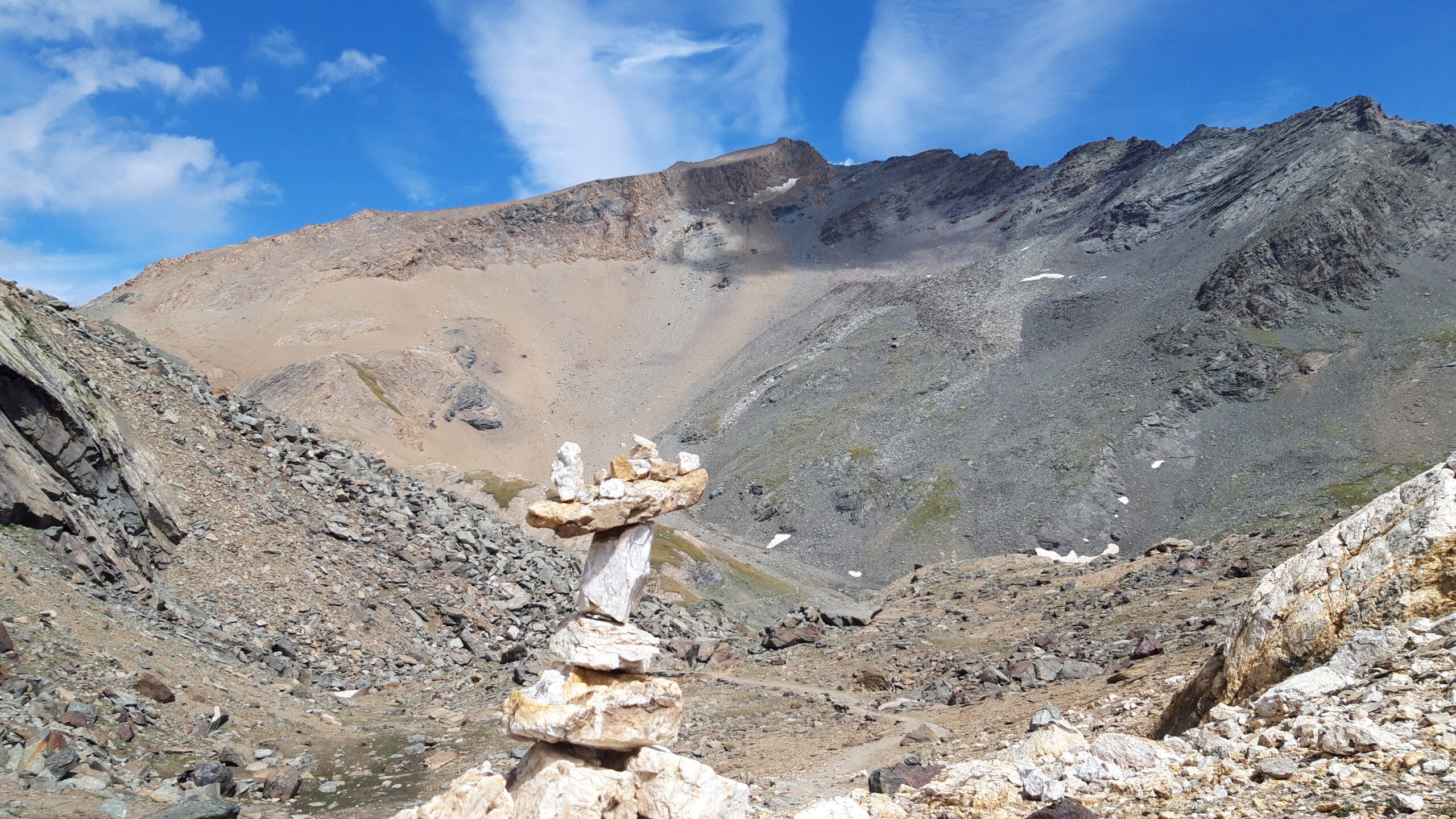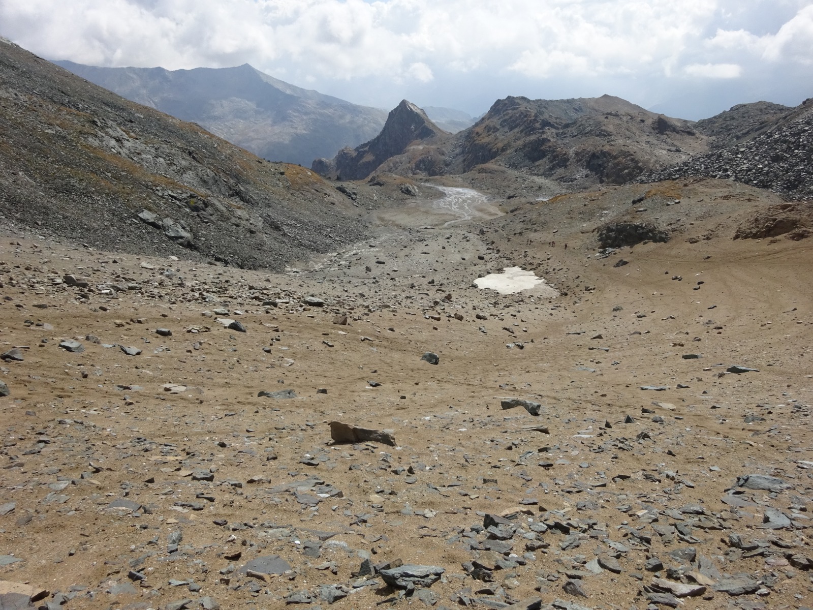 Dal colletto piegare a dx e salire su traccia ripidissima e sfasciumi (ometti). Si giunge ad un punto dove la traccia è sbarrata da un grosso ometto. Qui piegare a destra e salire su una cengia inclinata, ma con buoni appigli, molto breve. Si esce e quasi subito la pendenza si abbatte e si prosegue su buona traccia indicata da ometti sul terreno di sfasciumi. Il sentiero prima va a nord, con grande vista sul Monte Bianco, poi piega verso sud-est salendo con pendenze non eccessive. Ultimo tratto, di nuovo verso nord, più ripido.
