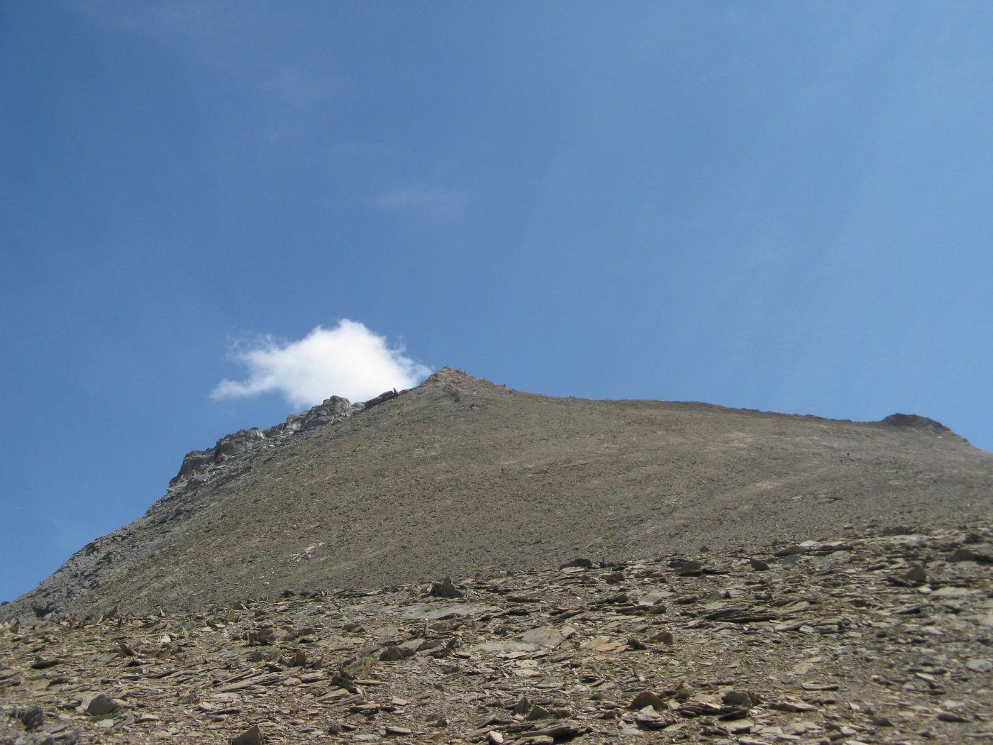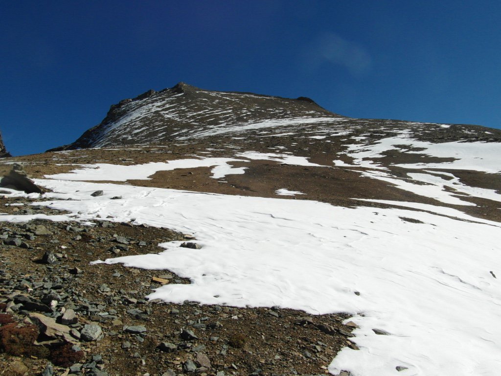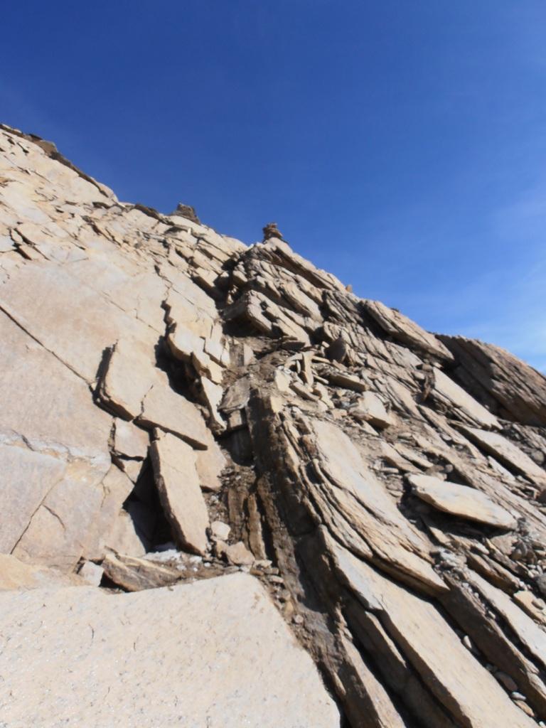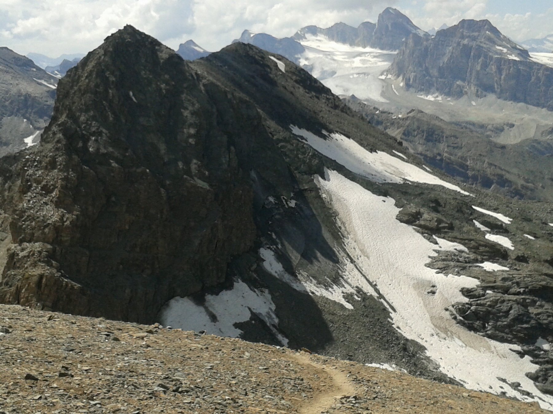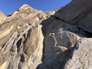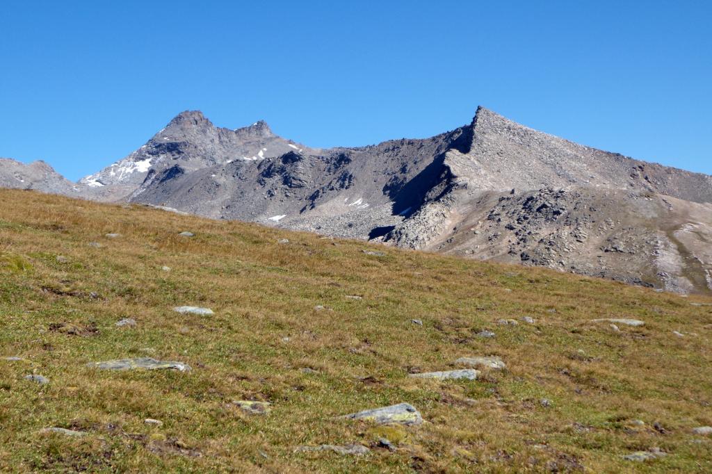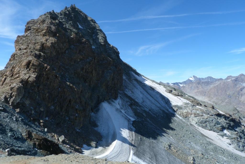 Dal colletto piegare a dx e salire su traccia ripidissima e sfasciumi (ometti). Si giunge ad un punto dove la traccia è sbarrata da un grosso ometto. Qui piegare a destra e salire su una cengia inclinata, ma con buoni appigli, molto breve. Si esce e quasi subito la pendenza si abbatte e si prosegue su buona traccia indicata da ometti sul terreno di sfasciumi. Il sentiero prima va a nord, con grande vista sul Monte Bianco, poi piega verso sud-est salendo con pendenze non eccessive. Ultimo tratto, di nuovo verso nord, più ripido.