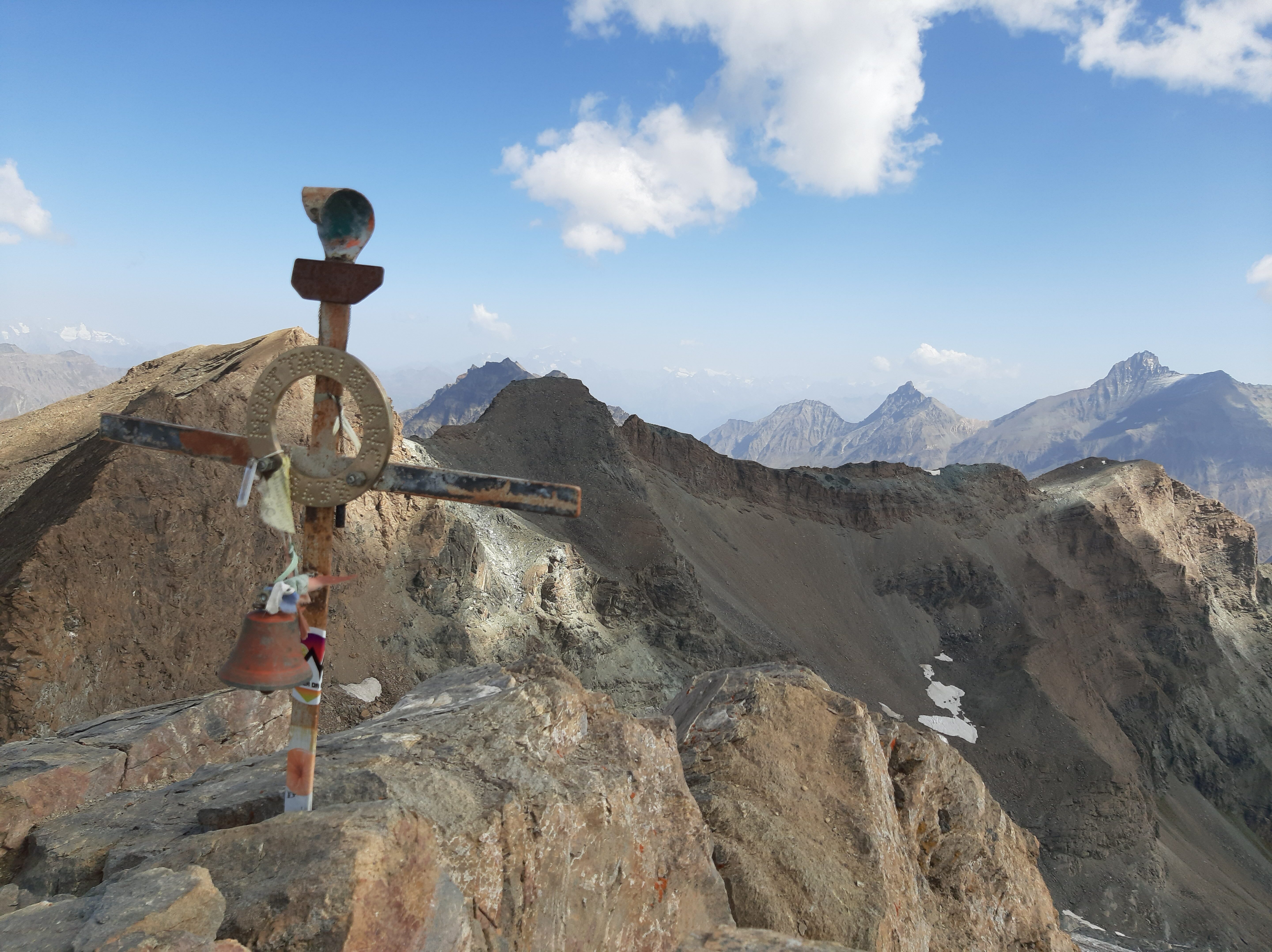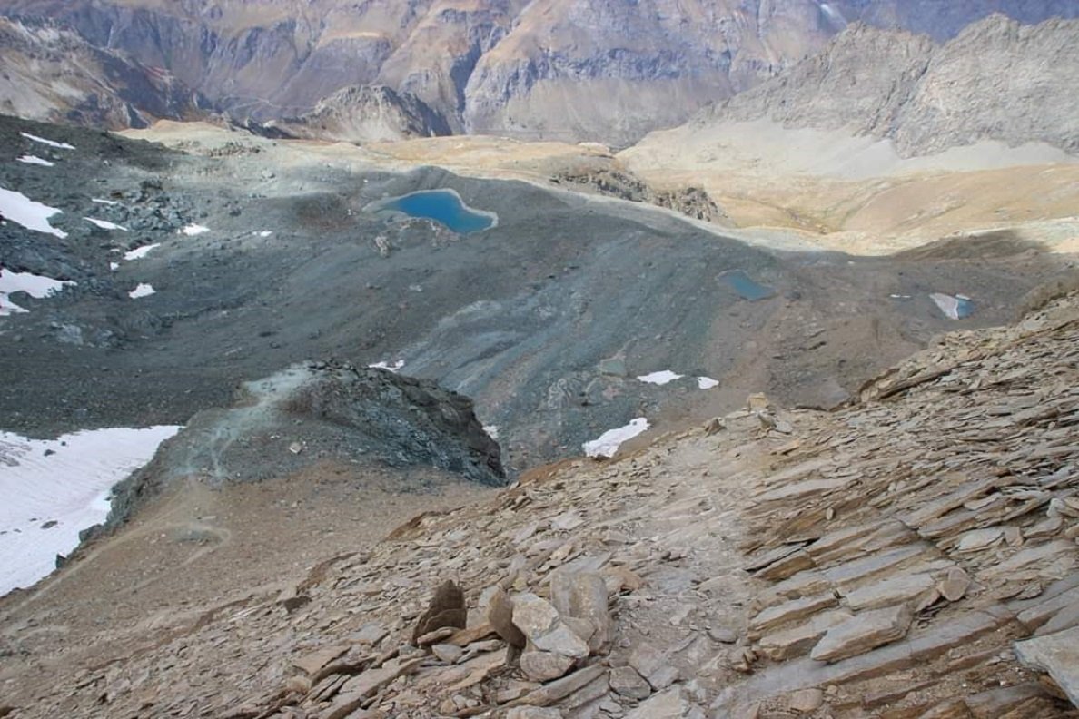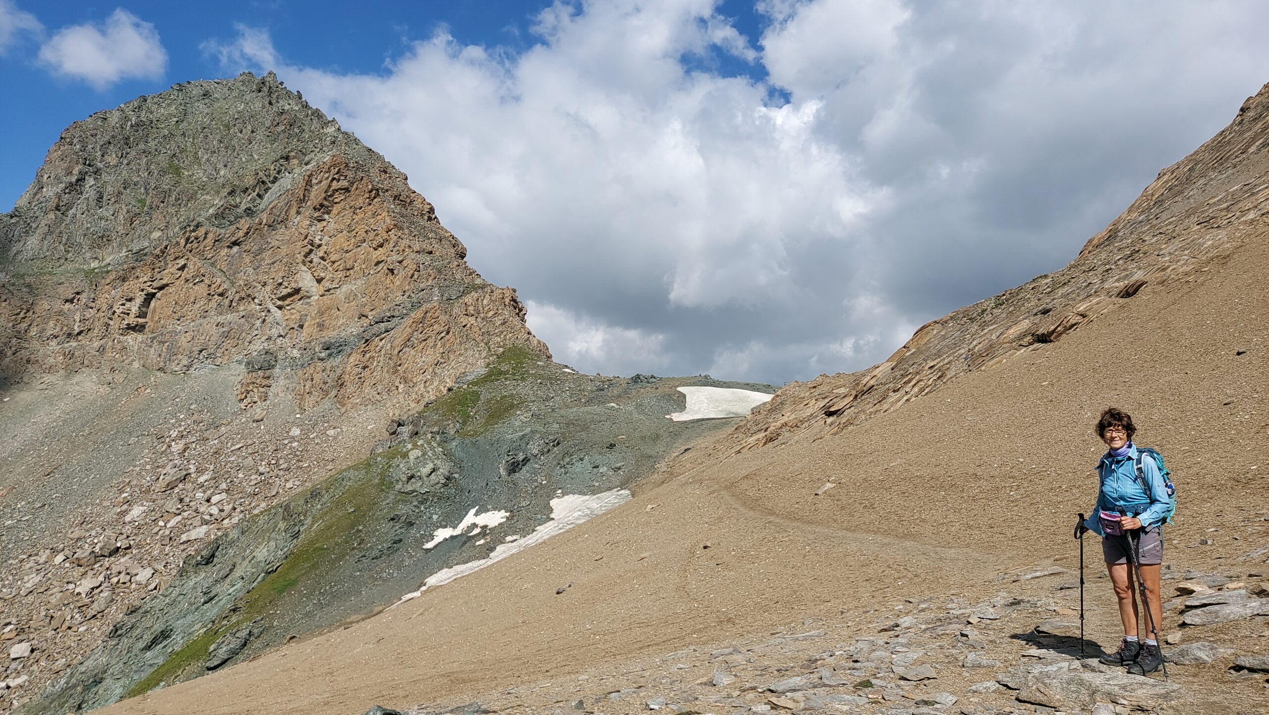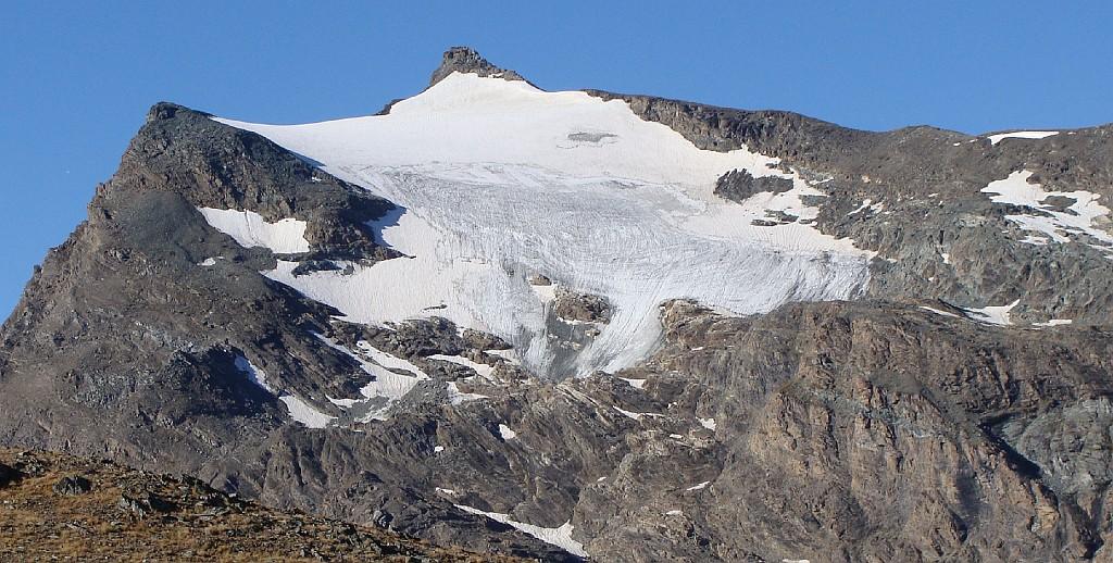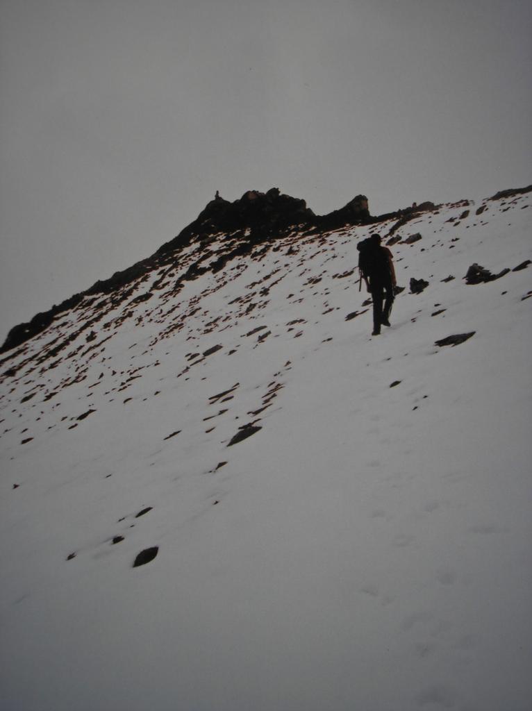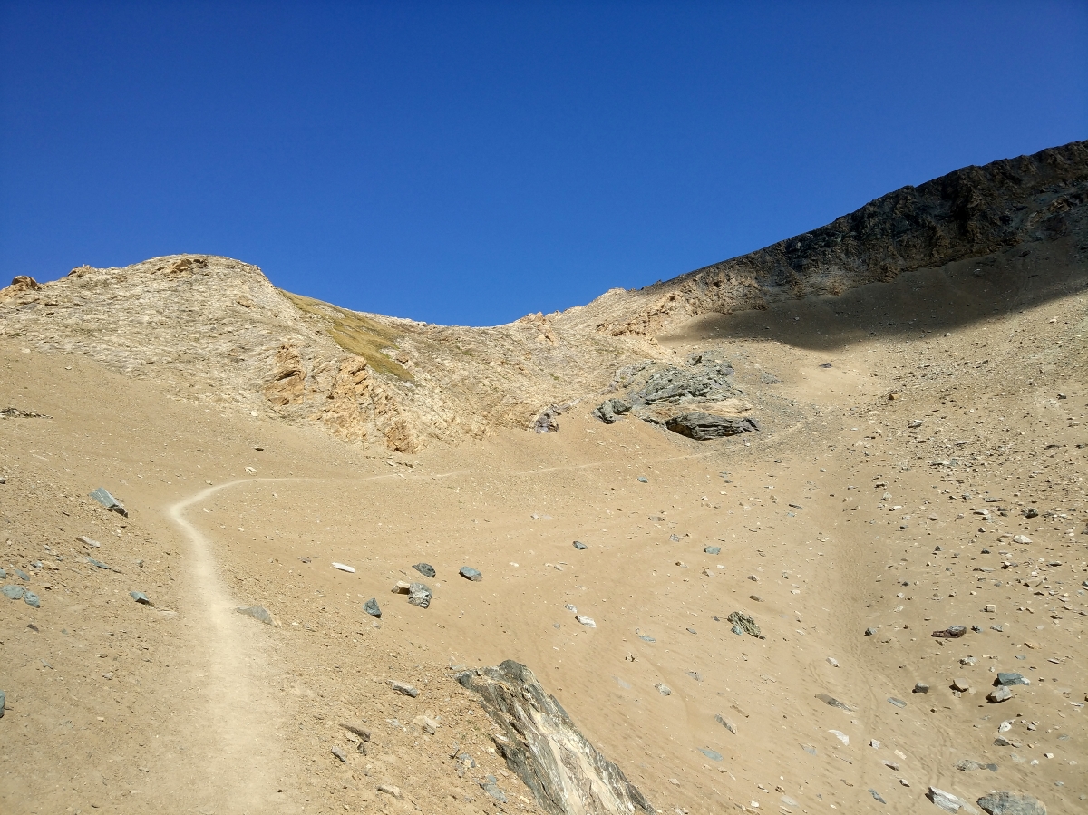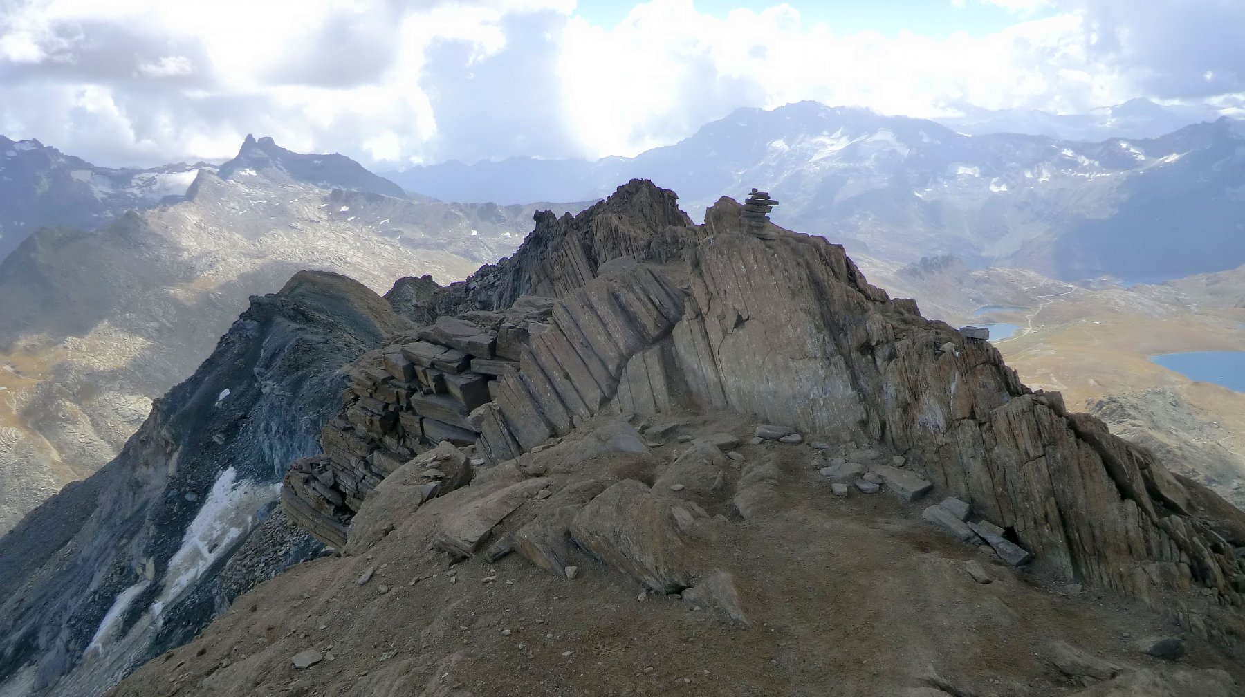 Dal colletto piegare a dx e salire su traccia ripidissima e sfasciumi (ometti). Si giunge ad un punto dove la traccia è sbarrata da un grosso ometto. Qui piegare a destra e salire su una cengia inclinata, ma con buoni appigli, molto breve. Si esce e quasi subito la pendenza si abbatte e si prosegue su buona traccia indicata da ometti sul terreno di sfasciumi. Il sentiero prima va a nord, con grande vista sul Monte Bianco, poi piega verso sud-est salendo con pendenze non eccessive. Ultimo tratto, di nuovo verso nord, più ripido.