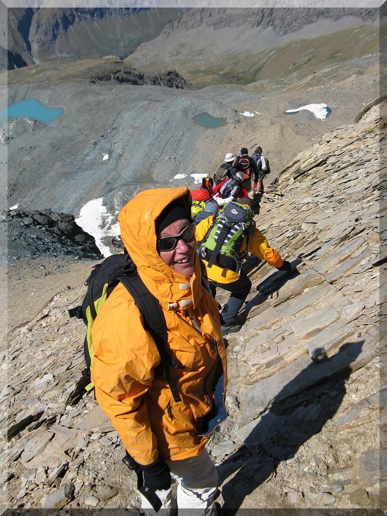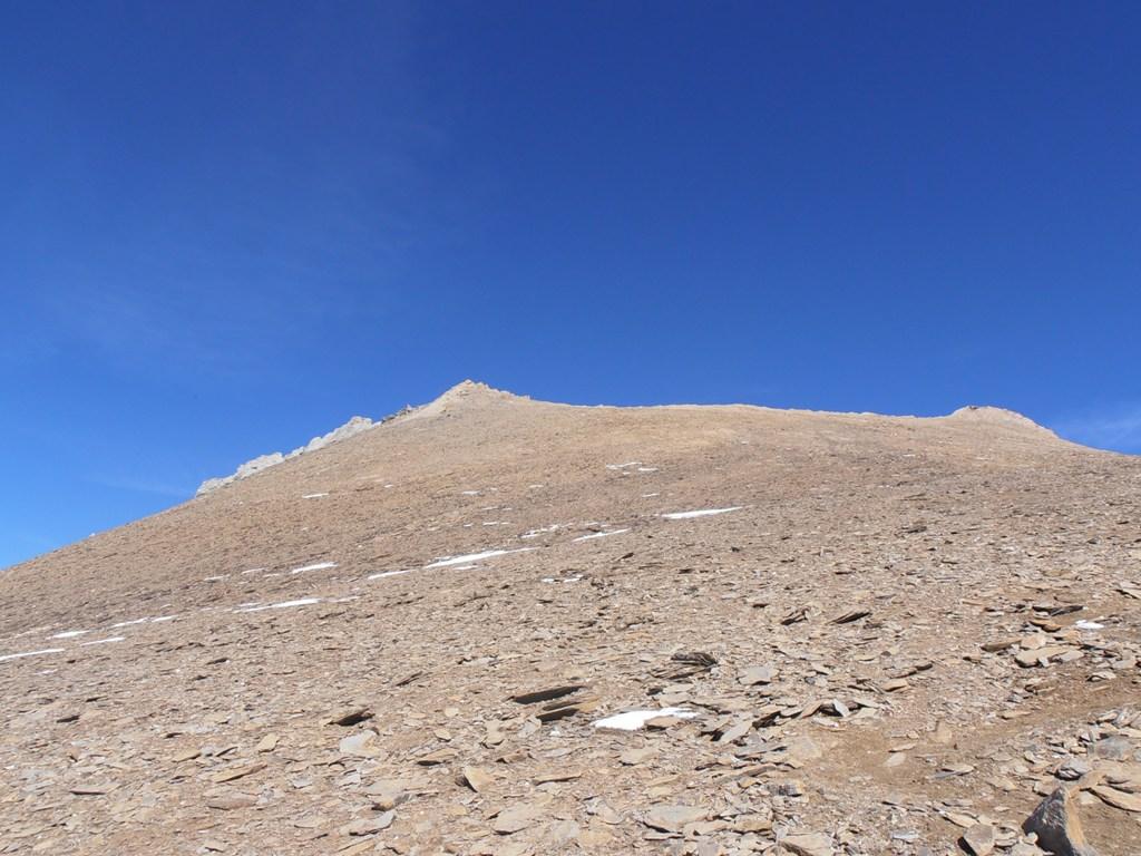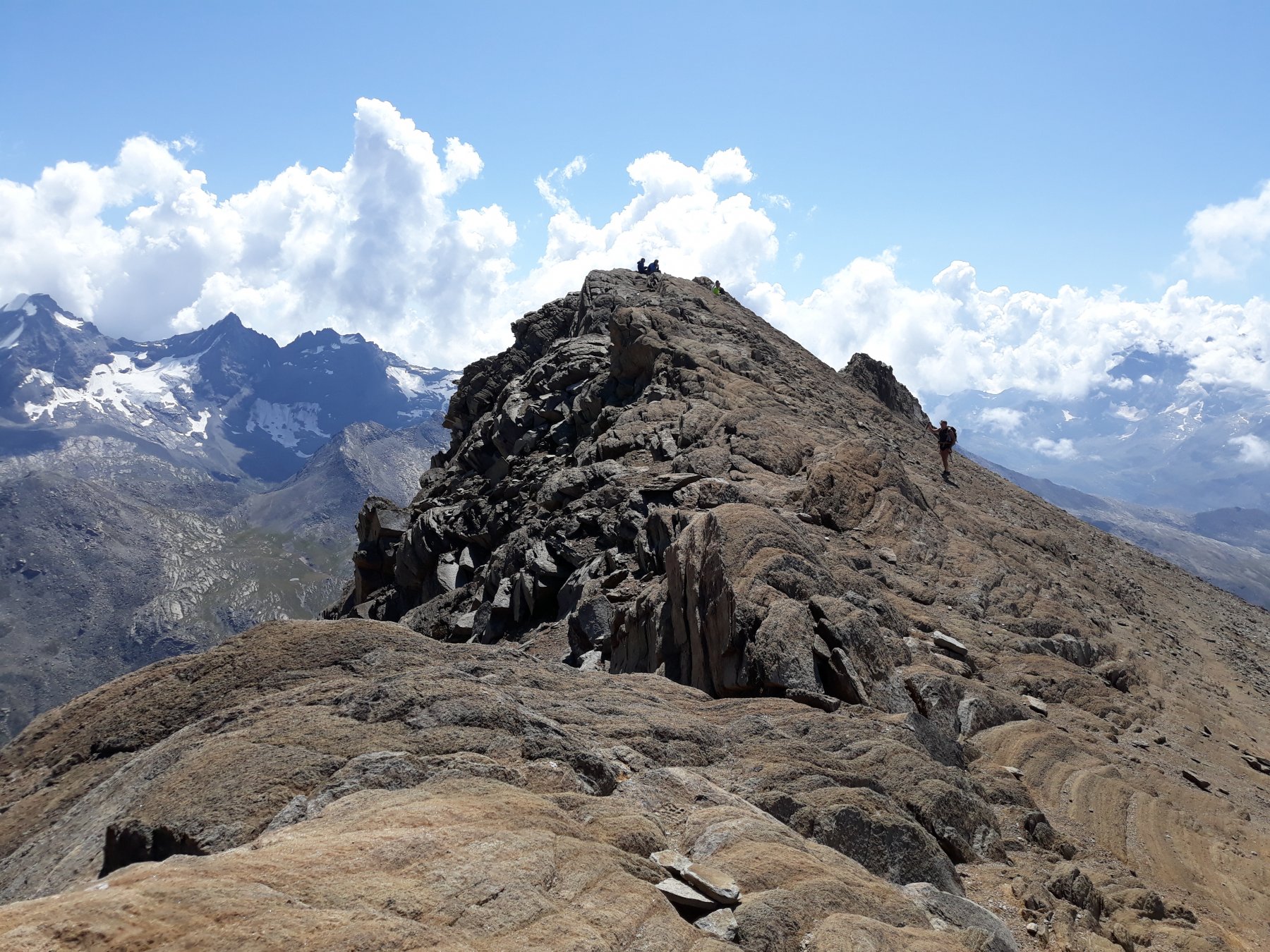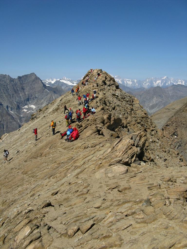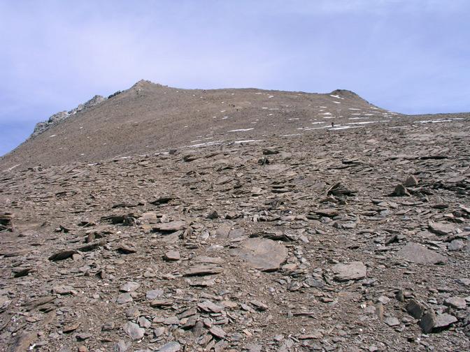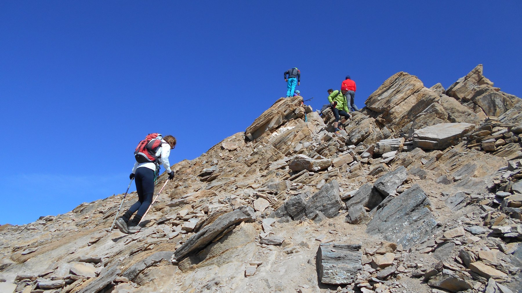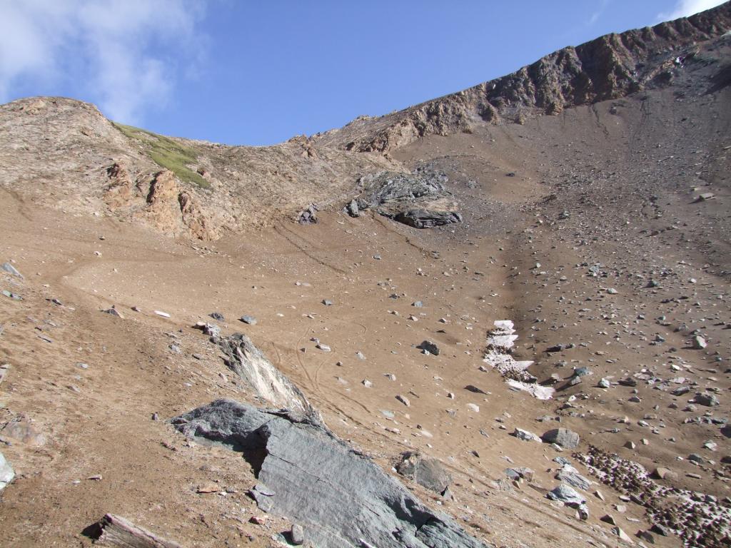 Dal colletto piegare a dx e salire su traccia ripidissima e sfasciumi (ometti). Si giunge ad un punto dove la traccia è sbarrata da un grosso ometto. Qui piegare a destra e salire su una cengia inclinata, ma con buoni appigli, molto breve. Si esce e quasi subito la pendenza si abbatte e si prosegue su buona traccia indicata da ometti sul terreno di sfasciumi. Il sentiero prima va a nord, con grande vista sul Monte Bianco, poi piega verso sud-est salendo con pendenze non eccessive. Ultimo tratto, di nuovo verso nord, più ripido.
