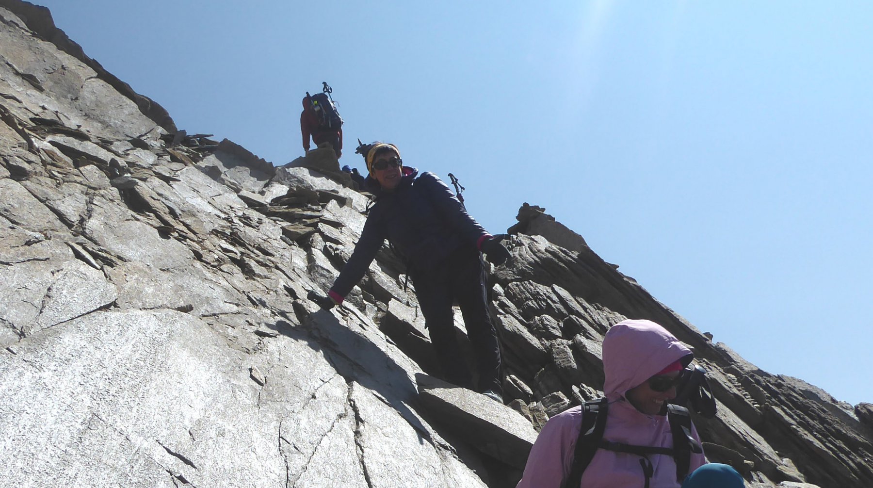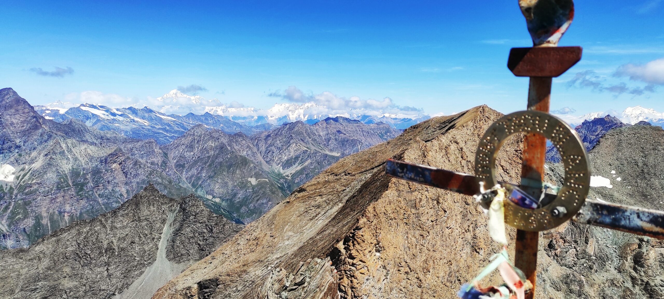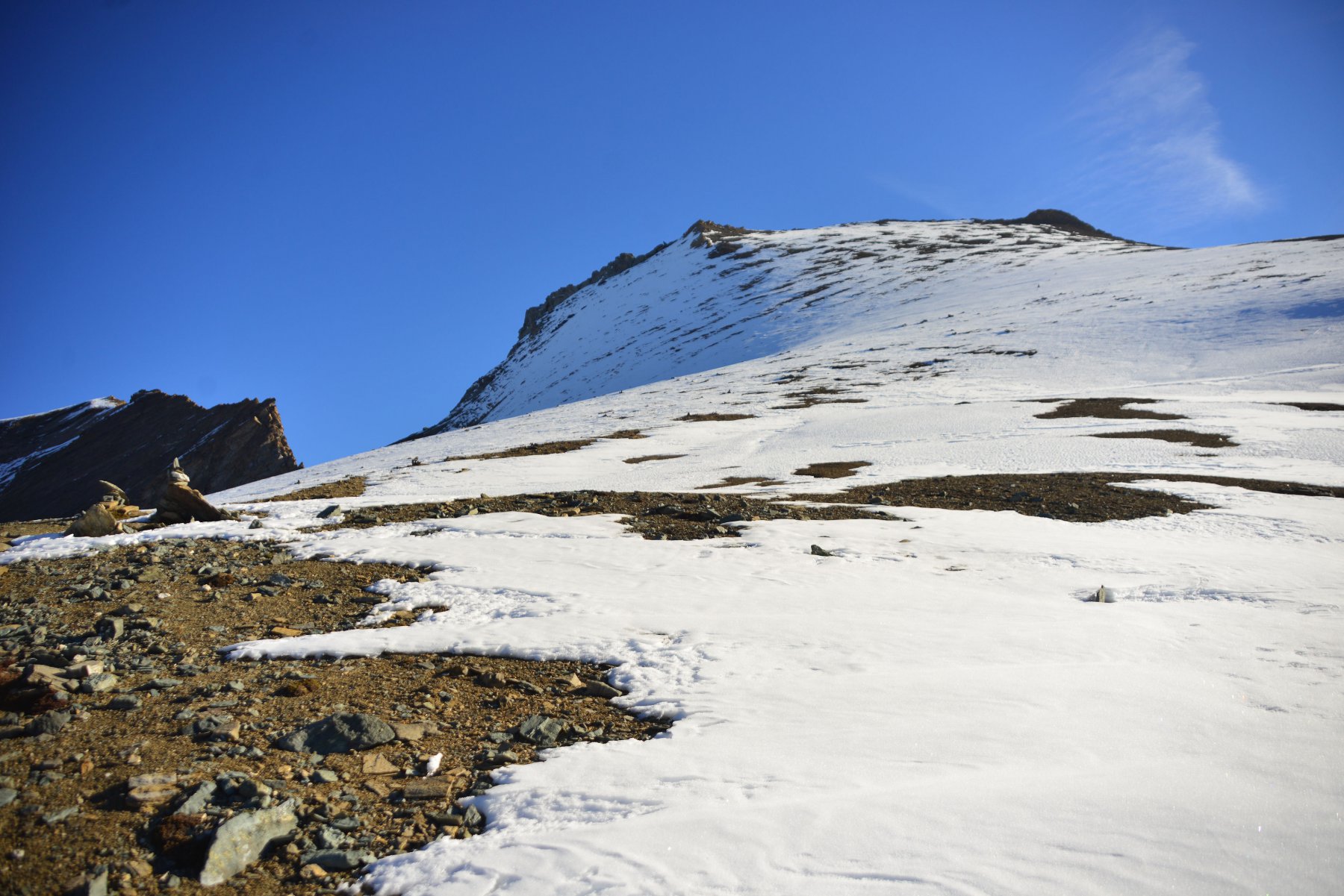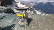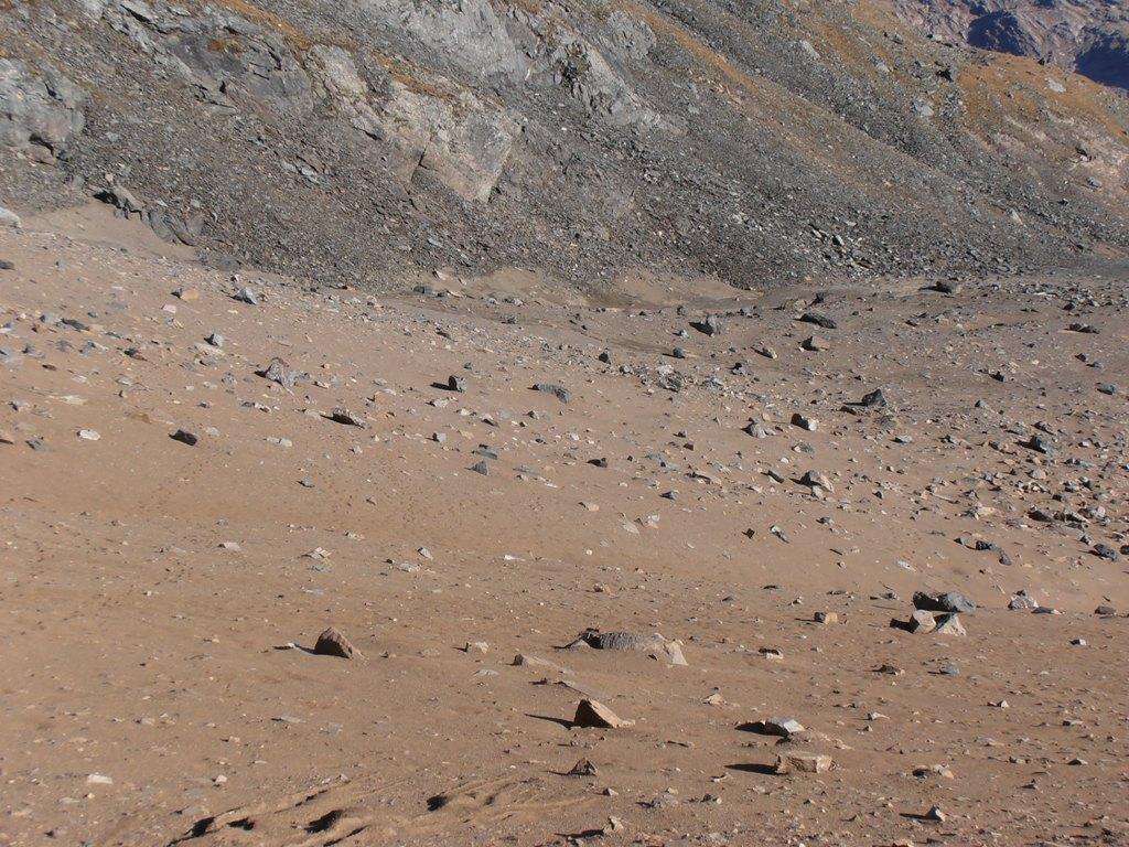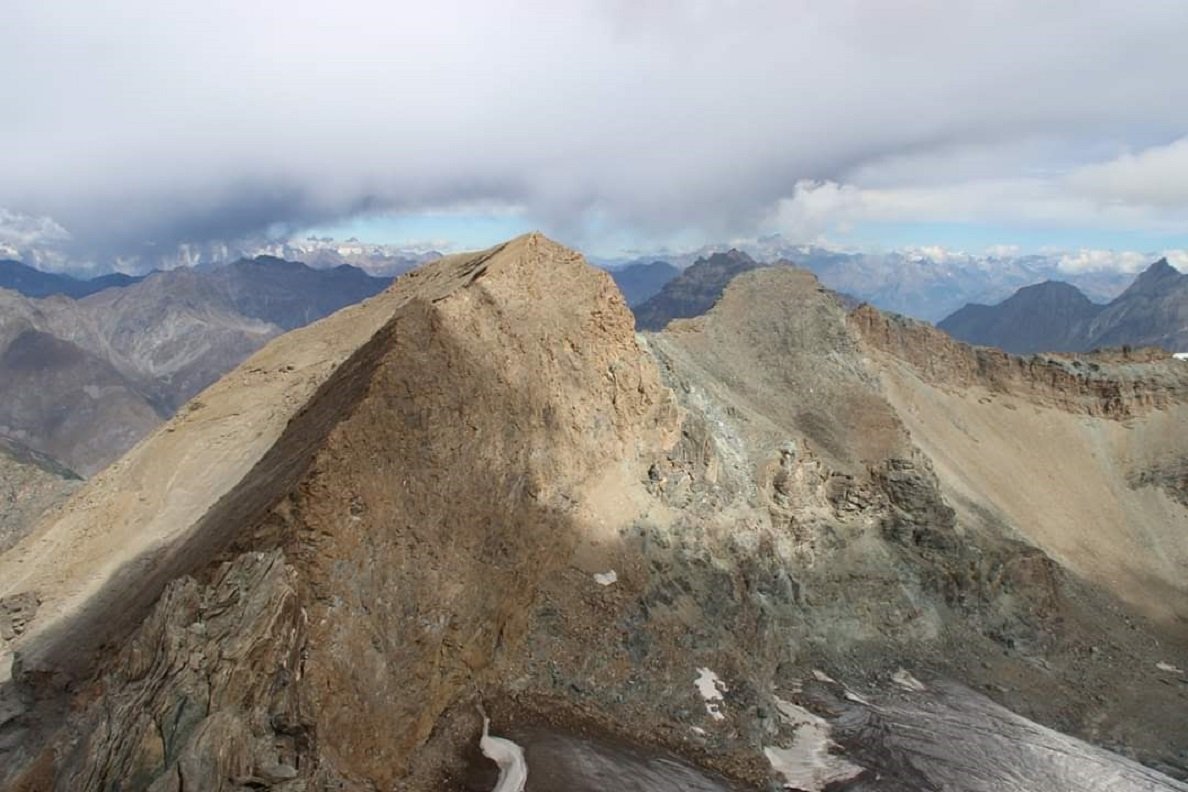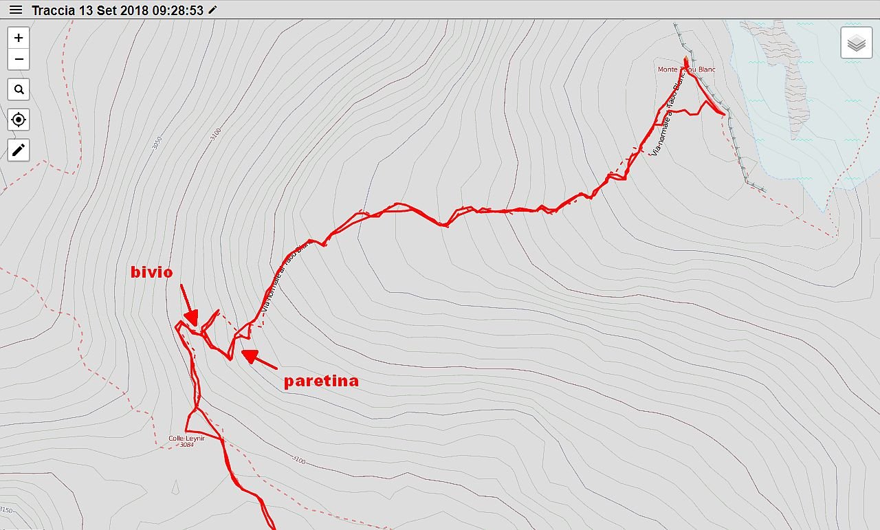 Dal colletto piegare a dx e salire su traccia ripidissima e sfasciumi (ometti). Si giunge ad un punto dove la traccia è sbarrata da un grosso ometto. Qui piegare a destra e salire su una cengia inclinata, ma con buoni appigli, molto breve. Si esce e quasi subito la pendenza si abbatte e si prosegue su buona traccia indicata da ometti sul terreno di sfasciumi. Il sentiero prima va a nord, con grande vista sul Monte Bianco, poi piega verso sud-est salendo con pendenze non eccessive. Ultimo tratto, di nuovo verso nord, più ripido.