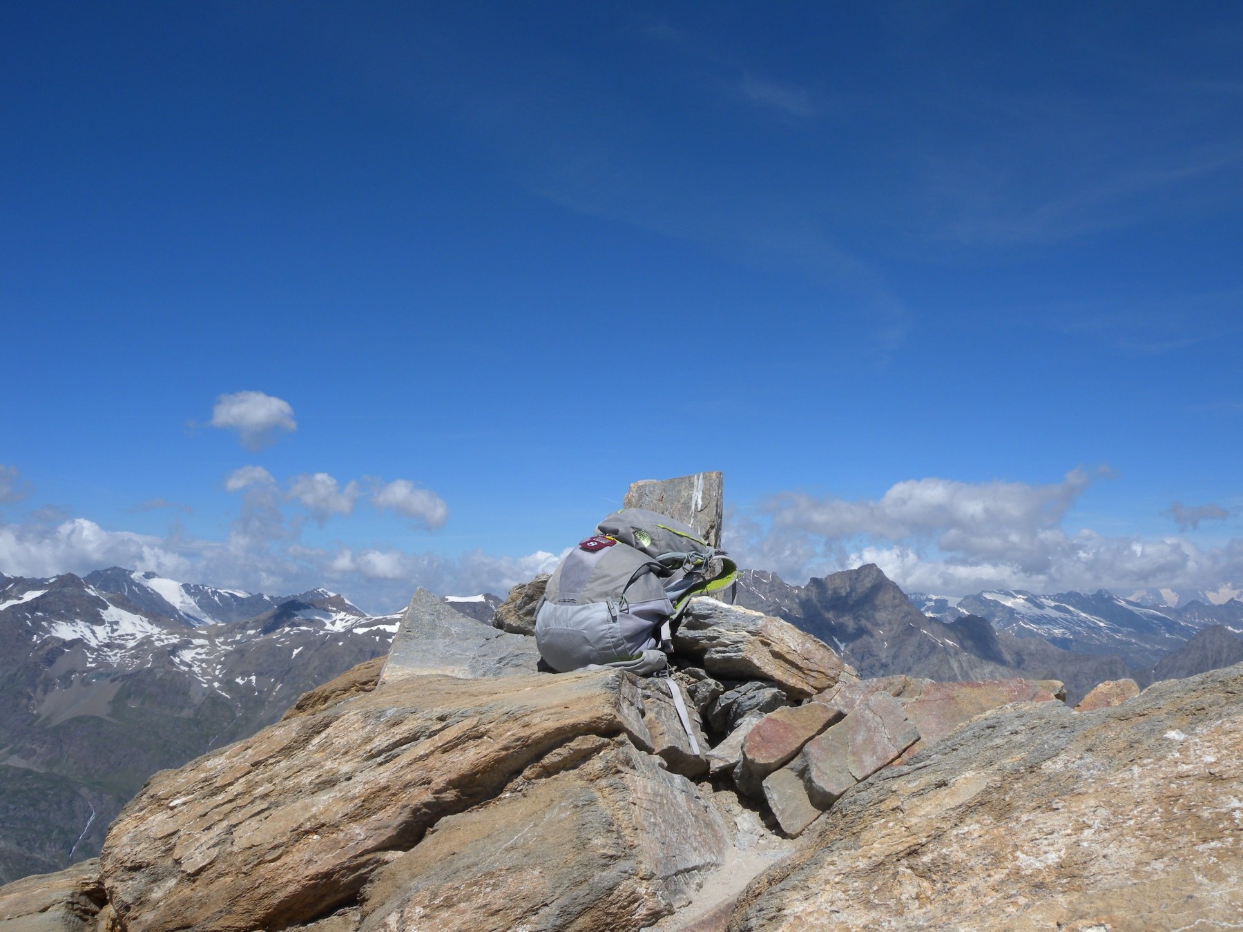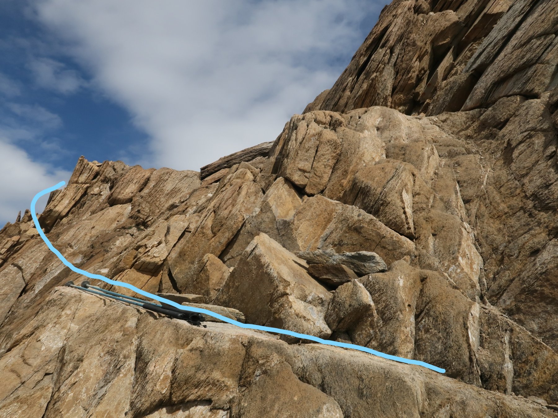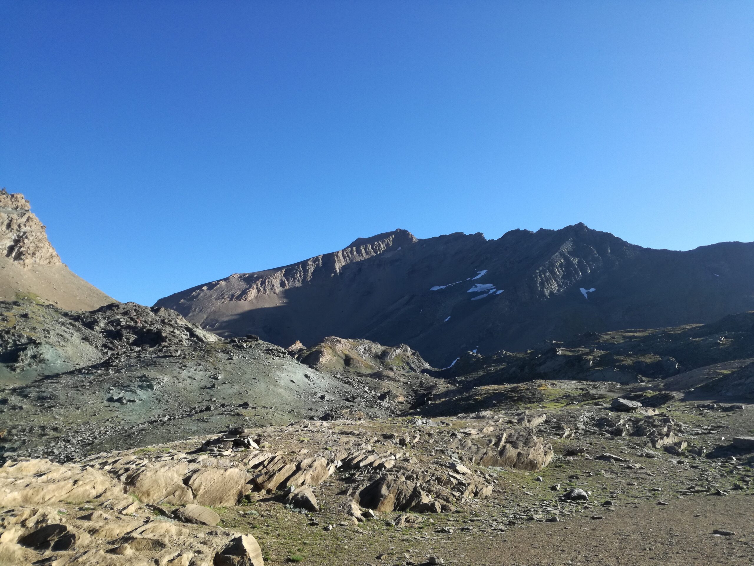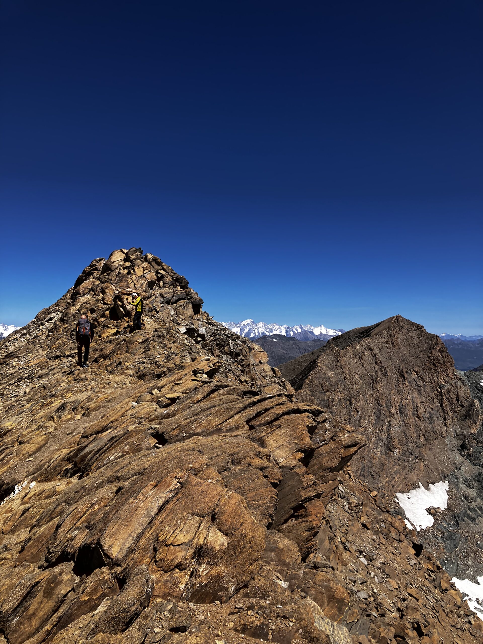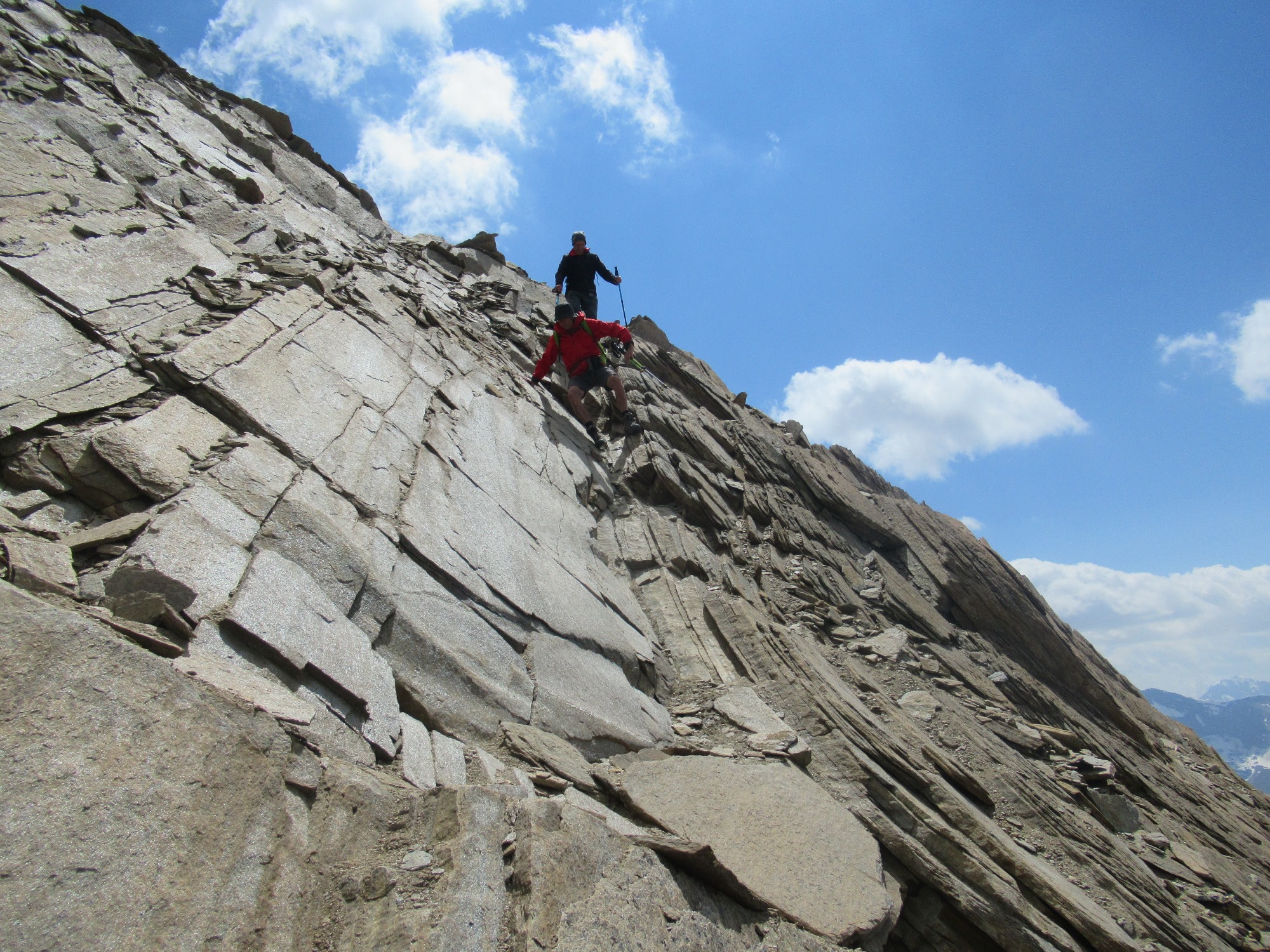 Dal colletto piegare a dx e salire su traccia ripidissima e sfasciumi (ometti). Si giunge ad un punto dove la traccia è sbarrata da un grosso ometto. Qui piegare a destra e salire su una cengia inclinata, ma con buoni appigli, molto breve. Si esce e quasi subito la pendenza si abbatte e si prosegue su buona traccia indicata da ometti sul terreno di sfasciumi. Il sentiero prima va a nord, con grande vista sul Monte Bianco, poi piega verso sud-est salendo con pendenze non eccessive. Ultimo tratto, di nuovo verso nord, più ripido.