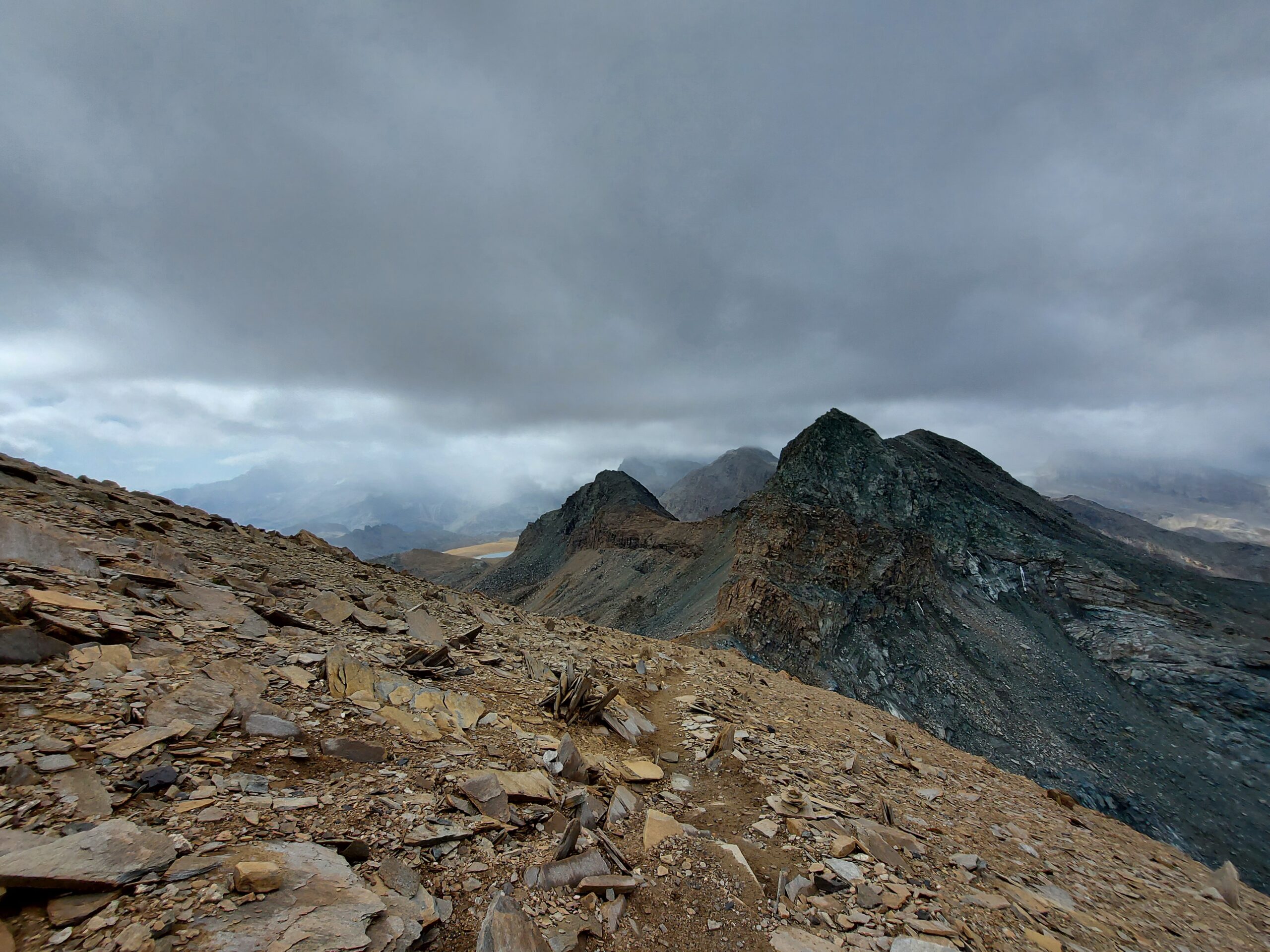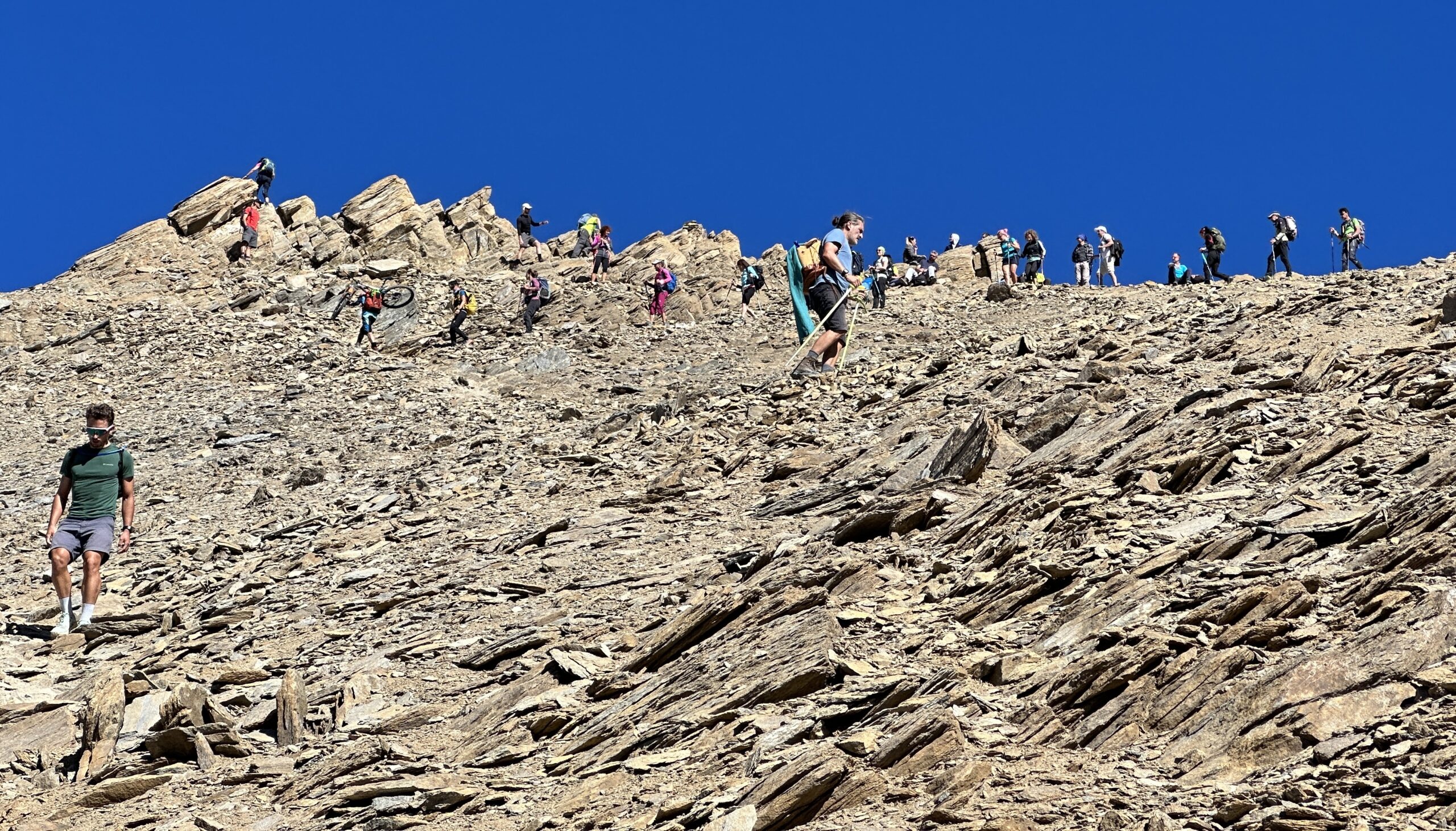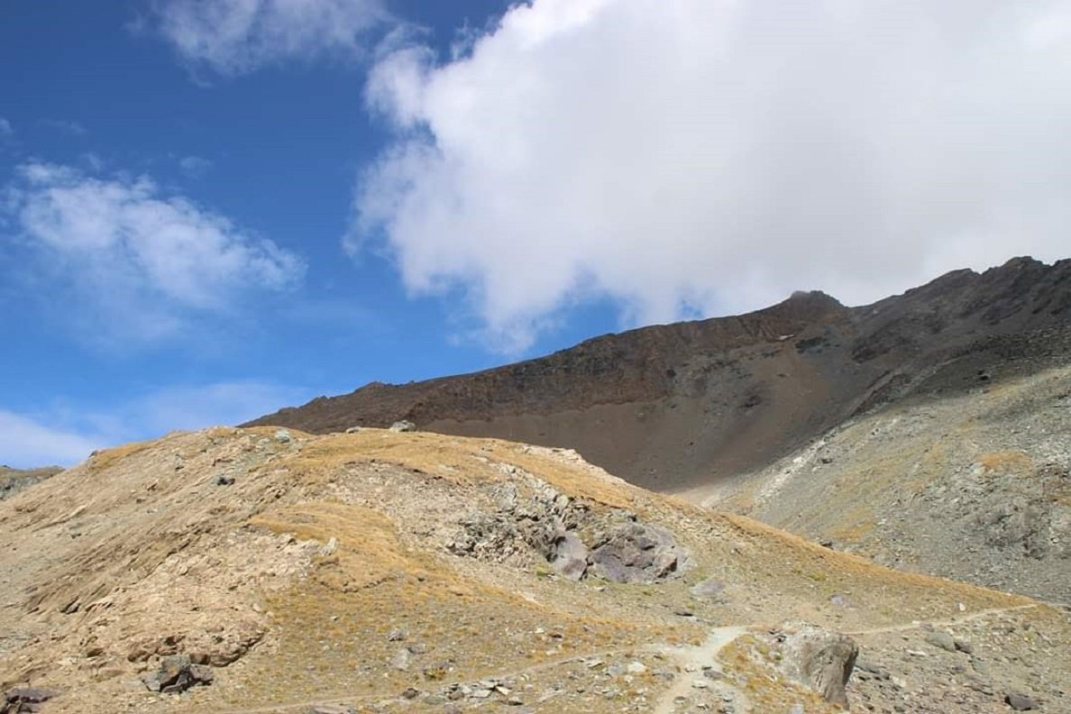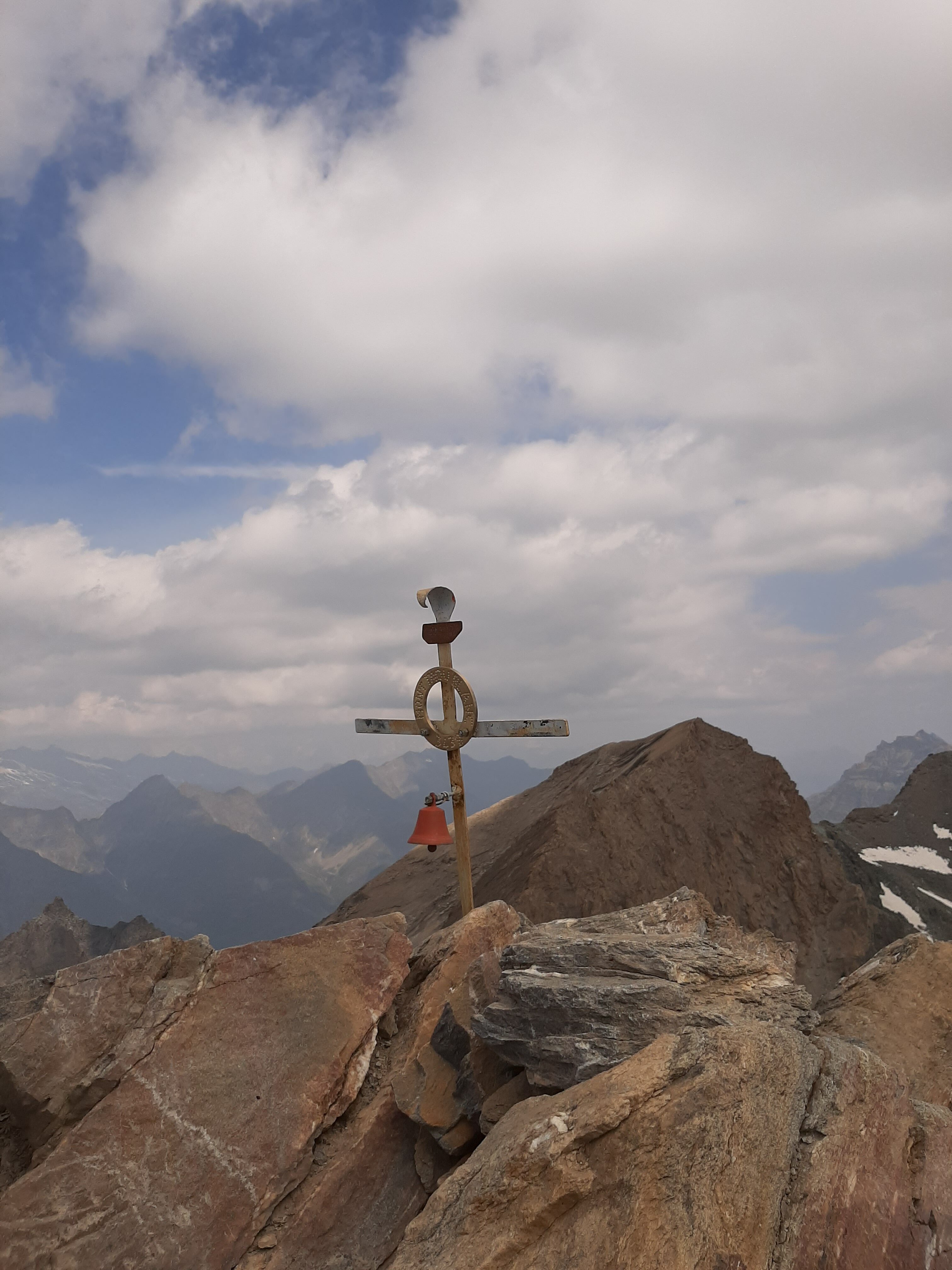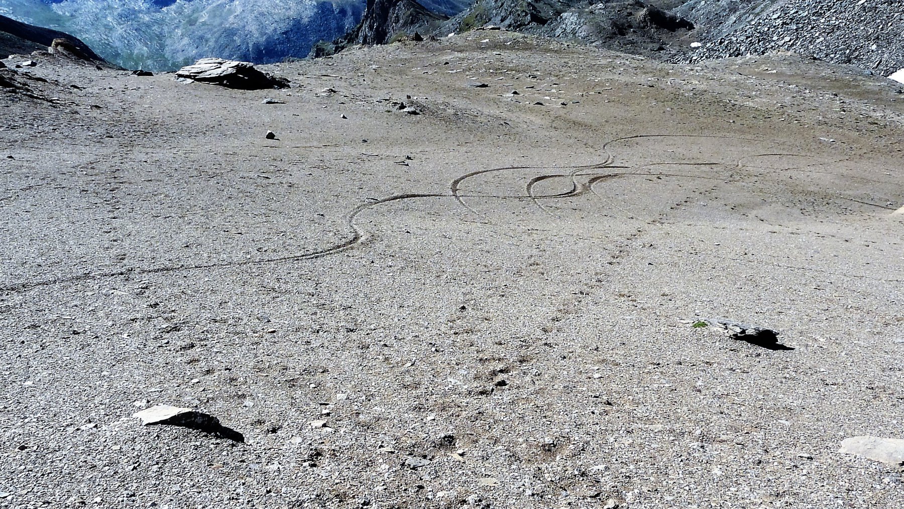 Dal colletto piegare a dx e salire su traccia ripidissima e sfasciumi (ometti). Si giunge ad un punto dove la traccia è sbarrata da un grosso ometto. Qui piegare a destra e salire su una cengia inclinata, ma con buoni appigli, molto breve. Si esce e quasi subito la pendenza si abbatte e si prosegue su buona traccia indicata da ometti sul terreno di sfasciumi. Il sentiero prima va a nord, con grande vista sul Monte Bianco, poi piega verso sud-est salendo con pendenze non eccessive. Ultimo tratto, di nuovo verso nord, più ripido.