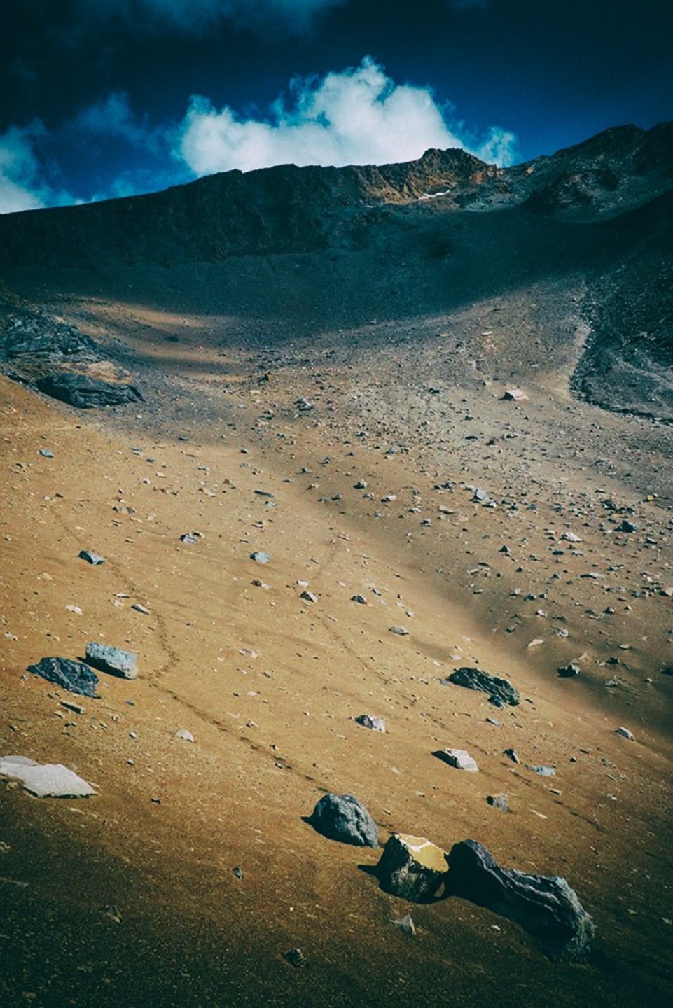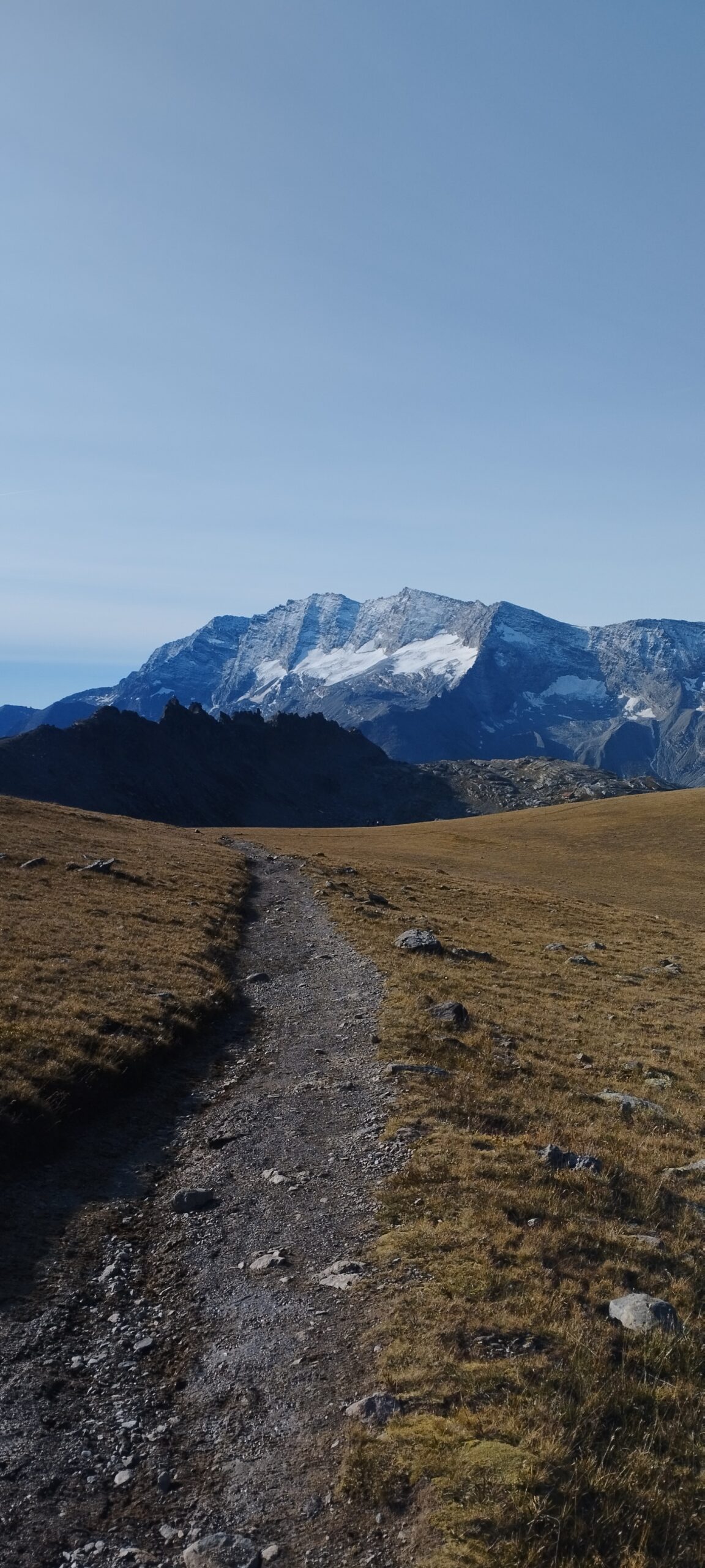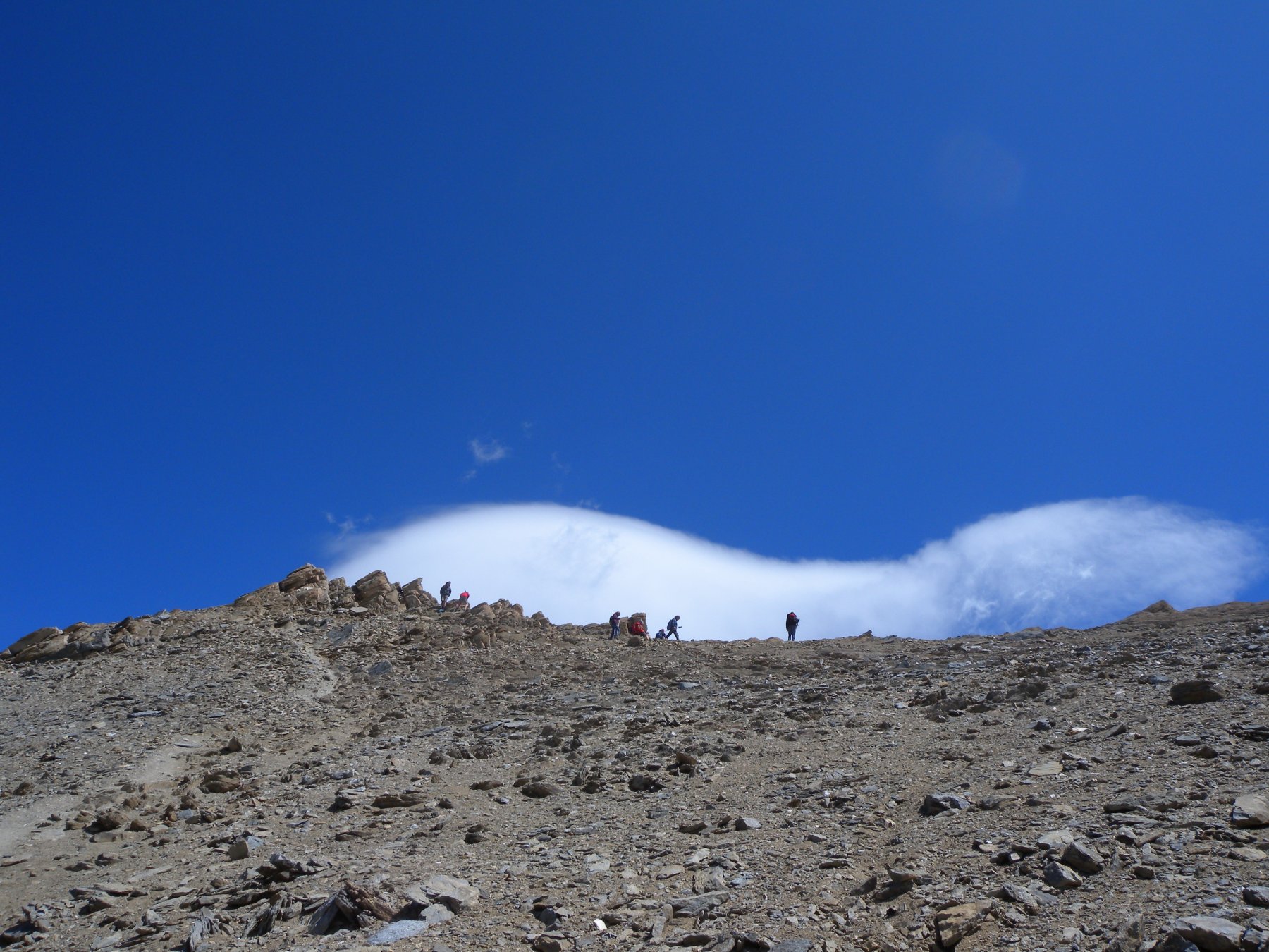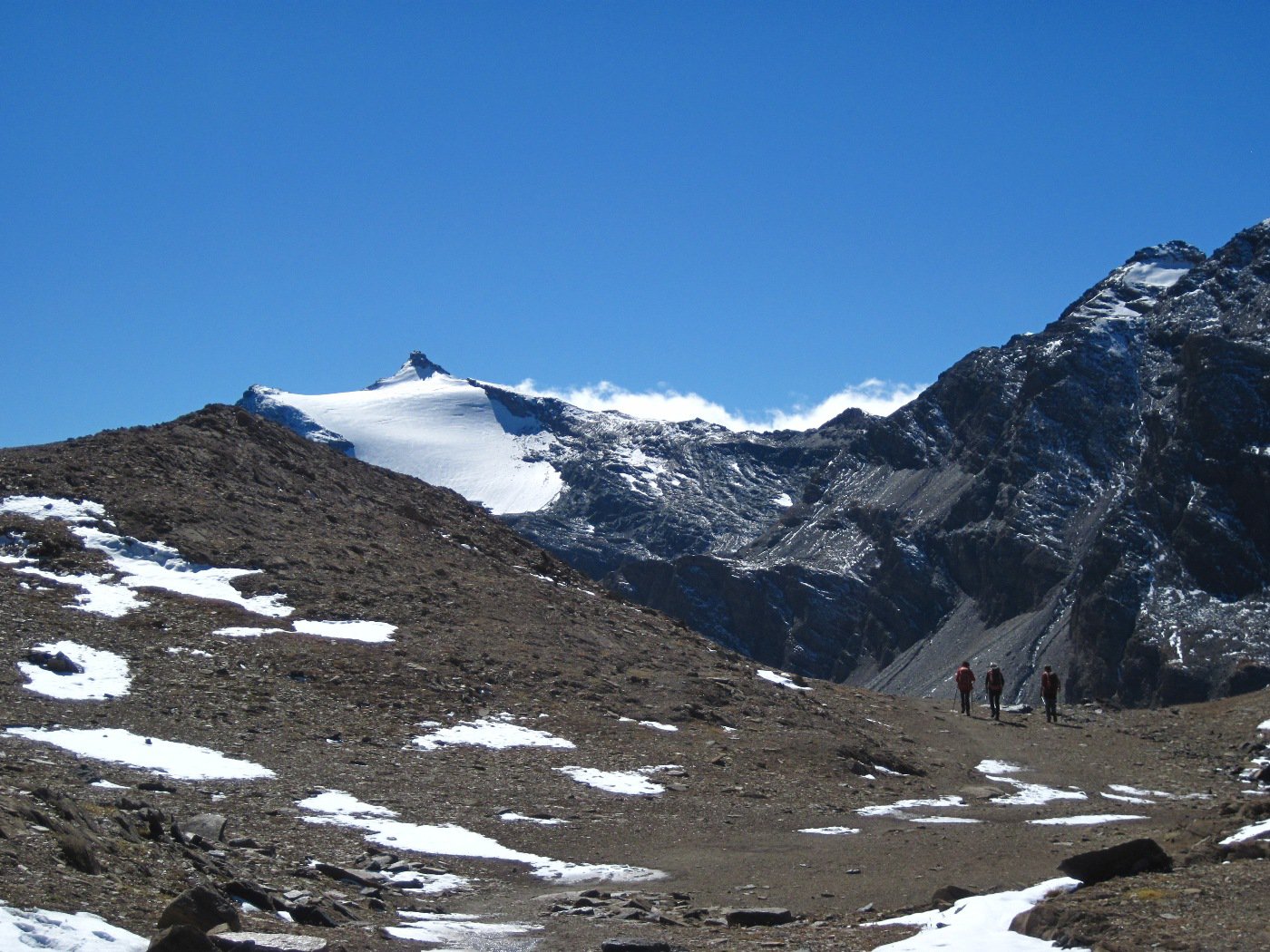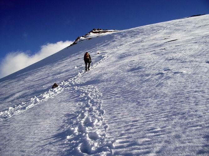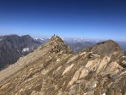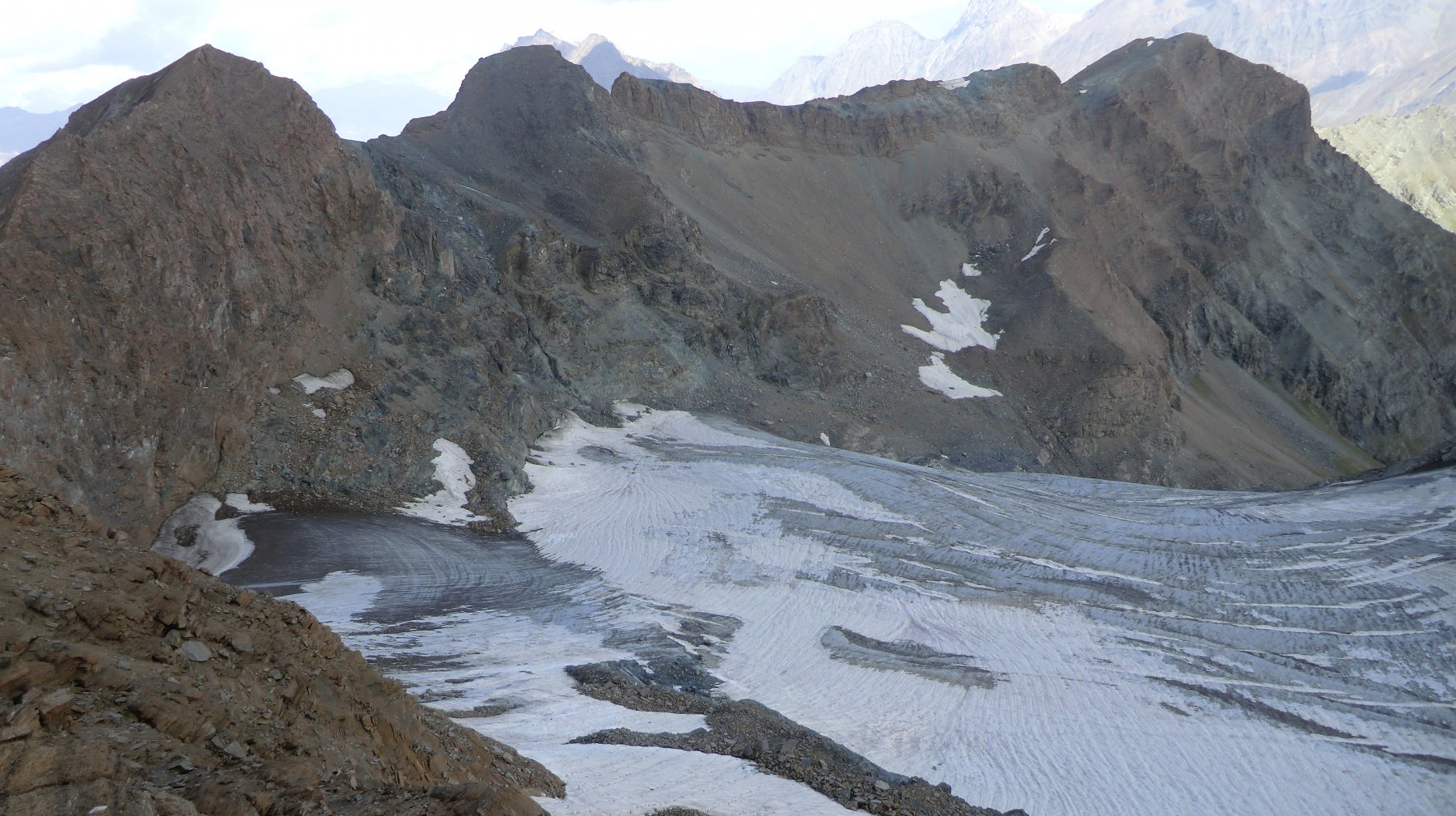 Dal colletto piegare a dx e salire su traccia ripidissima e sfasciumi (ometti). Si giunge ad un punto dove la traccia è sbarrata da un grosso ometto. Qui piegare a destra e salire su una cengia inclinata, ma con buoni appigli, molto breve. Si esce e quasi subito la pendenza si abbatte e si prosegue su buona traccia indicata da ometti sul terreno di sfasciumi. Il sentiero prima va a nord, con grande vista sul Monte Bianco, poi piega verso sud-est salendo con pendenze non eccessive. Ultimo tratto, di nuovo verso nord, più ripido.