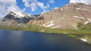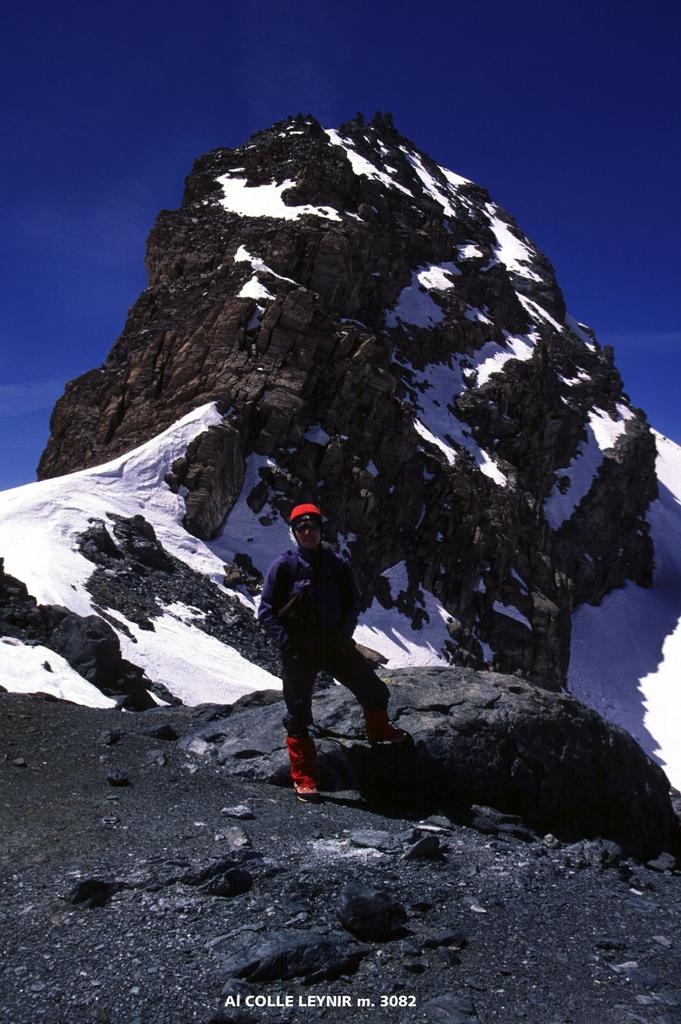 Il sentiero perviene a una prima rampa più ripida in prossimità dei laghi dei Tre Becchi. Dopo vi è un tratto meno ripido, giungendo ad un altro salto. Quindi il sentiero si inoltra in una valletta pervenendo al valloncello che scende dal Col Leynir, spesso innevato fino a tarda stagione. Si scende per pochi metri e si risale su un tratto sabbioso dal caratteristico colore marrone chiaro. Con ripida salita si perviene a un tratto di roccette e da lì in breve, in piano, al Col Leynir.