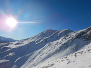 Partiti per andare a Punta Chaligne abbiamo deviato qui. In zona pendii molto spelati dal vento. Il socio è salito fino al Mont de la Tza, io stufo dell’imponente zoccolo mi sono fermato qui.