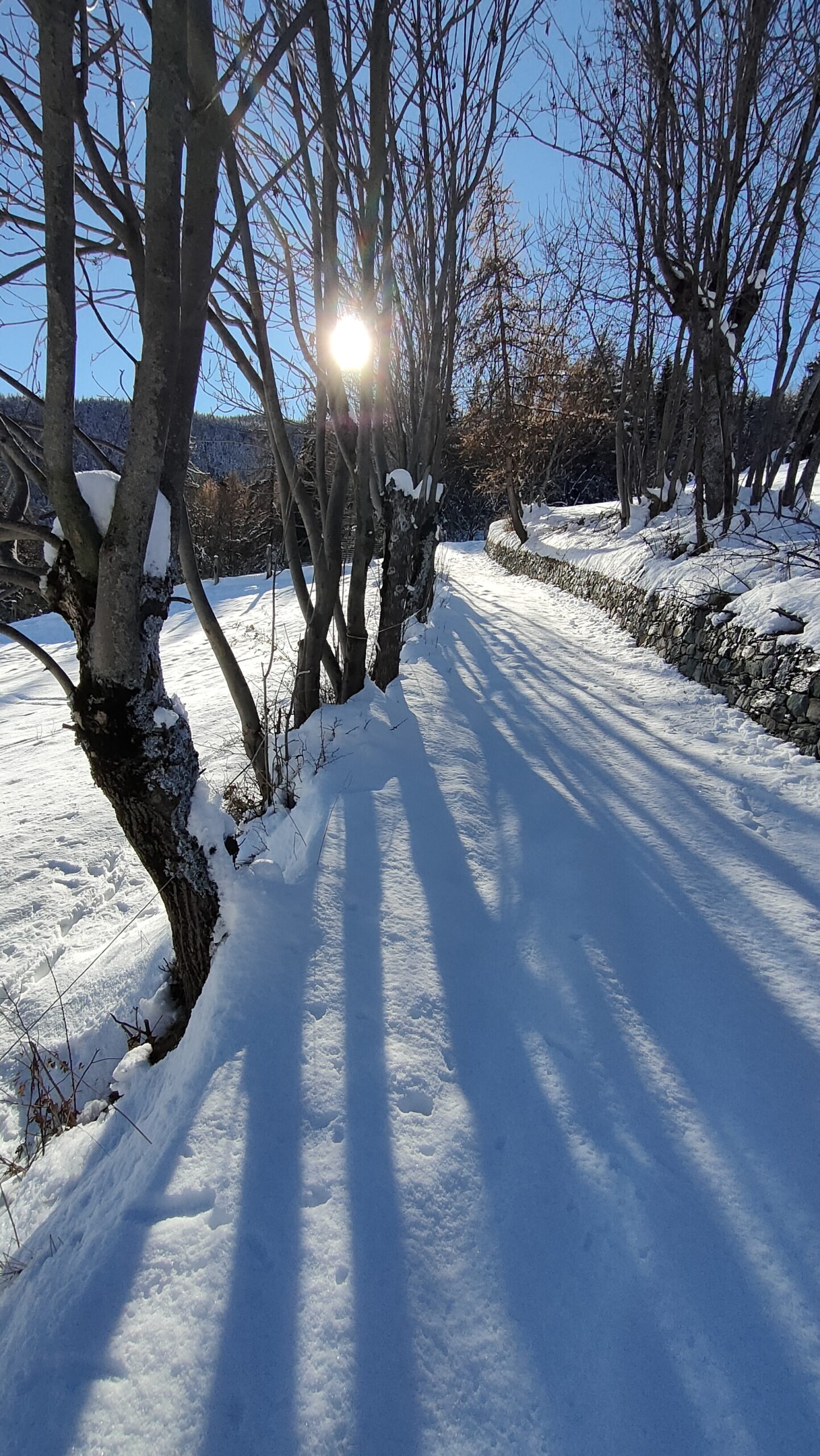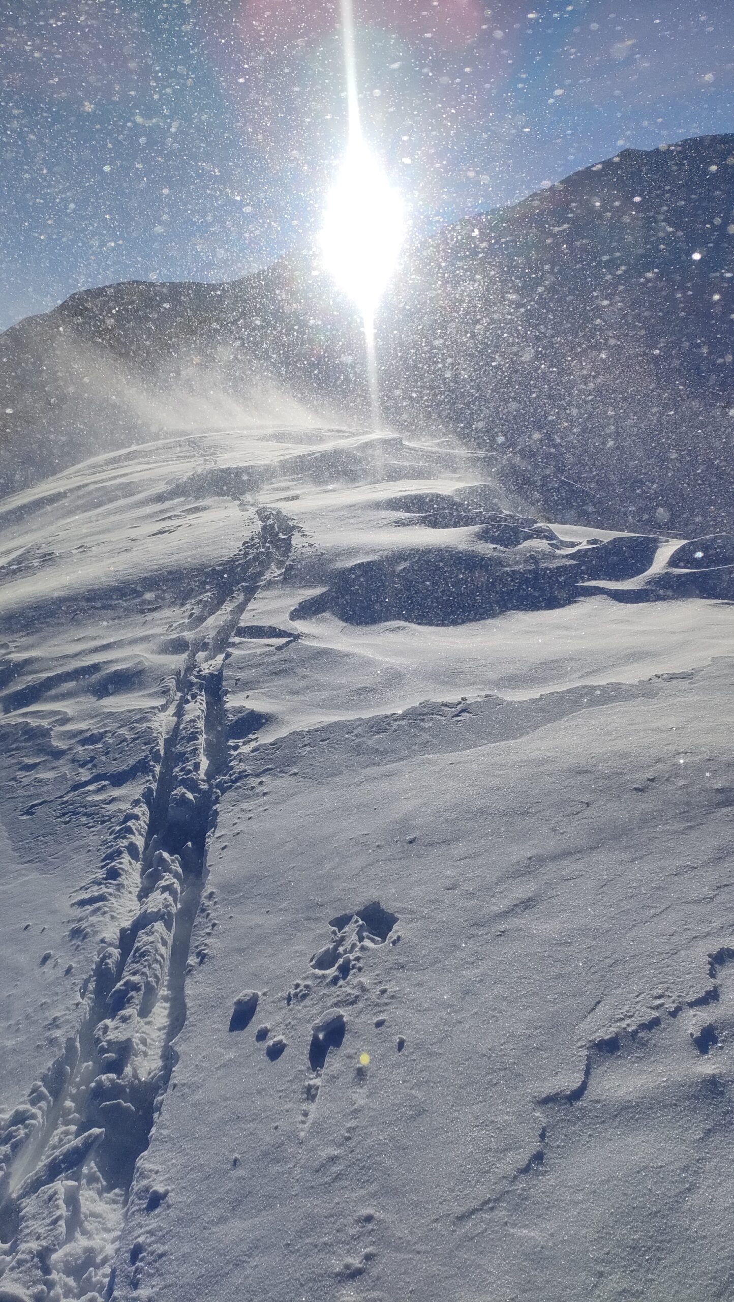 In basso il fondo erboso evita di fare troppi danni visto la poca neve senza fondo. Salendo ho incrociato due persone che scendevano dopo aver rinunciato all’altezza delle ultime baite. La neve pesante impediva loro di allontanarsi più di tanto dalla traccia di salita. Ho tracciato fino al colle di costa Tardiva passando dal rifugio (faticoso). Più si sale e più la neve diventa profonda. Il pendio est della Chaligne è tutto svalangato. Sulla dorsale della costa Tardiva soffiava vento forte. Dato che erano ormai le h 15:30, veloce cambio assetto e giù…anzi…non ho fatto a tempo a chiudere gli scarponi che mi è esploso un pin dell’attacco. Ok, oggi era una delle tante giornate no … ma ormai ci ho fatto l’abitudine. Santo “Nastro Americano” e l’apostolo “Spago” mi han permesso di scendere fino all’auto prima del buio. Fortunatamente la neve si era raffreddata rispetto a quando ero salito e qualche bella curva (non so come) sono anche riuscito a farla.