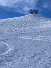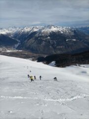 Discese primo trattato su farina a tratti crostosa dove per divertirsi è necessario piede pesante e spregiudicatezza nel buttare le punte verso il basso, nei valloncelli verso NO neve farinosa.