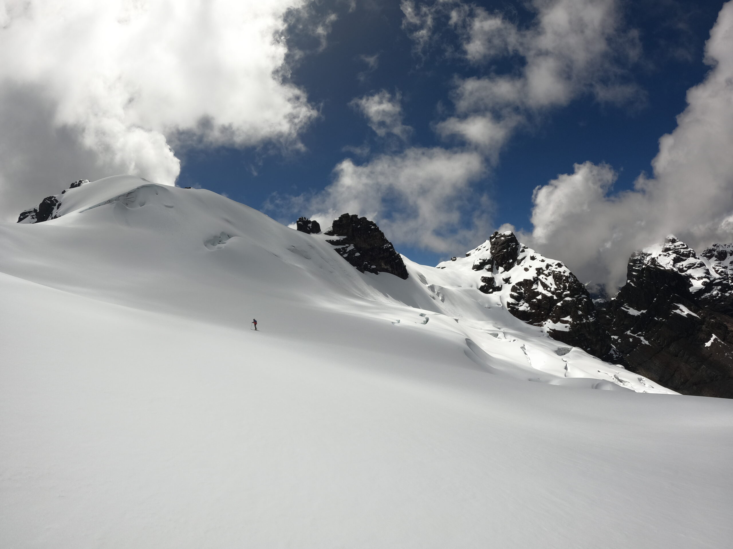 Dal parcheggio (attenzione al pedaggio per l’ingresso nel parco del Condoriri, 20 boliviani a testa) proseguire nella grande valle, sci in spalla. Attenzione a tenersi sul lato destro, sinistra idrografica. Dopo qualche chilometro si raggiungono le due lagune e poi il campo base del Condoriri (4650 circa). Da qui proseguire verso destra (nord-est) puntando la grande ghiacciaio del Pico Tarija. Raggiunta la base (4820 circa) per tracce di sentiero finalmente si mettono gli sci. Attaccare il direttamente e puntando verso destra, una volta passata la prima seraccata mantenersi sulla destra fino alla sella con l’Haullomen. Da qui puntare direttamente alla cima che si raggiunge in 100/150 metri di dislivello.