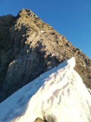 Partenza alle 4.40, presenti numerosi ometti che aiutano nel percorso, oltre agli evidenti segni dei ramponi. A parte qualche tratto la roccia non è brutta come si dice e la cresta risulta piacevole e divertente, mai continua con un discreto sviluppo orizzontale. E’ presente ancora qualche tratto innevato prima dello sperone finale ma essendo ben pestato non abbiamo usato picca/ramponi.