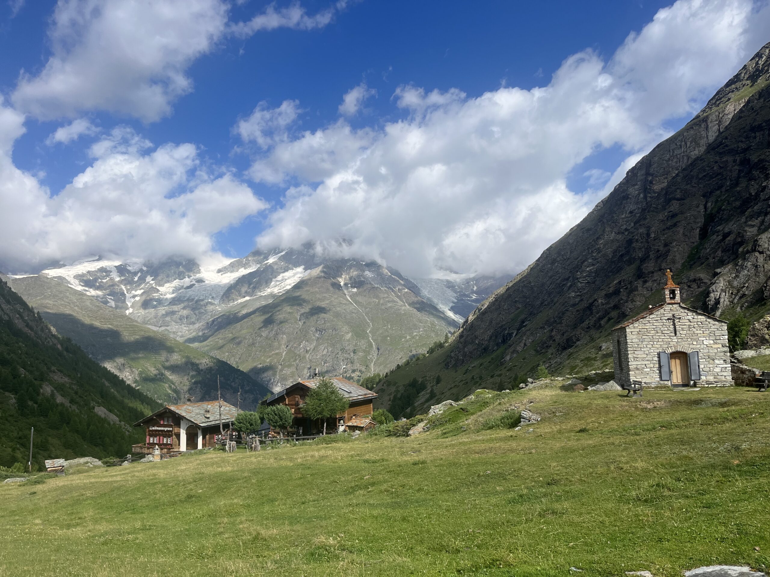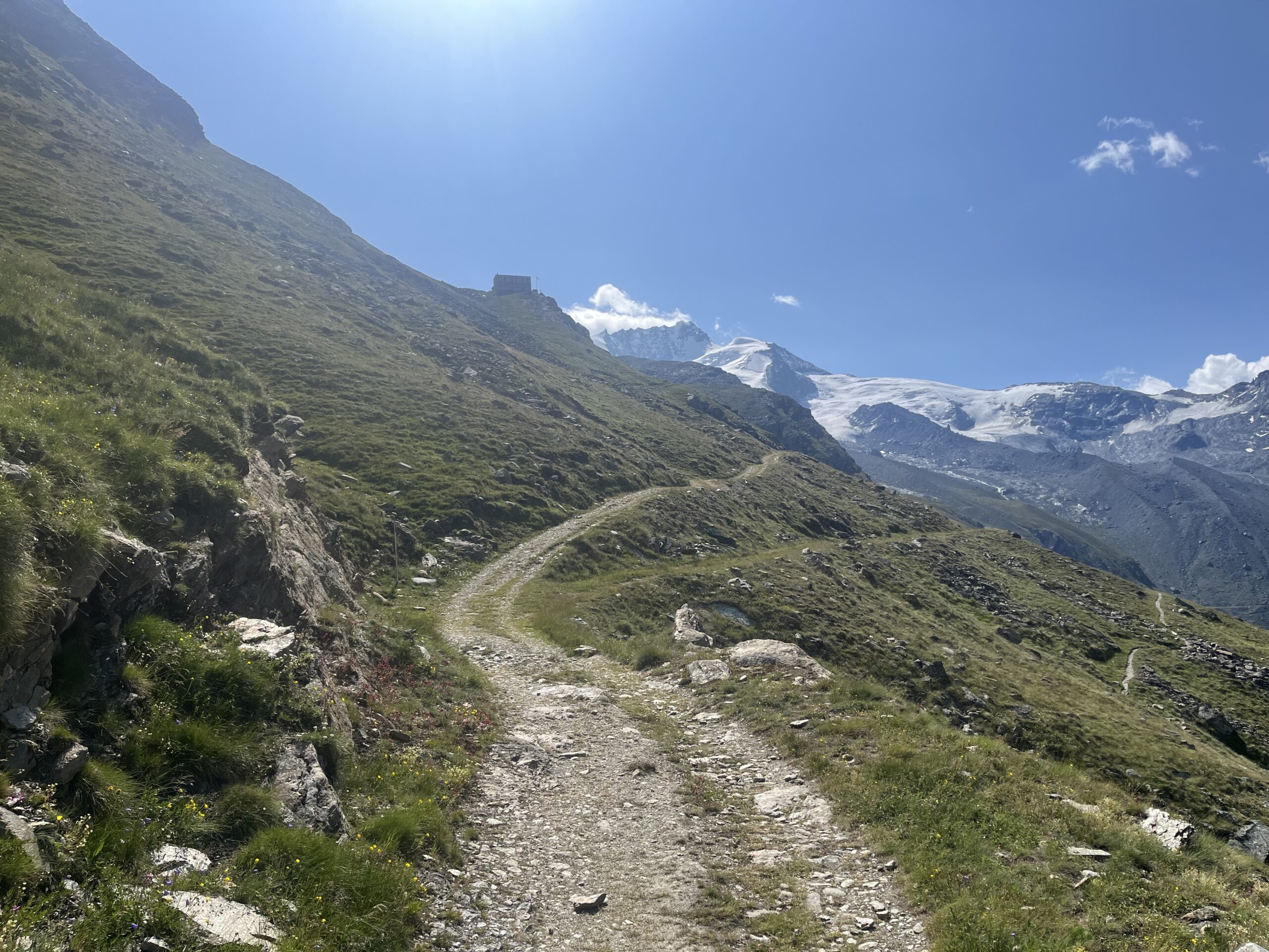 Dall’ultimo parcheggio della Taschalp (sulle cartine indicata come Ottavan, 2199m) imboccare la strada sterrata che, dopo aver superato un alpeggio, inizia a salire ripida lungo un paravalanghe. Seguire la strada oppure accorciare su sentiero fino a raggiungere il nuovissimo rifugio. Lungo il percorso si trova la deviazione per il Weingartesee ed un paio di piloncini votivi in ottimo stato.