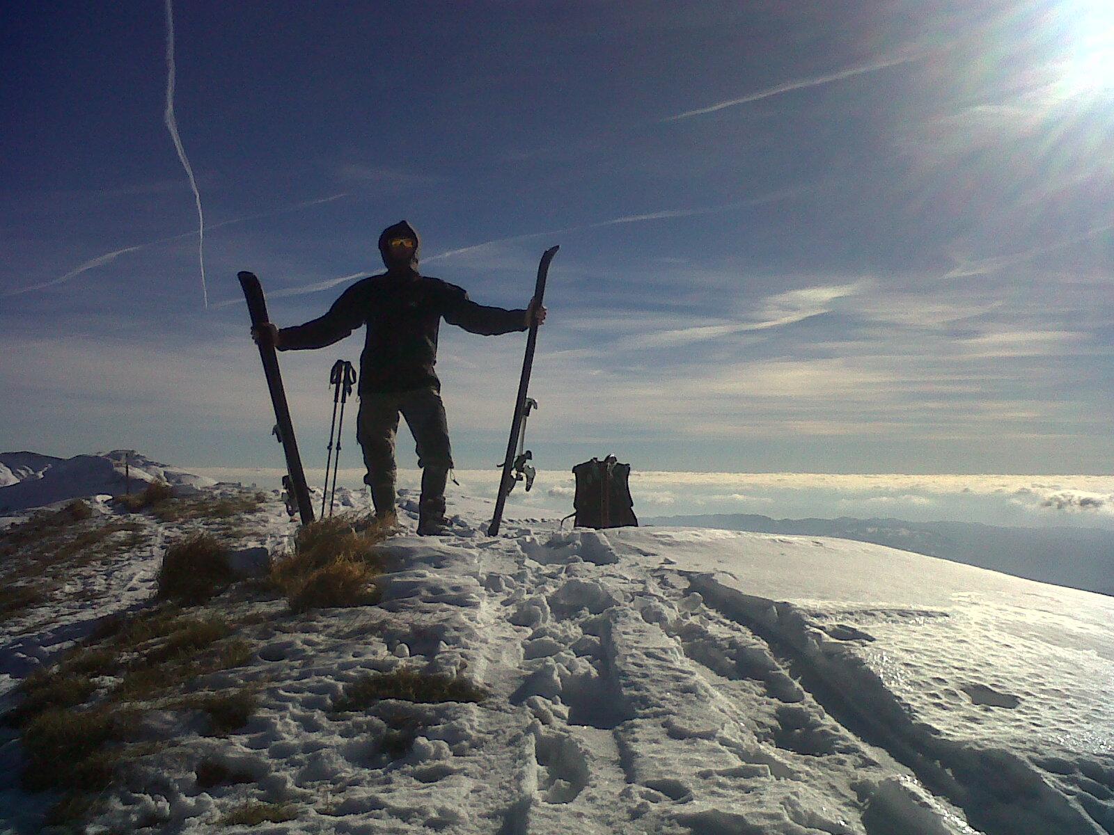 Il forte vento ha spazzolato ben benino il crinale. Poca neve con scarso fondo ma di piacevole aspetto e consistenza primaverile che concedono un’appagante sciata.