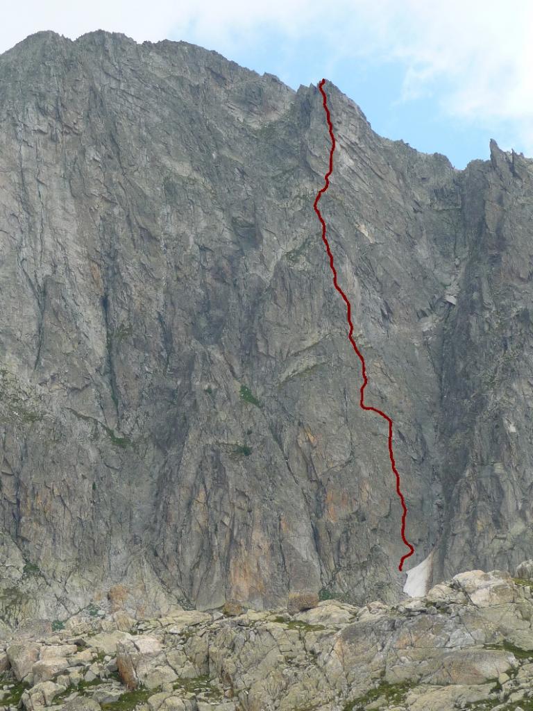 L'itinerario moderno proposto sale le belle placche centrali ,per poi traversare suula cresta ovest (50 mt di cresta sono in comune con le vie ddi Dufranc),poi supera direttamente il risalto finale fino alla cima .