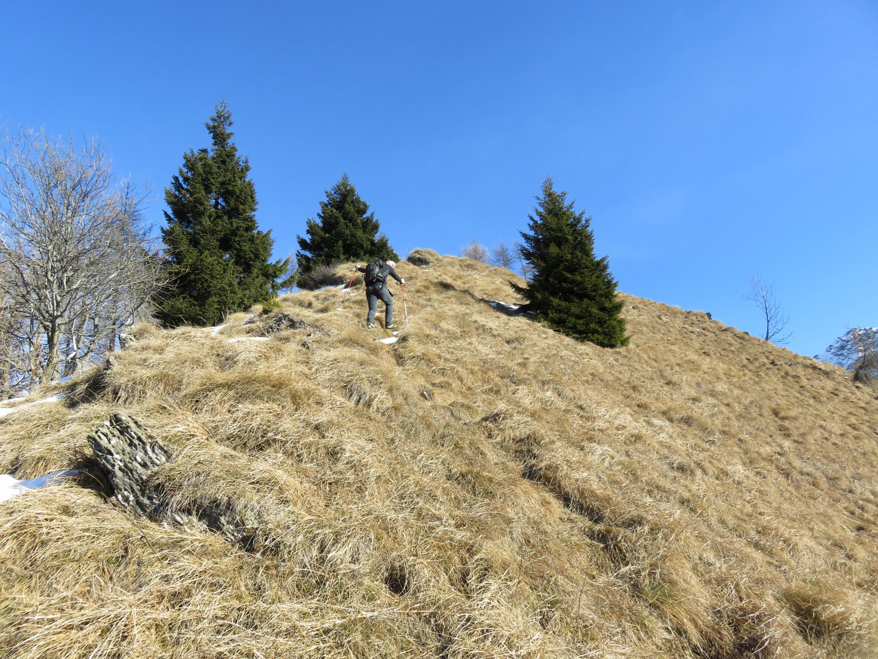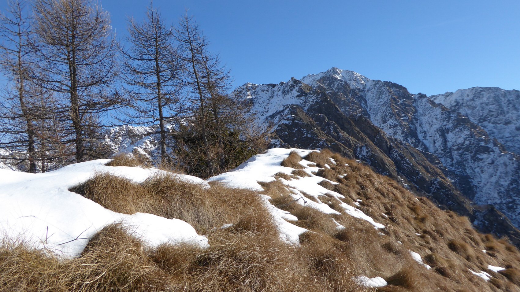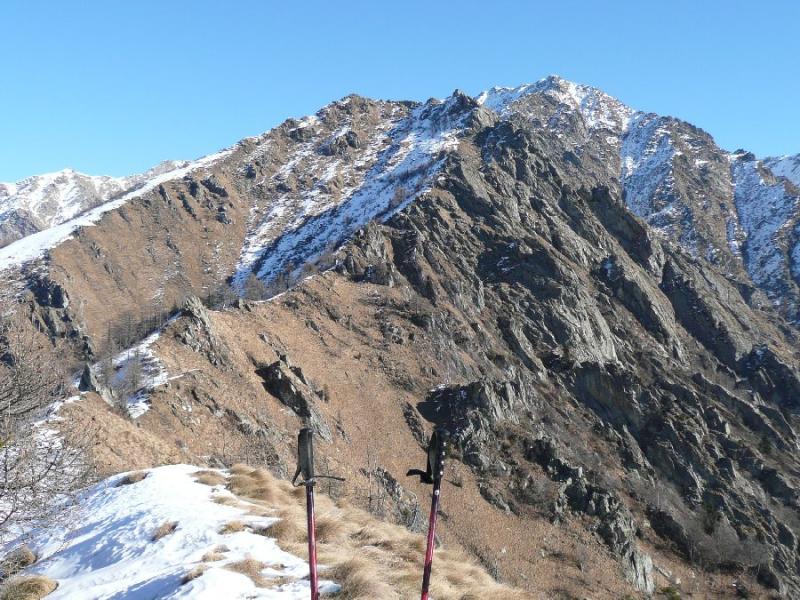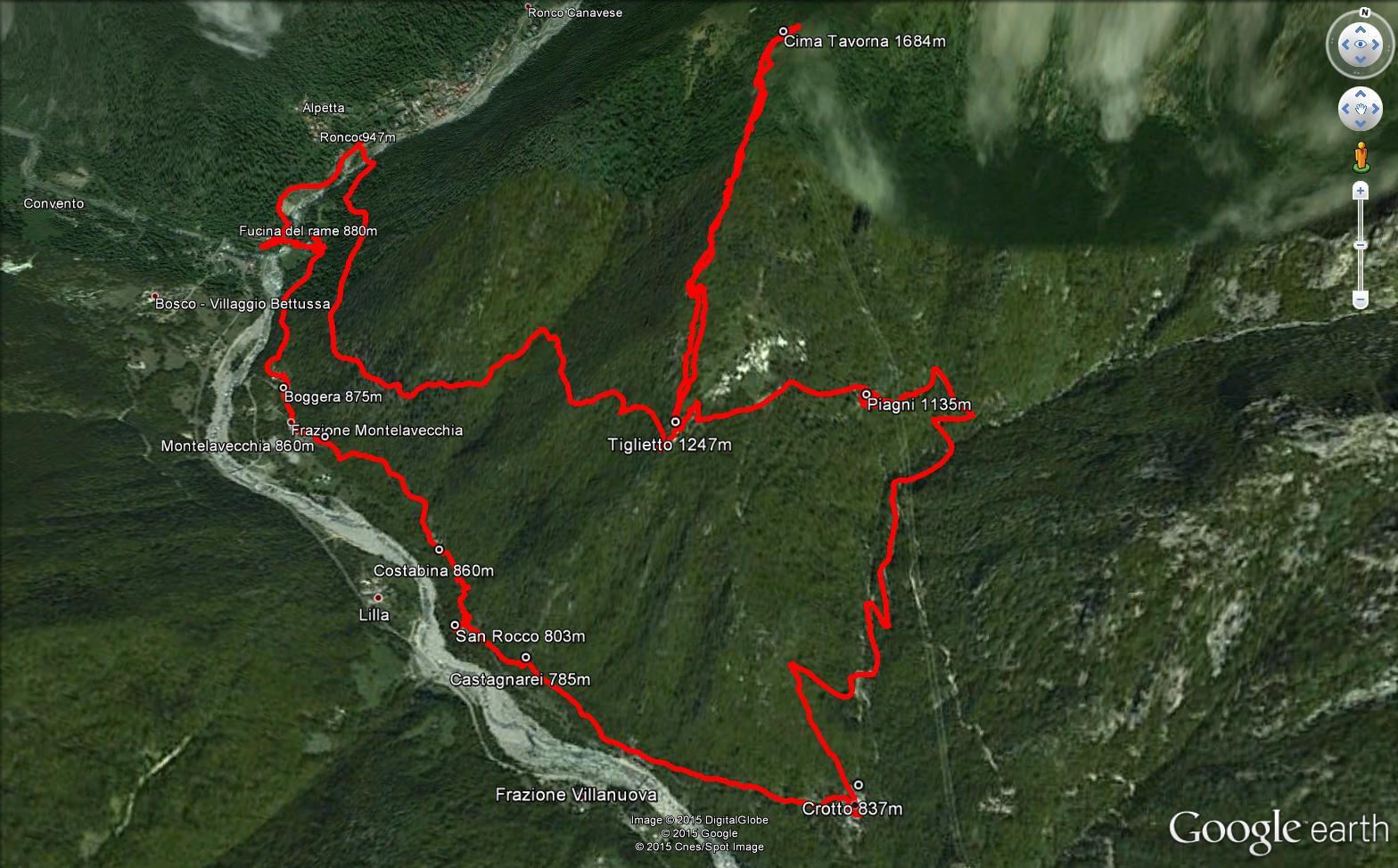 Giunti davanti alla chiesa non si prosegue verso la borgata ma a sx su un sentiero segnato con tacche gialle. (molto probabilmente queste tacche servono ai tecnici dell’azienda elettrica x raggiungere il traliccio posto poco sotto la cima) il sentiero sale ripido nel bosco seguendo la dorsale verso la cima, giunti al traliccio con un ultimo strappo su pendio erboso si tocca cima Tavorna 1685m.