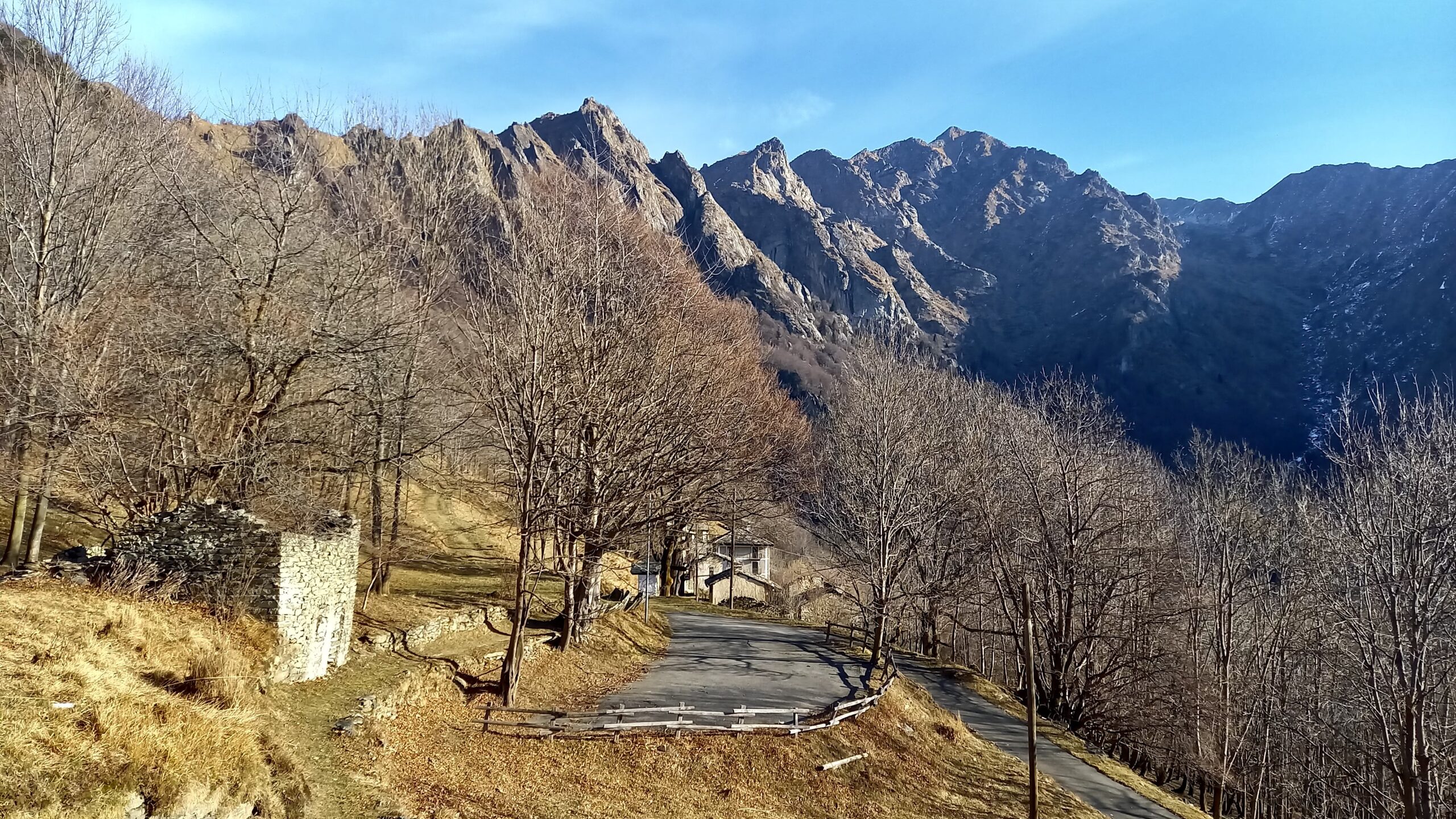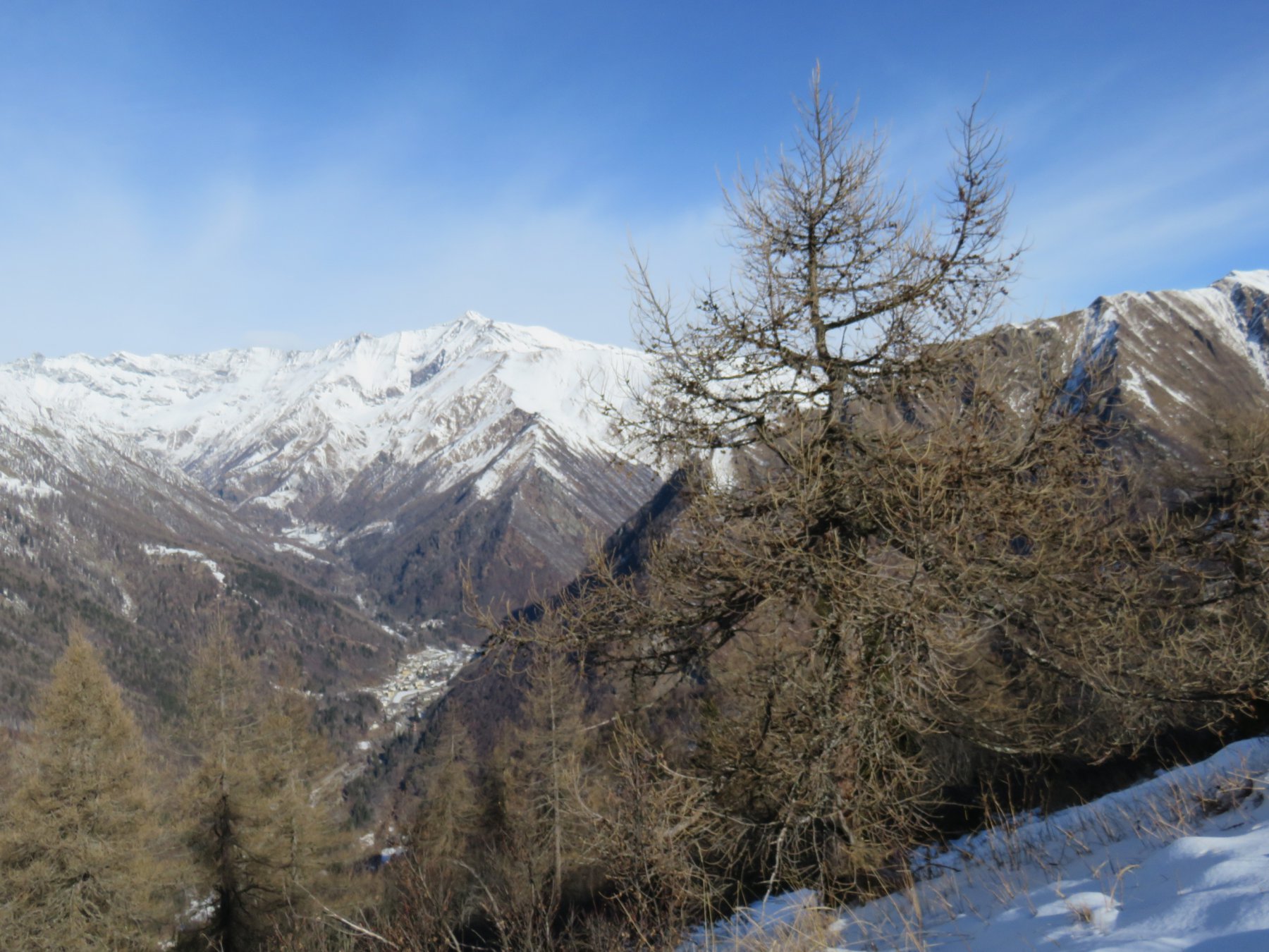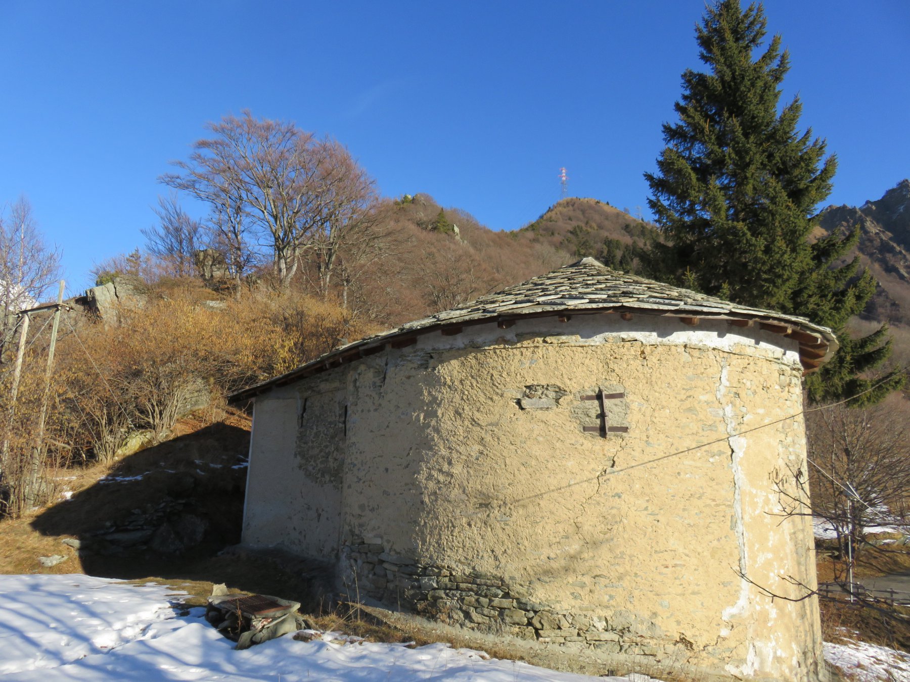 Giunti davanti alla chiesa non si prosegue verso la borgata ma a sx su un sentiero segnato con tacche gialle. (molto probabilmente queste tacche servono ai tecnici dell’azienda elettrica x raggiungere il traliccio posto poco sotto la cima) il sentiero sale ripido nel bosco seguendo la dorsale verso la cima, giunti al traliccio con un ultimo strappo su pendio erboso si tocca cima Tavorna 1685m.