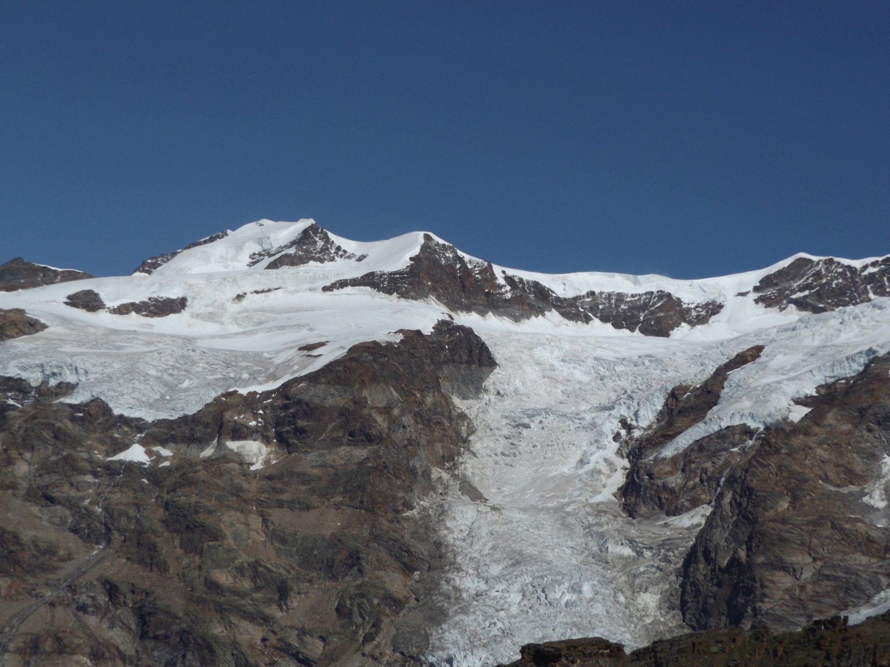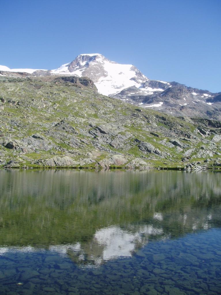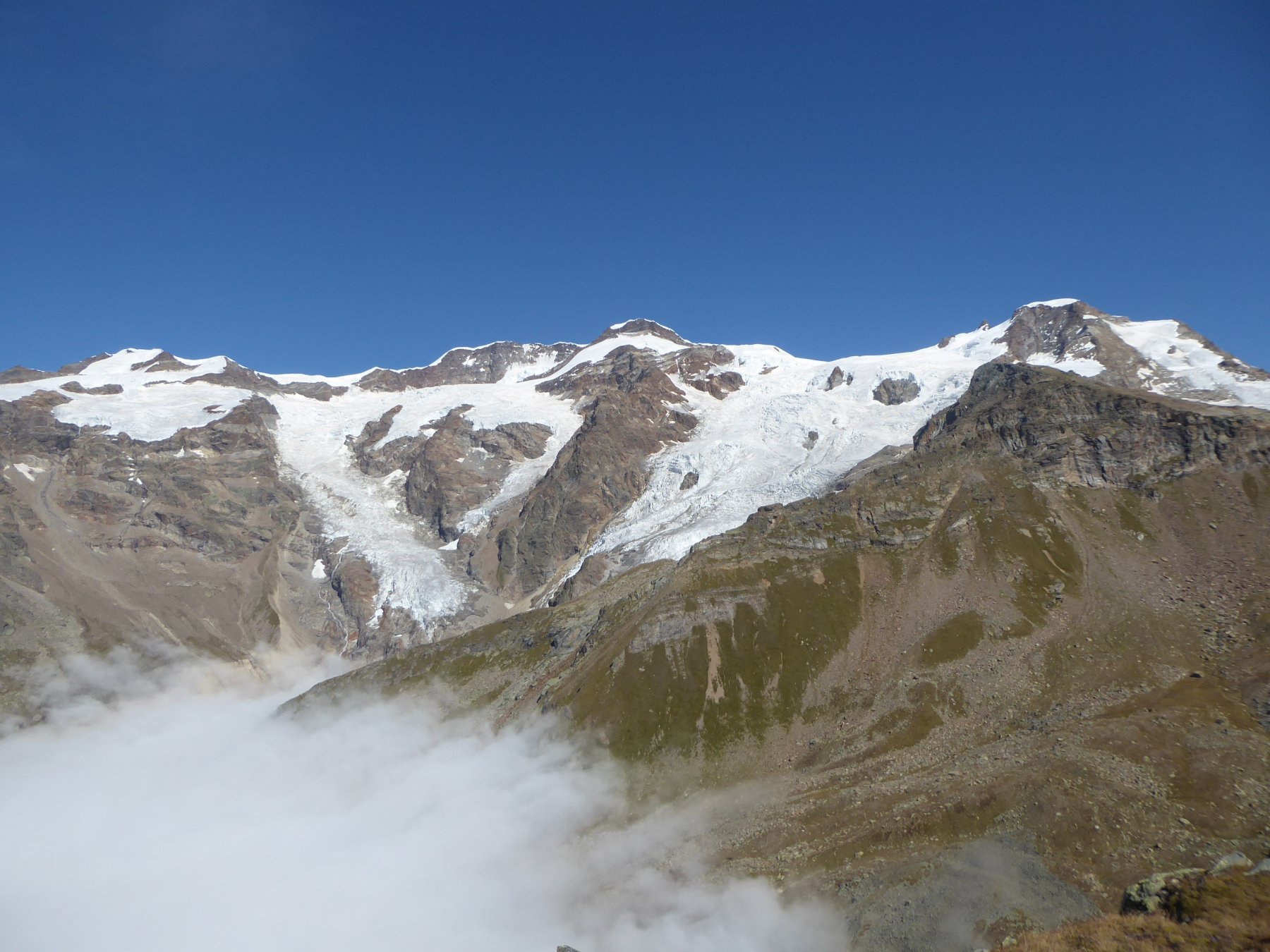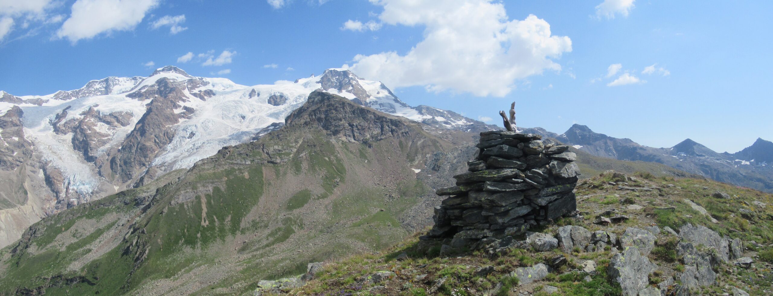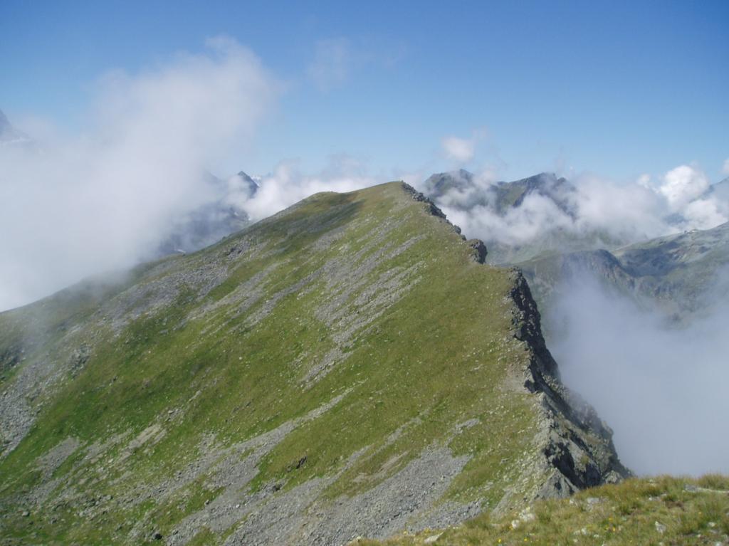 Superato il ponticello, si raggiungono i vicini alpeggi denominati Becksch Gaveno 2424 m e poco oltre Welfsch Gaveno 2456 m. Passando a monte di essi si individua una specie di sentiero pianeggiante che in realtà è stato realizzato per le tubature dell’acqua, e termina proprio a Welfsch Gaveno. Qui ora non si trovano tracce di sentiero segnalate, ma utilizzando le numerose tracce di bestiame, e facendosi aiutare dagli enormi ometti posti sul crinale erboso sovrastante, non ci sono problemi nel proseguire. Si inizia ora un lungo traverso ascendente verso Ovest, senza percorso obbligato (talvolta appaiono sentieri molto evidenti) raggiungendo una sella a circa 2700 m posta al di sotto del crestone sud-est che si origina dalla cima. Lo si risale, dapprima su terreno erboso poi attraversando una breve pietraia, per poi raggiungere l’ometto della cima 2833 m.