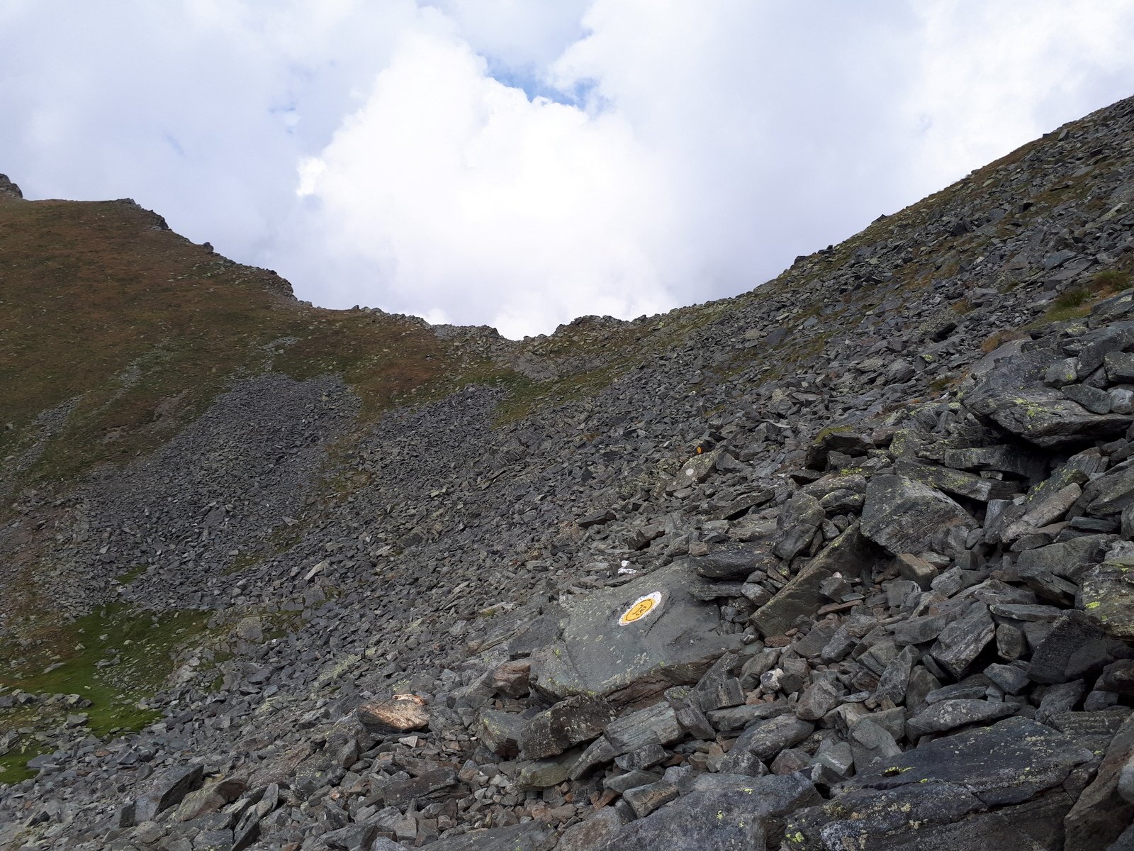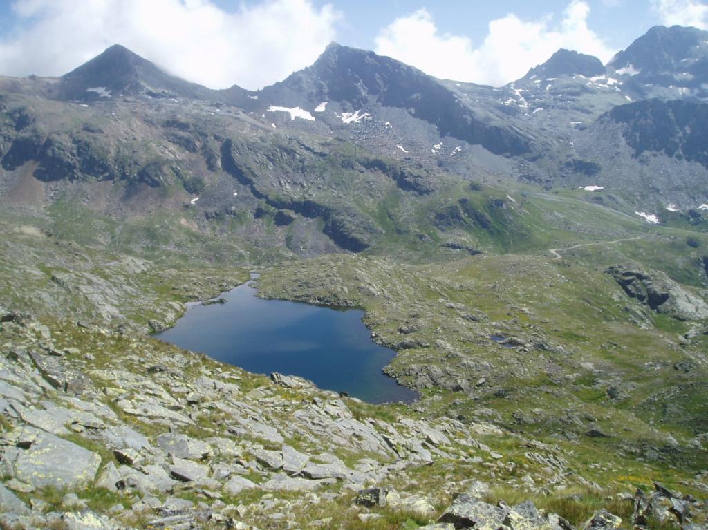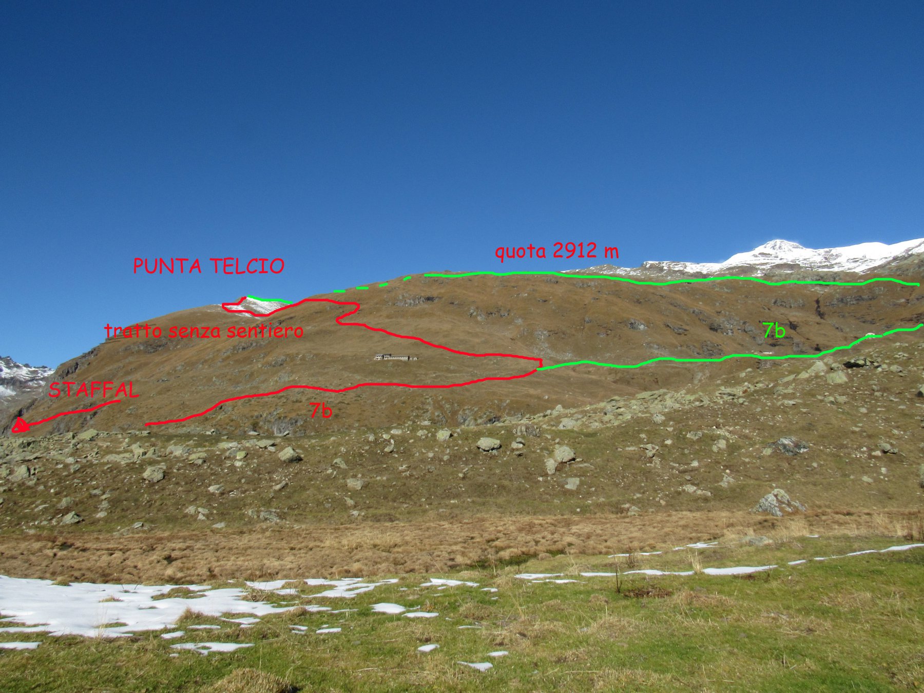 Si prosegue sul segnavia 6a-7b lasciando in basso a destra un piccolo lago artificiale e si sale con alcuni tornanti. A a quota 2600 m circa, in corrispondenza di un affioramento di rocce rosse, i percorsi si dividono. Si segue il 7b verso sinistra e in pochi passi si giunge a un piccolo lago, stavolta naturale, Lago Verde su alcune carte. Ancora un quarto d’ora, seguendo sentiero e ometti, e si raggiunge un altro lago più grande (Lago Blu). Si continua ancora per qualche minuto poi c’è la possibilità di perdere le segnalazioni. In questo caso proseguire verso est alla base del pendio delle quote 2832 m e 2912 m. Da qui volendo si può salire su questa cima che sulle carte viene solo quotata (si può definire Punta Telcio Est), mentre invece la vera Punta Telcio è molto più avanti allungata ad Ovest. Si giunge così in una valletta, sulla cui poco marcata cresta di sinistra si trovano le segnalazioni 7b. Si può anche salire il fondo della valletta senza sentiero ma con percorso evidente lungo un torrentello. In ogni caso si arriva a una piccola sella, al culmine della valletta, oltre il quale ci sono una conca e la Punta Telcio. Lungo il percorso valutare bene se seguire indicazioni 7b che scendono molto ripidamente a un altro lago (segnalato sul posto come Lago Verde) e conducono poi sulla cresta della valletta oppure se attraversare la valletta più avanti o seguirne il fondo come detto prima.
