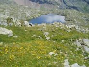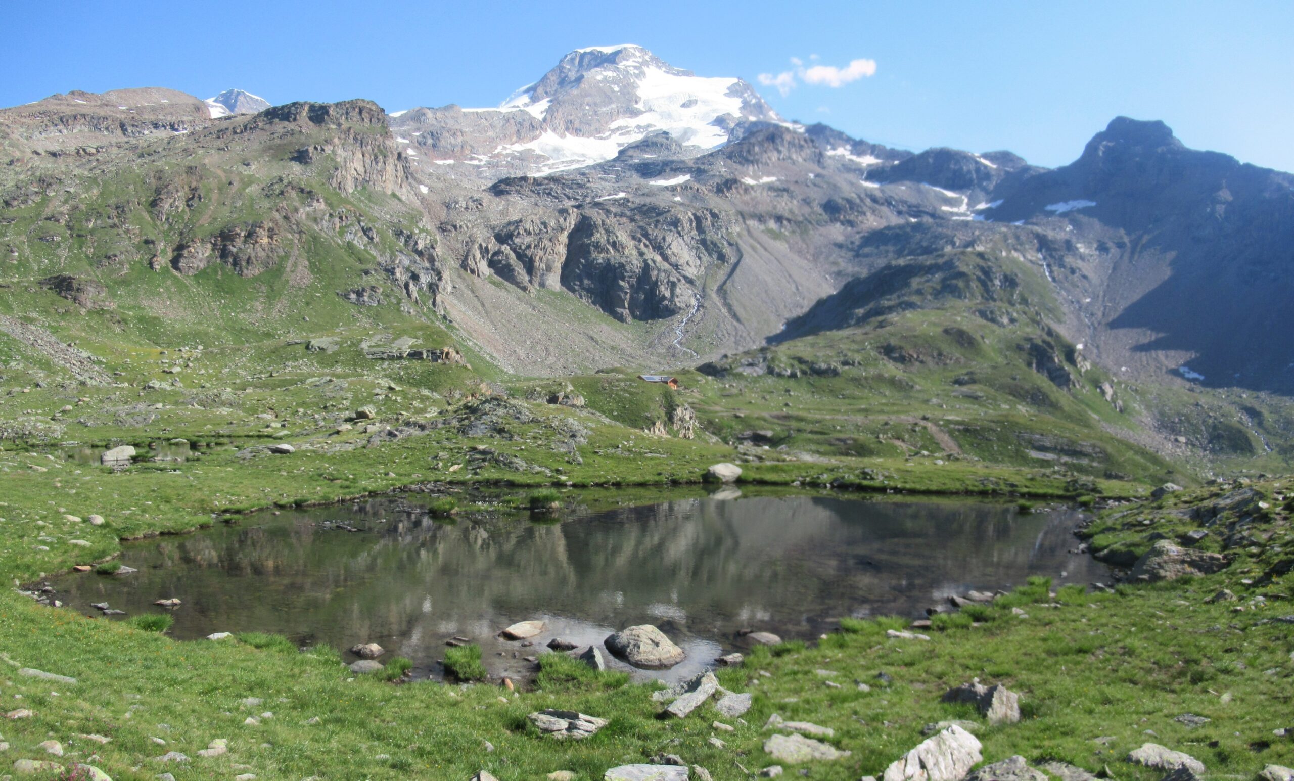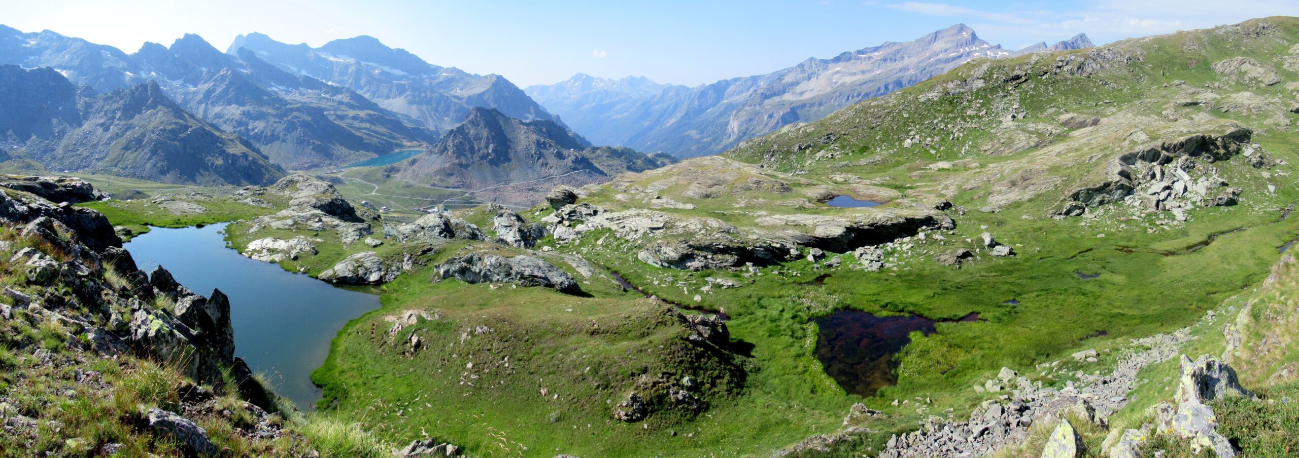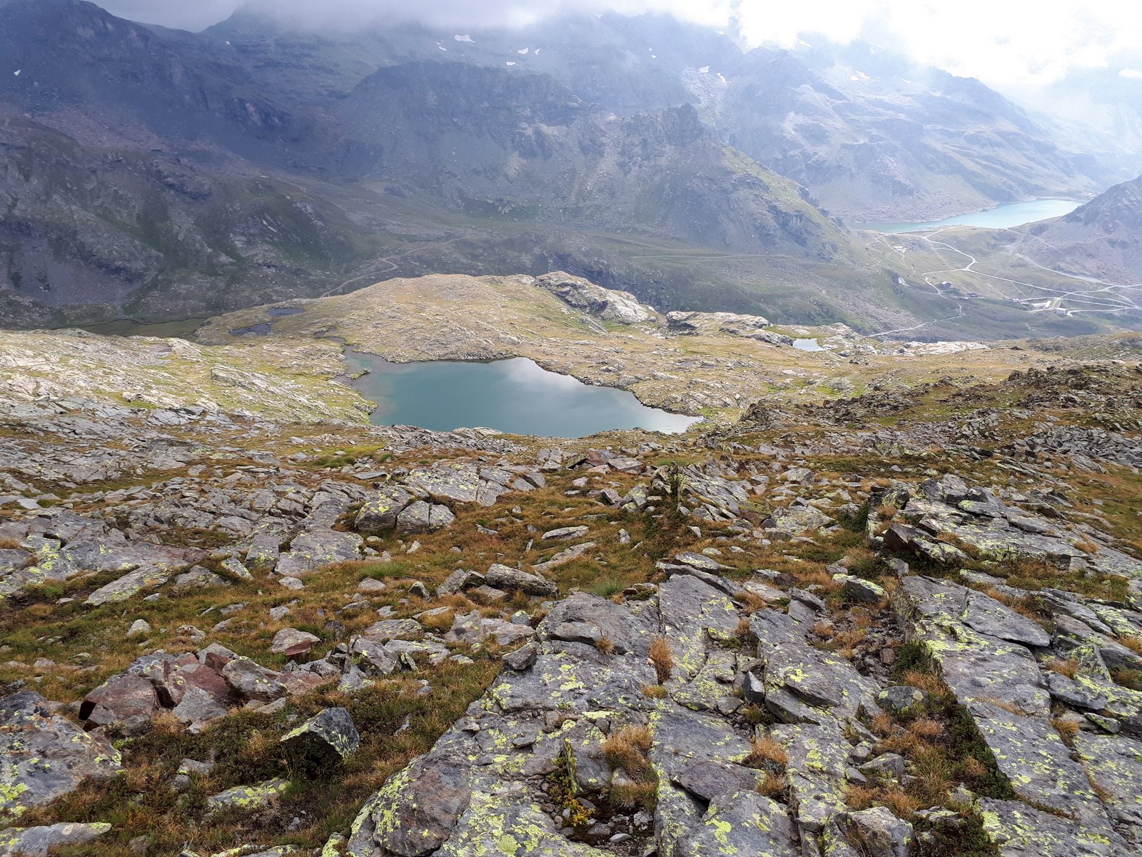 Si prosegue sul segnavia 6a-7b lasciando in basso a destra un piccolo lago artificiale e si sale con alcuni tornanti. A a quota 2600 m circa, in corrispondenza di un affioramento di rocce rosse, i percorsi si dividono. Si segue il 7b verso sinistra e in pochi passi si giunge a un piccolo lago, stavolta naturale, Lago Verde su alcune carte. Ancora un quarto d’ora, seguendo sentiero e ometti, e si raggiunge un altro lago più grande (Lago Blu). Si continua ancora per qualche minuto poi c’è la possibilità di perdere le segnalazioni. In questo caso proseguire verso est alla base del pendio delle quote 2832 m e 2912 m. Da qui volendo si può salire su questa cima che sulle carte viene solo quotata (si può definire Punta Telcio Est), mentre invece la vera Punta Telcio è molto più avanti allungata ad Ovest. Si giunge così in una valletta, sulla cui poco marcata cresta di sinistra si trovano le segnalazioni 7b. Si può anche salire il fondo della valletta senza sentiero ma con percorso evidente lungo un torrentello. In ogni caso si arriva a una piccola sella, al culmine della valletta, oltre il quale ci sono una conca e la Punta Telcio. Lungo il percorso valutare bene se seguire indicazioni 7b che scendono molto ripidamente a un altro lago (segnalato sul posto come Lago Verde) e conducono poi sulla cresta della valletta oppure se attraversare la valletta più avanti o seguirne il fondo come detto prima.