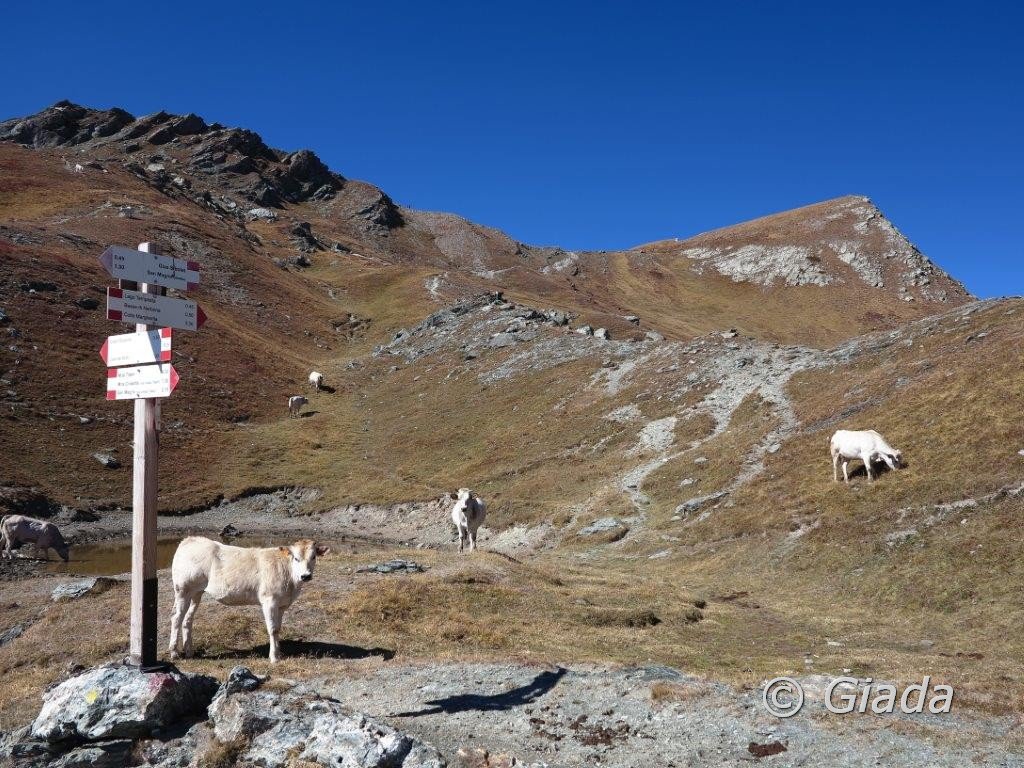 Dal lago Tempesta, scavalcato un piccolo colletto, risalire al Colle Intersile (sent. segnalato). Dal Colle Intersile a/r al Monte Tibert per la cresta Est. Tornati al Colle Intersile con bel sentiero in traverso raggiungere il Colle Sibolet, proseguire sul sentiero di cresta verso Sud scavalcando il Monte Pelvo, quindi piegare a sinistra, scendere al colletto sotto la Rocca Negra (salita facoltativa a quest’ultima, EE) e quindi scendere al Colle d’Esischie e al parcheggio presso il Gias Fauniera.
