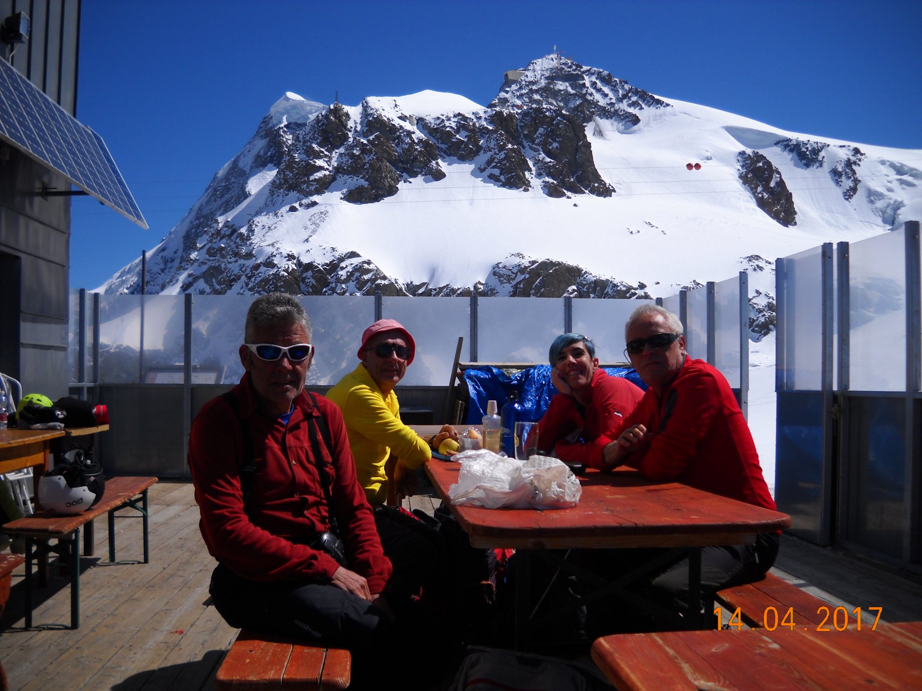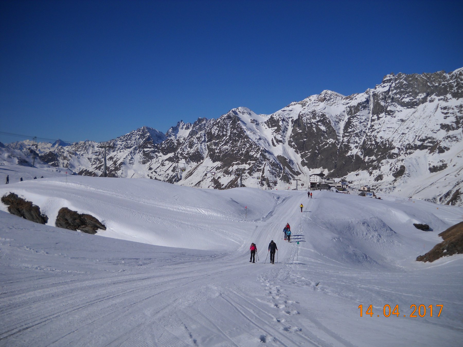 Gita anche oggi spazziale saliti in 2.30 da plan maison tanta gente sulle piste, noi sulla pista di servizio segnata dai paletti verdi nessun problema,nuvole assenti anche oggi panorama fantastico a 360° il cervino domina sempre la scena,saliti con il solito gruppo Margherita Marzia Ivana Piero Riccardo Luciano Ezio Mauro e Beppe un saluto a tutti e Auguri…