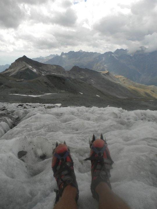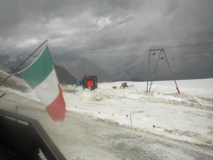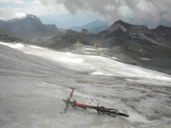 arrivato fino al Rif. Guide, biga abbandonata 50m sotto l’uscita del ghiacciaio. Giunto alle cime bianche e visto il colle ormai vicino e nn sapendo dove nascondere la mtb.. l’ho portata su! ghiacciaio Ventina tutto scoperto, poco inclinato e con pochi piccoli crepacci, usati comunque i ramponi, uscita un pò più ripida su neve, appena battuta dal gatto. Merenda al rifugio e giù (a piedi eh), ritorno a cime bianche e discesa per il bike park, molto bello e consigliabile. La parte alta è liscia e veloce, quella bassa molto tecnica, tra paraboliche e ponticelli. Ovviamente molti pezzi a piedi, serve una full e un pò di pelo, con quella da xc si combina poco.. Qualche goccia in tarda mattinata, poi bello, su si sghia ancora..