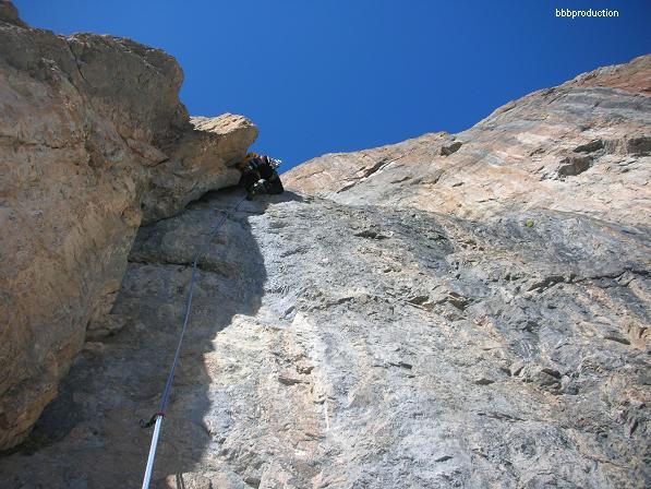 L3: traverso delicato su piccole reglettes e pancia,6a/b a questa sosta conviene attraversare per cengia comoda verso sx per 8/10 mt per andare a reperire la sosta 3 bis(spit da collegare)