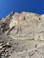 Salendo per pascoli e pietraie su sentiero incerto e facile da smarrire si perviene al pianoro detritico sottostante la parete; attraversata una zona di blocchi si giunge alla base.