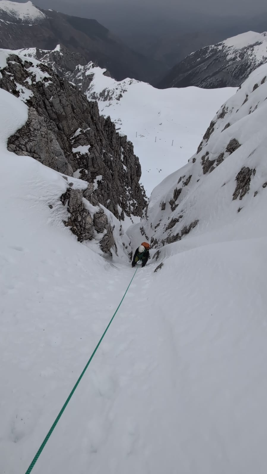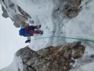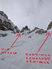Dal rifugio Sebastiani ci si avvicina, andando a vista, verso la parete est del Terminillo, fino a raggiungere i piedi dell’evidente e noto Canalone Centrale. Da qui è consigliabile indossare tutto il materiale di cordata e proseguire in conserva lungo il ripido pendio (35-40°) che porta all’imbocco del Canalone. Una volta dentro il Canalone (40-45°, F) si prosegue la risalita per un centinaio di metri circa. Superata la sua metà il Canalone tende ad aprirsi in una sorta di anfiteatro, che ne precede l’uscita. Prima di arrivare a questo punto, però, lo sguardo va rivolto allo sperone roccioso alla nostra sinistra, dove si noterà un evidente e ripido canale che lo risale diagonale: è l’attacco della via Nicola. Questa variante sale subito ripida (circa 55°) con una larghezza variabile dagli 1 ai 3 metri e una lunghezza di circa 120. Il punto più stretto è anche quello più impegnativo, poiché presenta un saltino ghiacciato con pendenza più pronunciata (65°). Sebbene il passaggio sia molto breve (un paio di metri) occorre fare una certa attenzione e potrebbe essere utile proteggerlo con una vite da ghiaccio. Superata questa difficoltà la via prosegue riportandosi sui 55° di pendenza, aprendosi e avviandosi a finire. Una volta giunti sulla sommità del canale, si prosegue a destra per uno stretto tratto di cresta, che sovrasta l’uscita classica del Canalone Centrale per poi arrivare direttamente in vetta al Terminillo (2216 m). Occorre specificare che, seppur breve, la difficoltà della via non è da sottovalutare, specialmente in condizioni di scarso innevamento, quanto i salti di ghiaccio/misto potrebbero passare da 1 a 3. La difficoltà, per questo, può variare da PD+ ad AD-. Si consiglia, quindi, di partire con tutto il necessario per una conserva corta ed anche con qualche protezione (friends, dadi e almeno una vita da ghiaccio da 16cm), nel caso in cui si volesse proteggere la conserva o si volesse fare un tiro di corda nel tratto più impegnativo. Non va assolutamente intesa come un’alternativa alla pari del classico Canalone Centrale, ma come una variante per alpinisti più esperti.