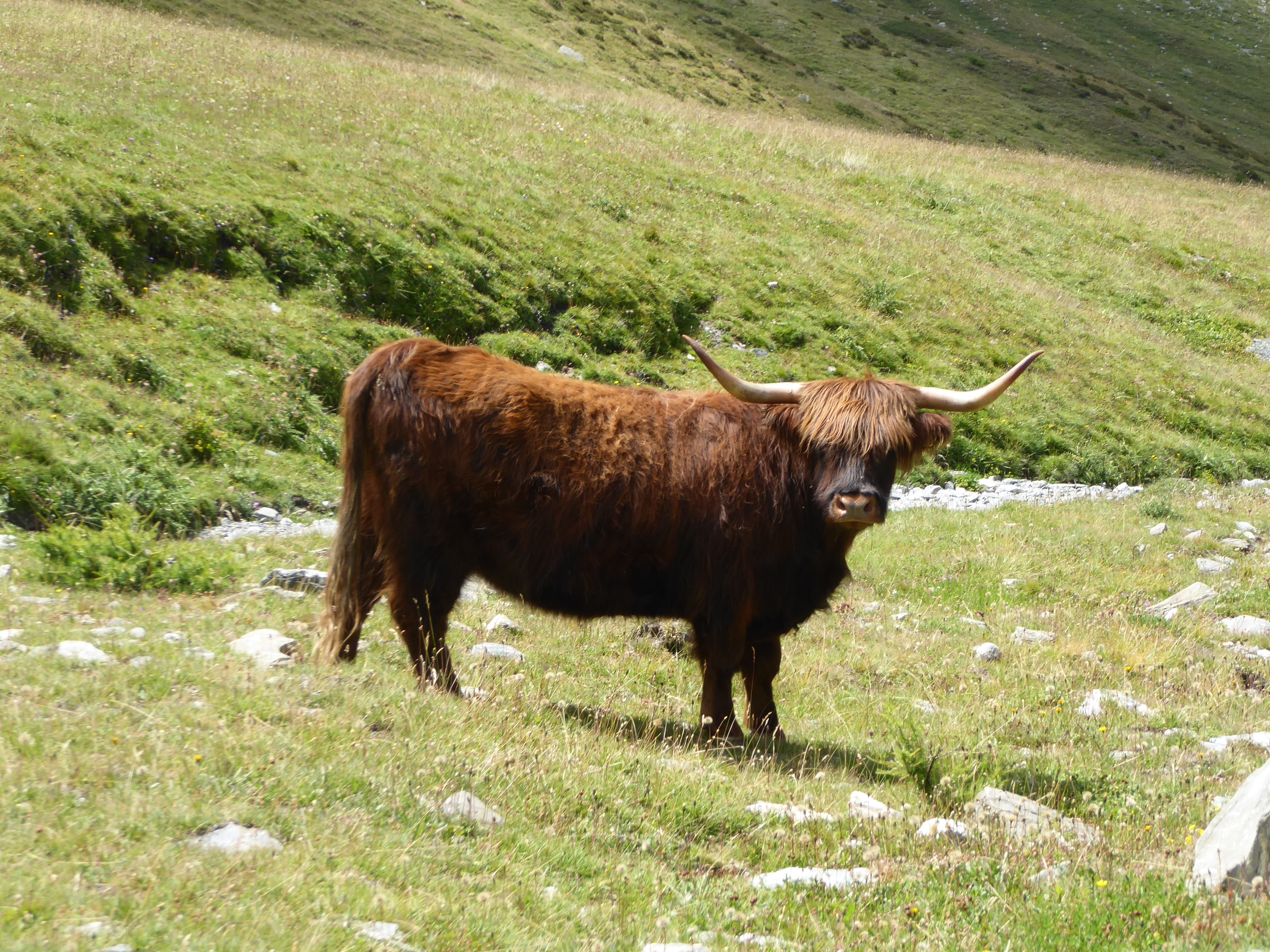 Raggiunto il Terra Nera siamo scesi al colletto omonimo e saliti alla cima W della Clausi (ometto di vetta) su terreno mobile e ripido e faticoso. A circa 2500 metri mandria di una trentina di mucche highlander; due grifoni.