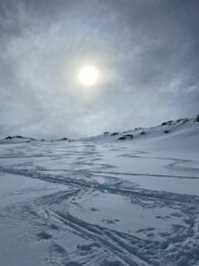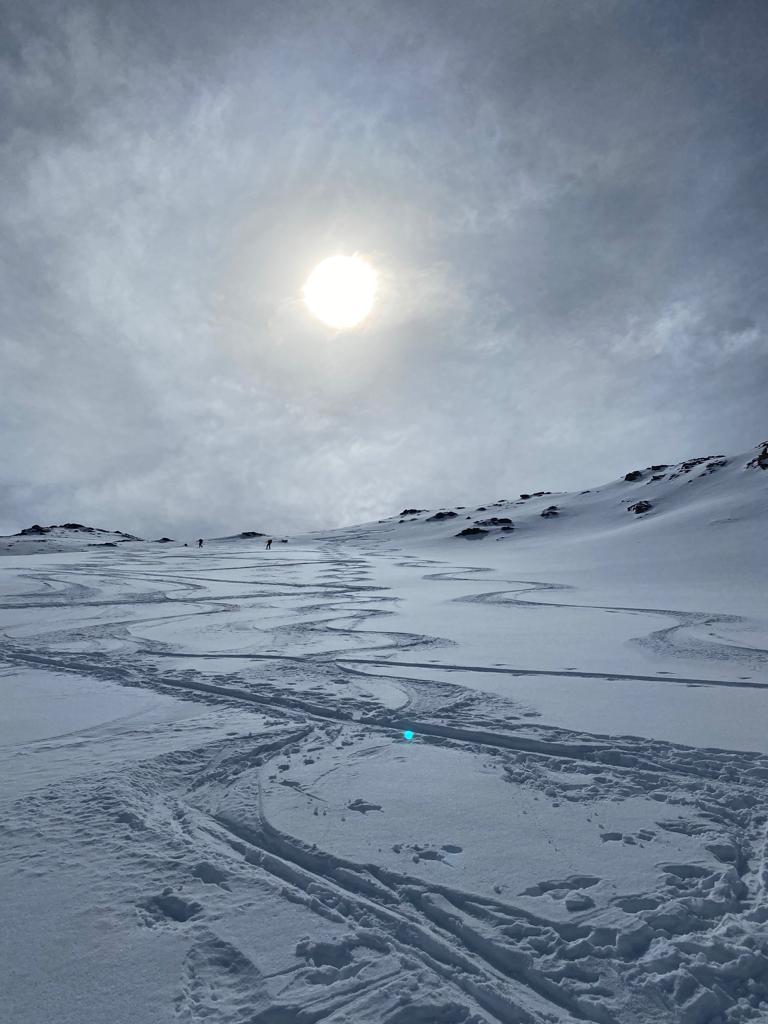 Incredibilmente dopo giorni e giorni di tritamento ancora ampi tratti di bella farinosa polverosa nella parte intermedia sotto la cima… neve dai tornanti 4 -5 brevi tratti senza neve .Con Giulia e Simone