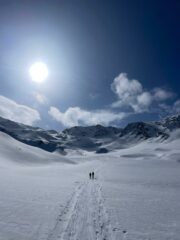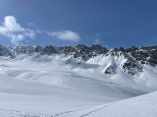 Tante inversioni nel bosco ma ottimamente tracciate. Lassu invece è tutto una pacchia! Neve un po’ rovinata dal vento e qualche vecchia traccia che si sente sotto gli assi, ma parliamo di finezze