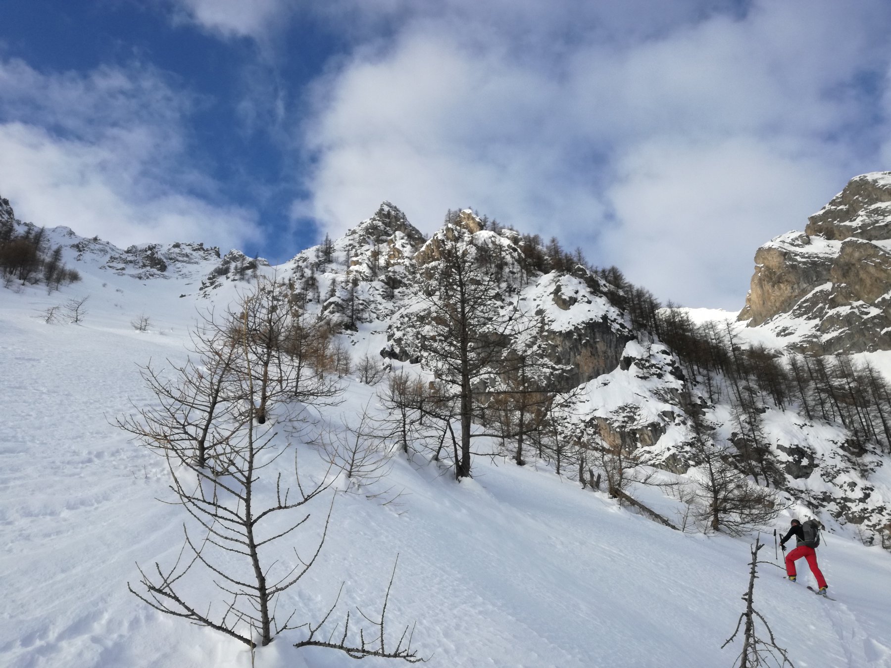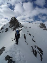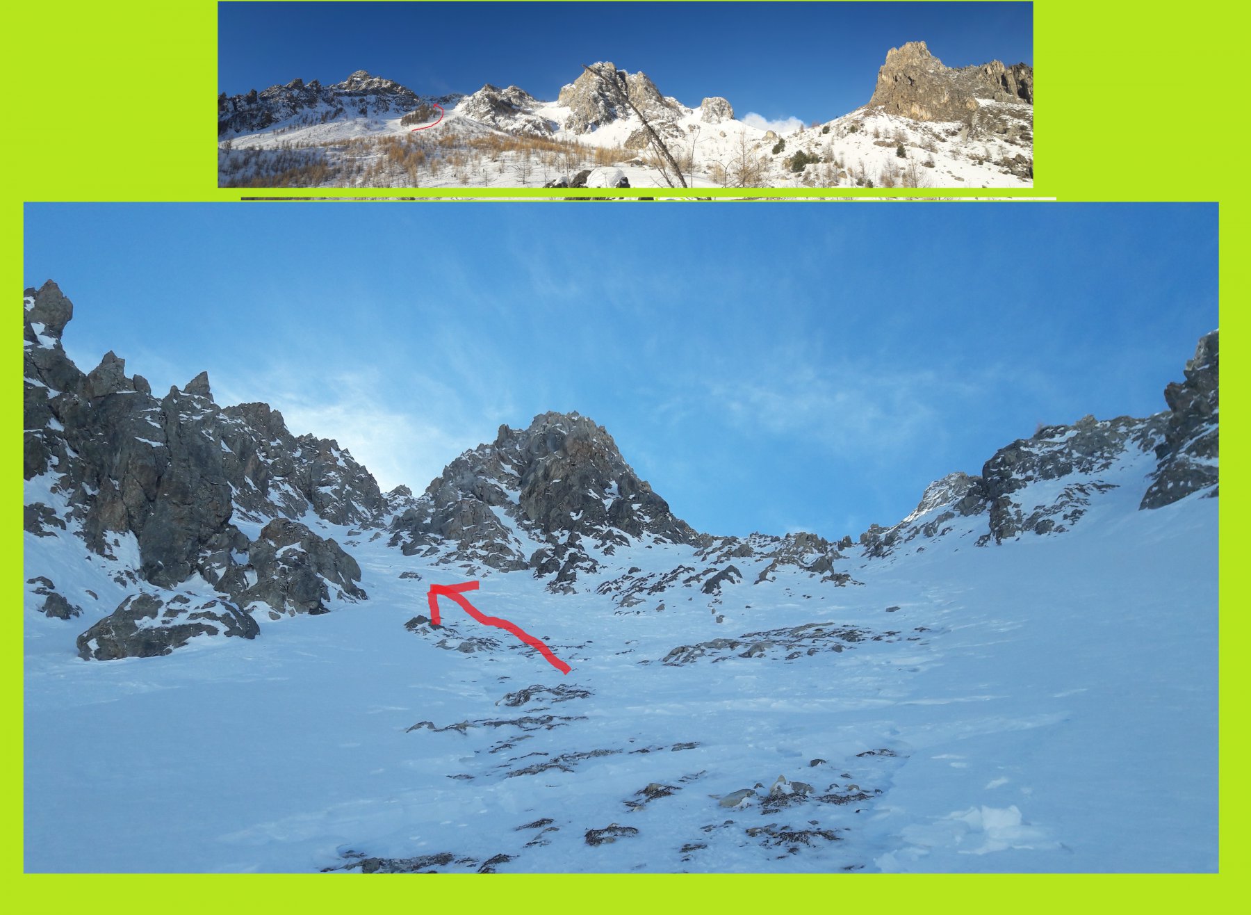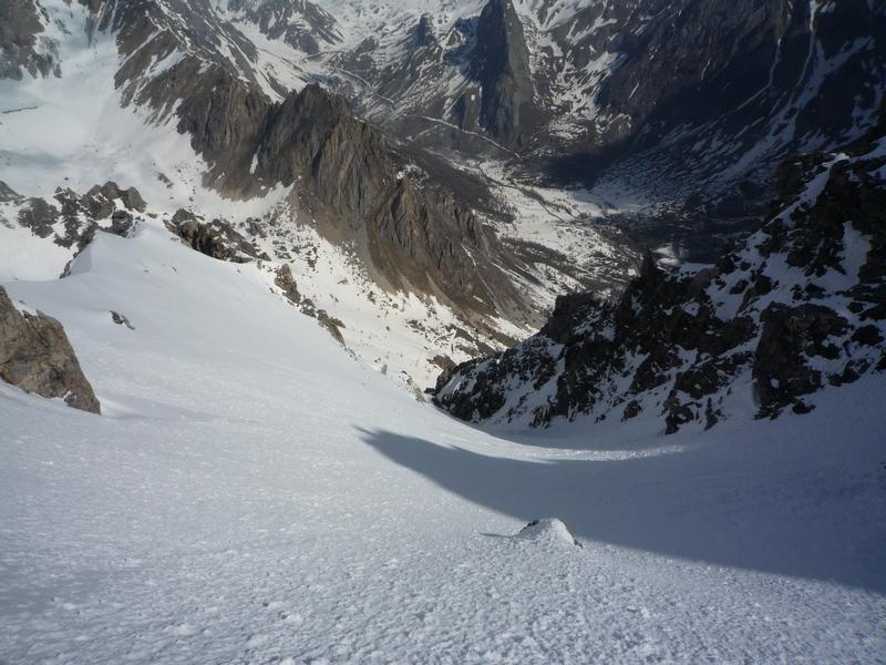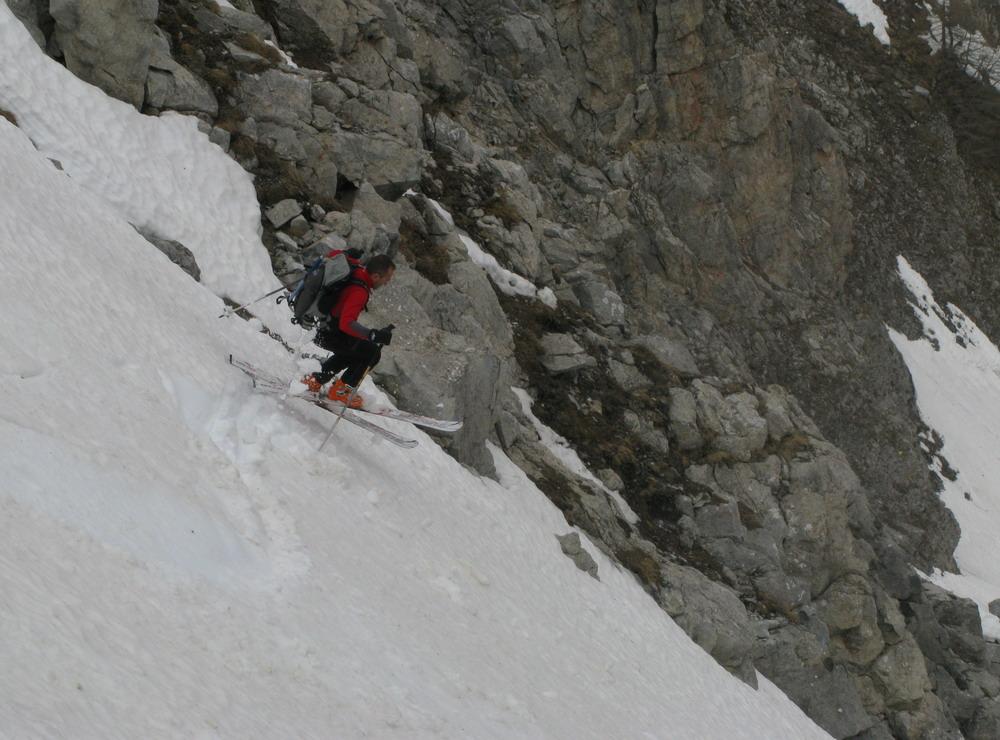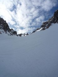 Per i primi 300 metri è un enorme canalone, poi si biforca : il canale di destra porta in cresta, gira e si ricongiunge in alto con quello di sinistra, quello di sinistra esce a pochi metri dalla punta