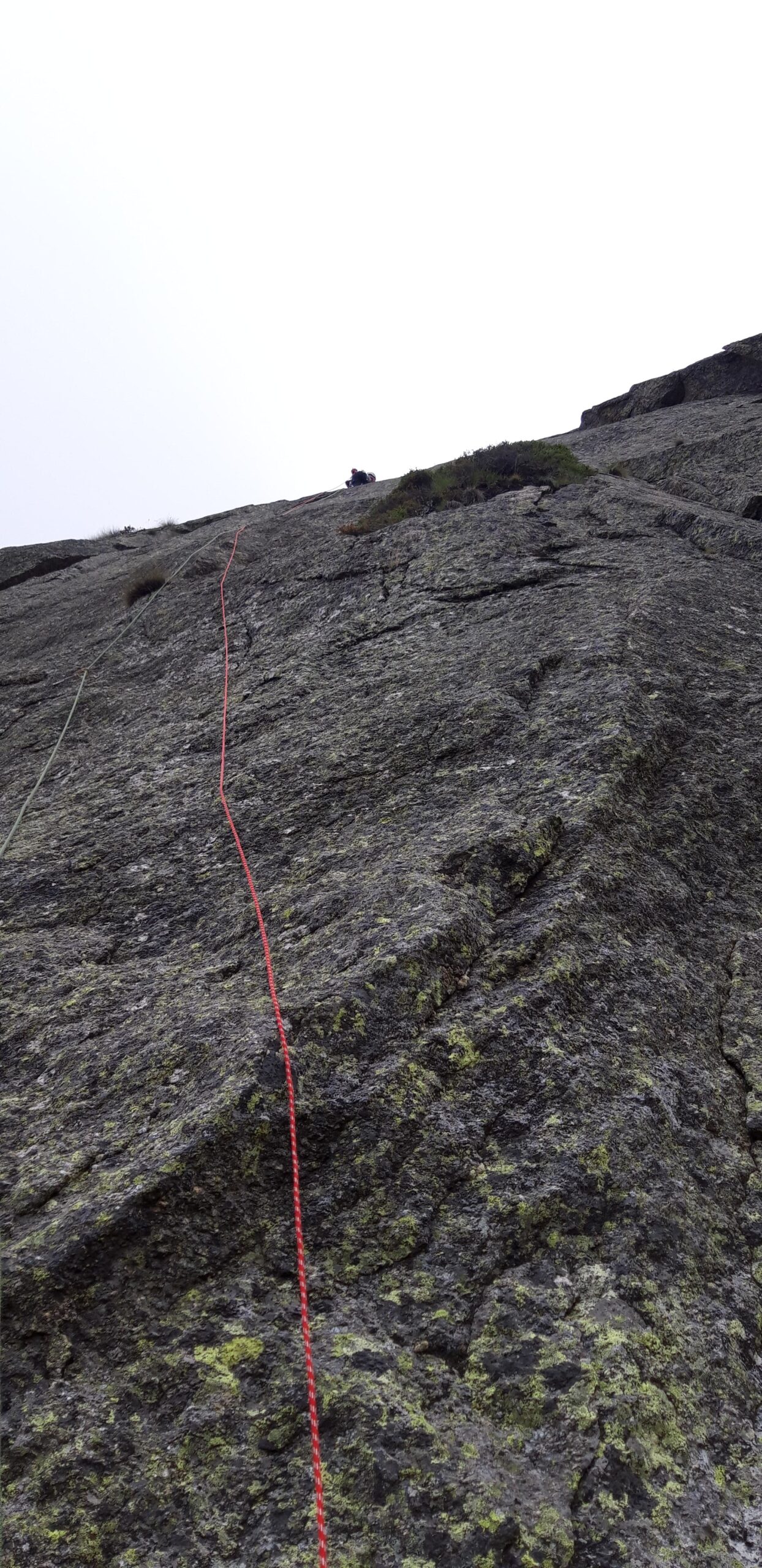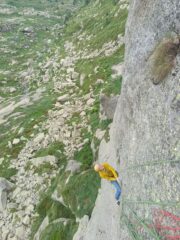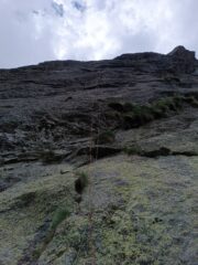 Attacca su un pulpito erboso a centro parete cieca 10m a sinistra di un enorme masso appoggiato alla parete. Linea rettilinea bellissima, specialmente il primo tiro, moooolto ingaggioso il secondo