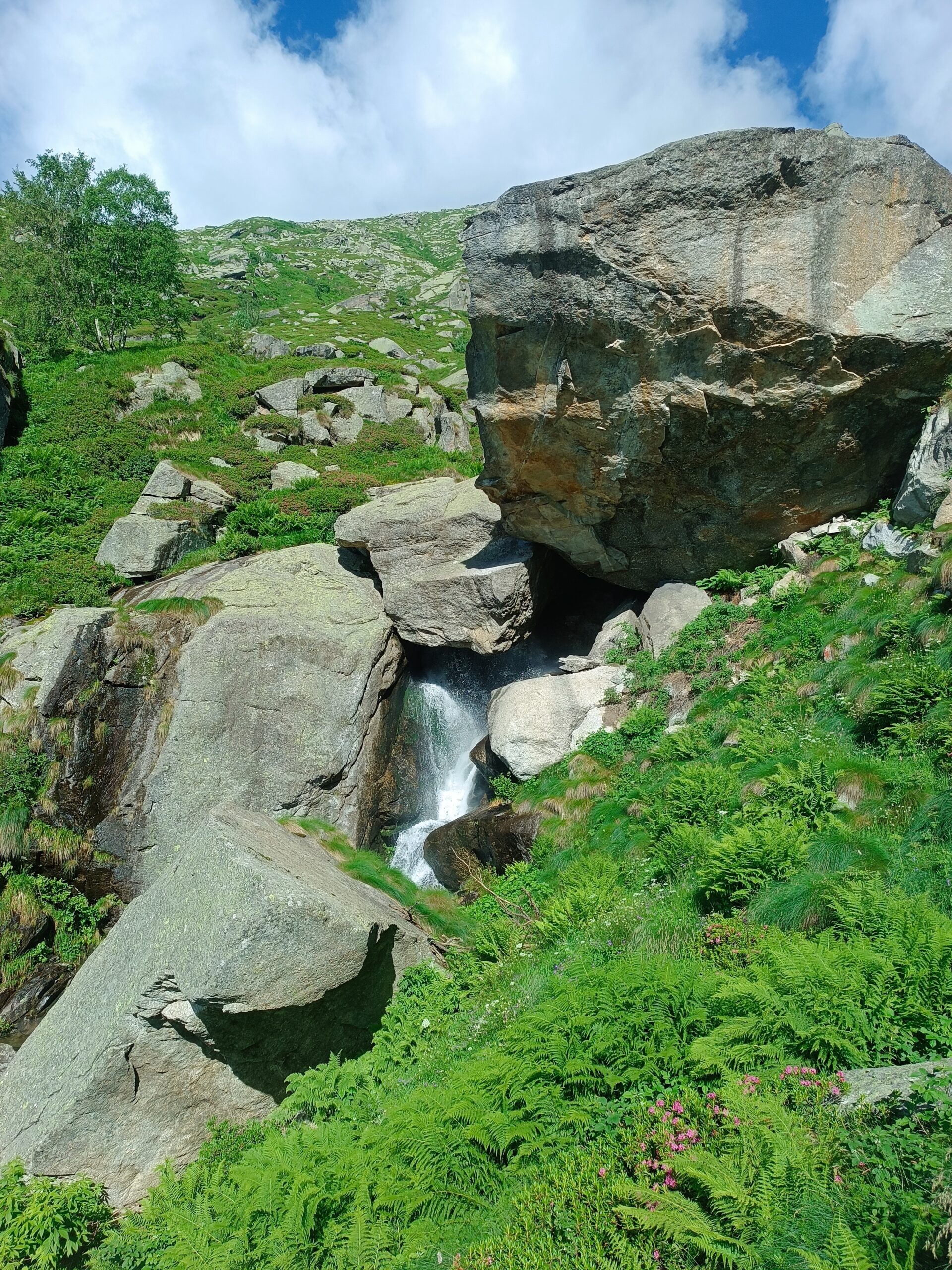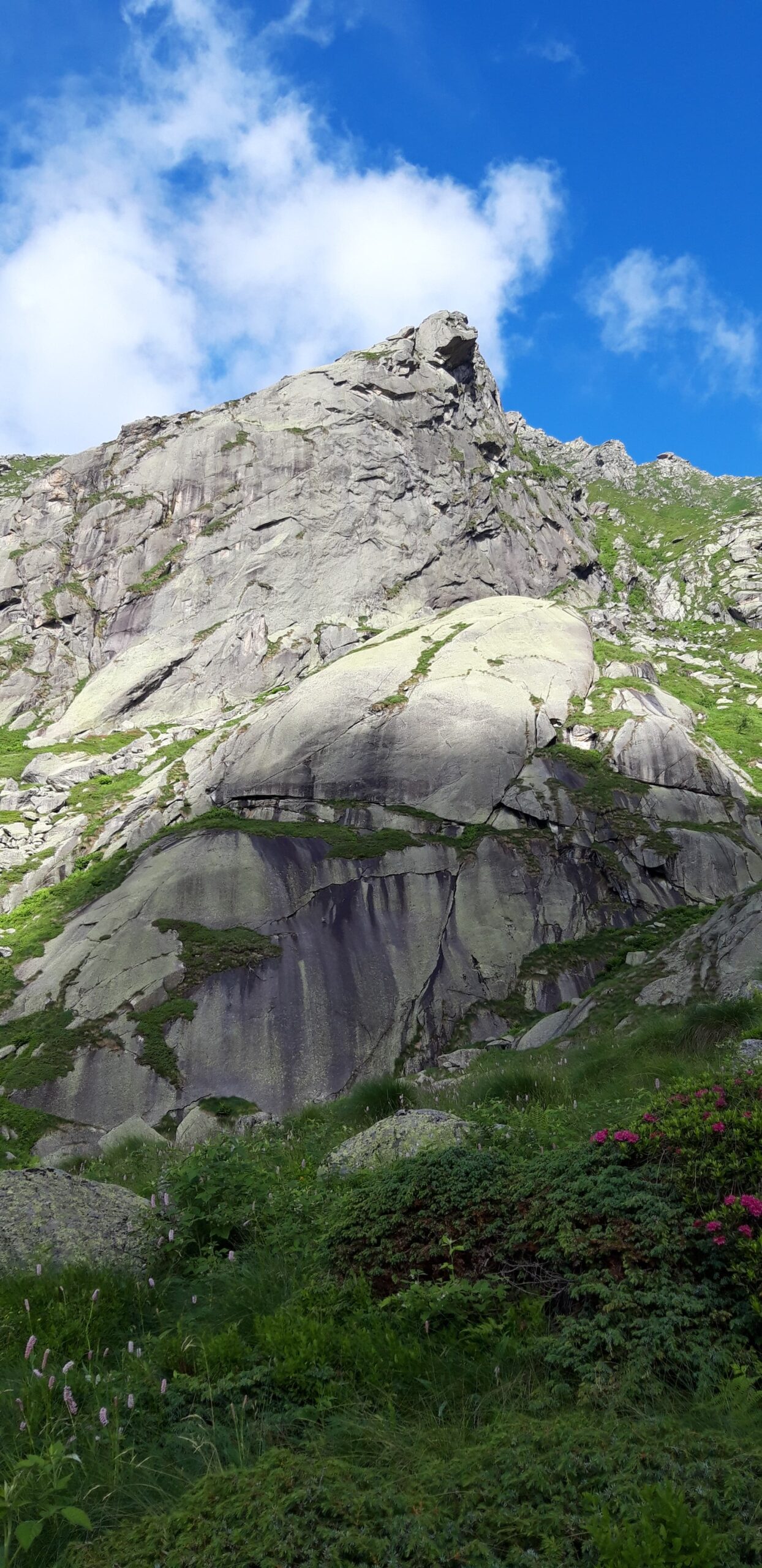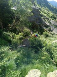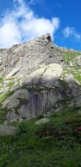 Attacca alla base dell’enorme masso appoggiato, a sinistra di una fascia di teppe orizzontale a qualche metro di altezza. Primo spit molto alto (facile), secondo vicino.