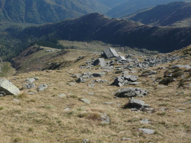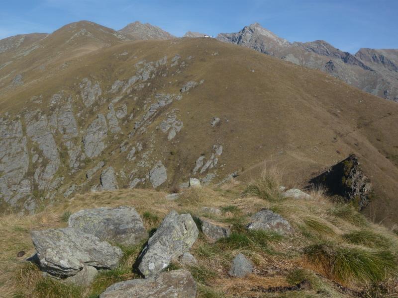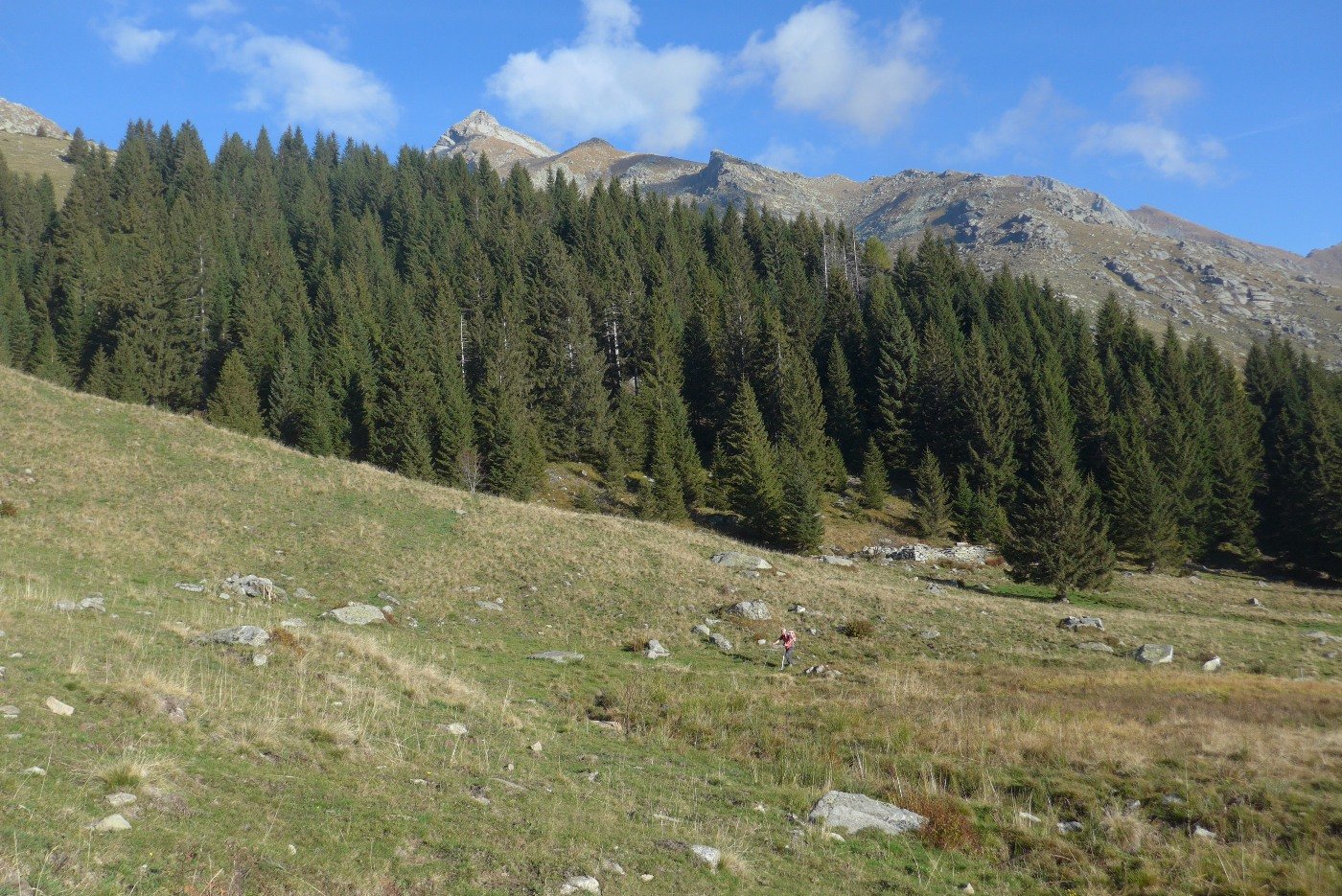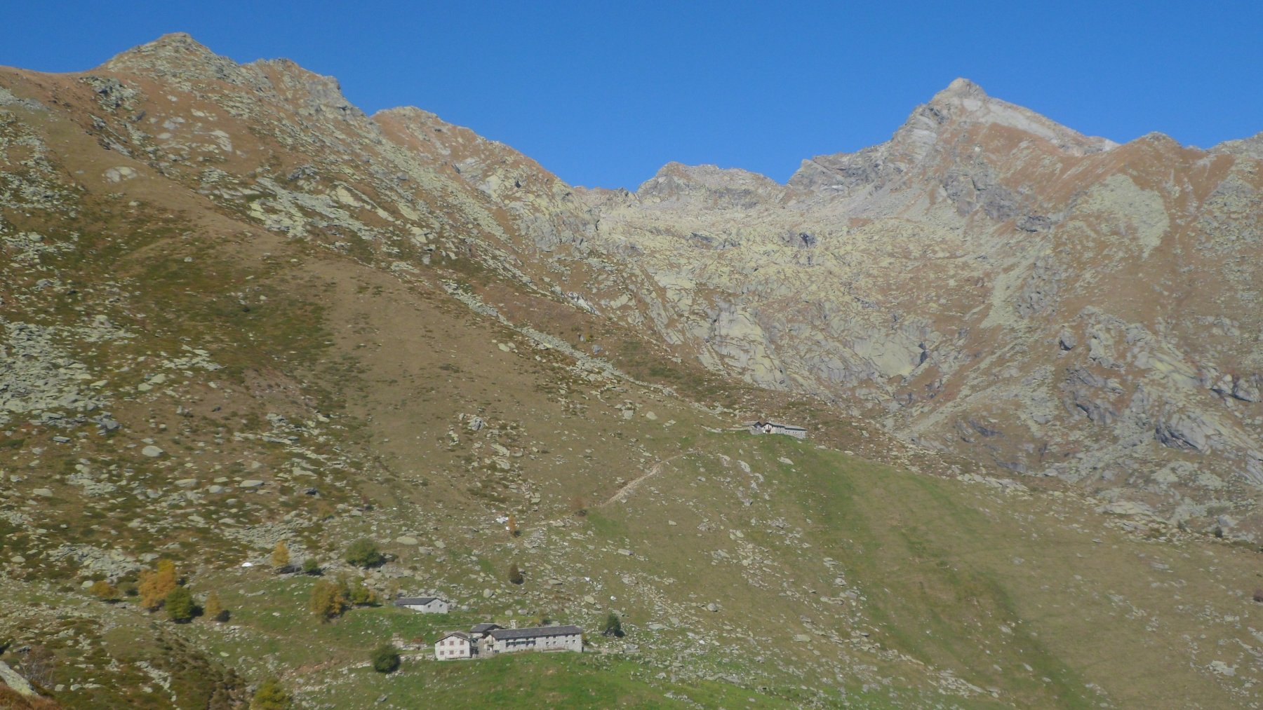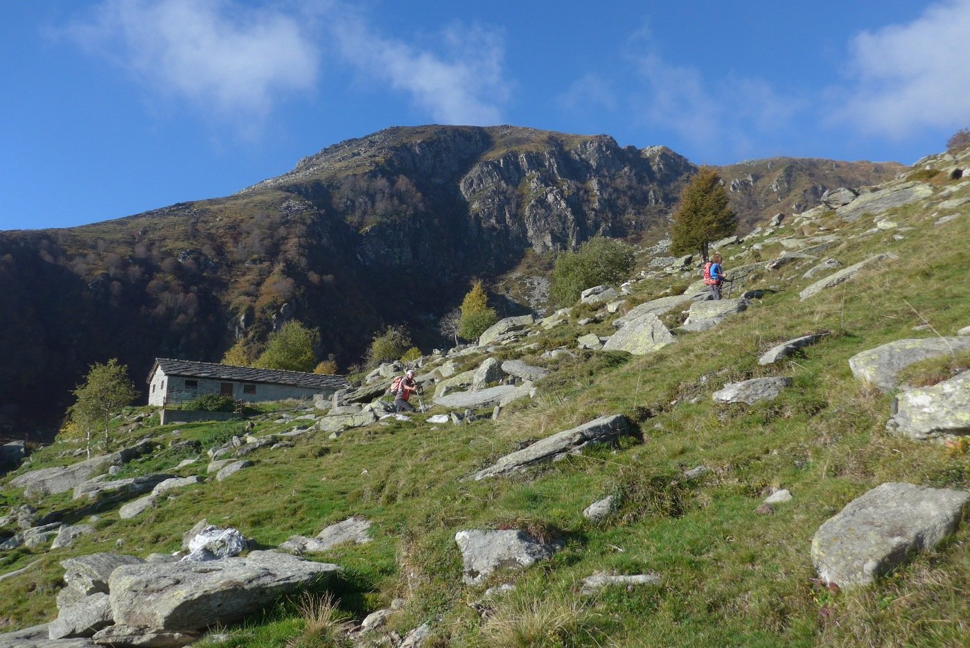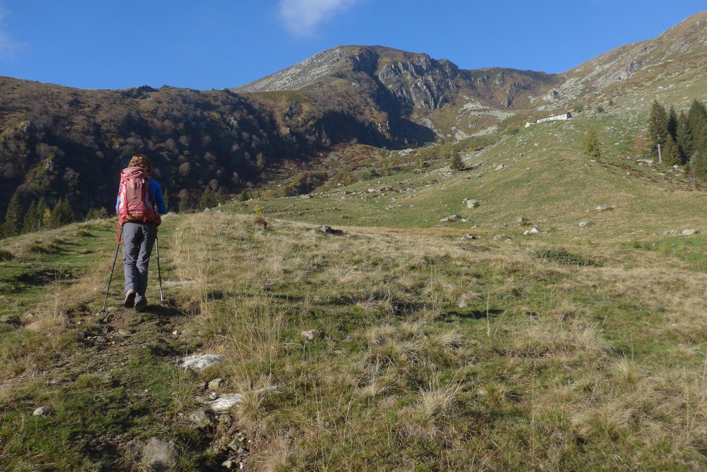 - Si torna dalla via di salita fino al colletto prima del Bivacco Blessent, che poi si raggiunge rapidamente; da qui si scende verso sud un po’ a sinistra su tracce di sentiero puntando al sottostante colle Busiera. Da qui si piega a sinistra (est) e si scende al meglio sui prati puntando alla sottostante Alpe Busiera, completamente ristrutturata. Quindi si scende sulla sterrata che, con alcuni saliscendi ci riporta al tornante sotto Posio, che si raggiunge con breve risalita sulla strada.