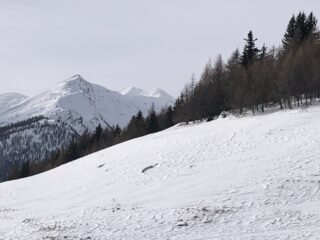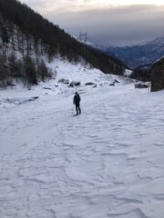 Neanche tanto freddo (-7), niente vento. Ben tracciato. Parte superiore con crosta da vento portante e sastrugi. Poi crosta non portante. Nel bosco nella farina ben sciabile. Infine stradina. Rotto lo scarpone a metà discesa purtroppo. Con Enri