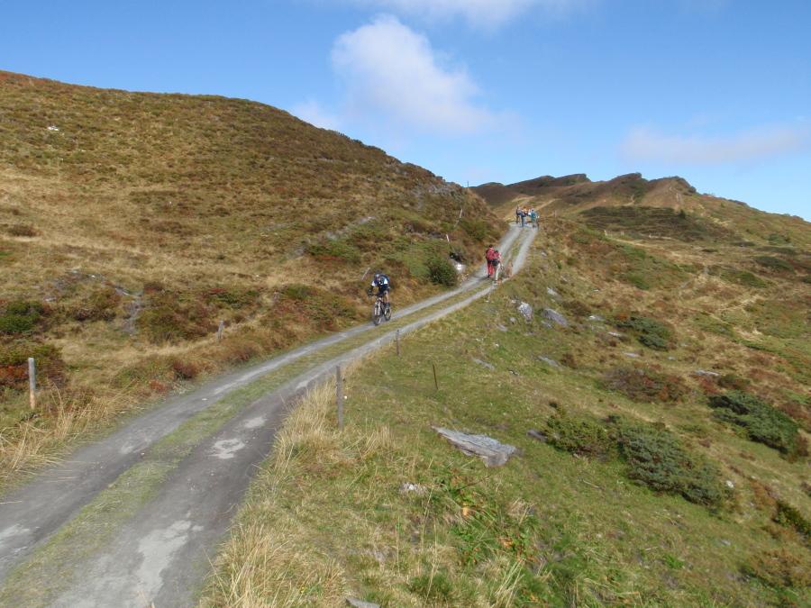 Dal parcheggio, ci si immette sulla strada per Thusis e una volta attraversata la cittadina, in corrispondenza della chiesa, si comincia la lunga salita. Da questo punto in poi, se non si ha a disposizione una traccia su GPS, basta seguire i cartellini indicante il tracciato bike n. 1. All’inizio si sale lungo la strada asfaltata, poi in prossimità di Masein, si abbandona la strada principale e si continua lungo stradine secondarie che salgono sinuose tra verdeggianti e ampi prati. Si passa anche da Urmein e Tschapina per poi giungere dopo una lunga e a tratti impegnativa salta al Glaspass. (quasi inesistenti tratti di falso piano lungo questa lunga salita di approssimativi 20 Km. con un dislivello attorno ai 1500 m.). Dal passo breve tratto pianeggiante e poi si sale verso il rifugio Guesthoese sovrastante. (il mio consiglio, è di fare qui una sosta, in quanto poi non ci sono più possibilità di ristoro se non lungo la discesa a Praz ). Dal rifugio, un sentiero, si snoda con continui sali scendi in direzione Nord, con intervalamenti su sentiero e tratti di larghi sterrati, si passa da Lusch e da Bischolpass, e giunti Alp Bischola appare tutto il tratto di salita a spinta sulla cima del Tguma. Dalla cima, ora è ben visibile e logico tutto il sinuoso traverso per arrivare al Praxer Hohi. Un traverso con tratti insidiosi e esposti, sul ripido versante della Safiental, ( fare molta attenzione) , in particolare ai pedali che facilmente si incastrano nel solco profondo del sentiero. Un tratto molto panoramico, con continui sali scendi e con alternanti tratti molti divertenti in sella alla bike. La salita a questa seconda cima è molto più semplice e facile. Finisce qui tutto il tratto impegnativo, senza dubbio molto particolare e diverso da altri tracciati.