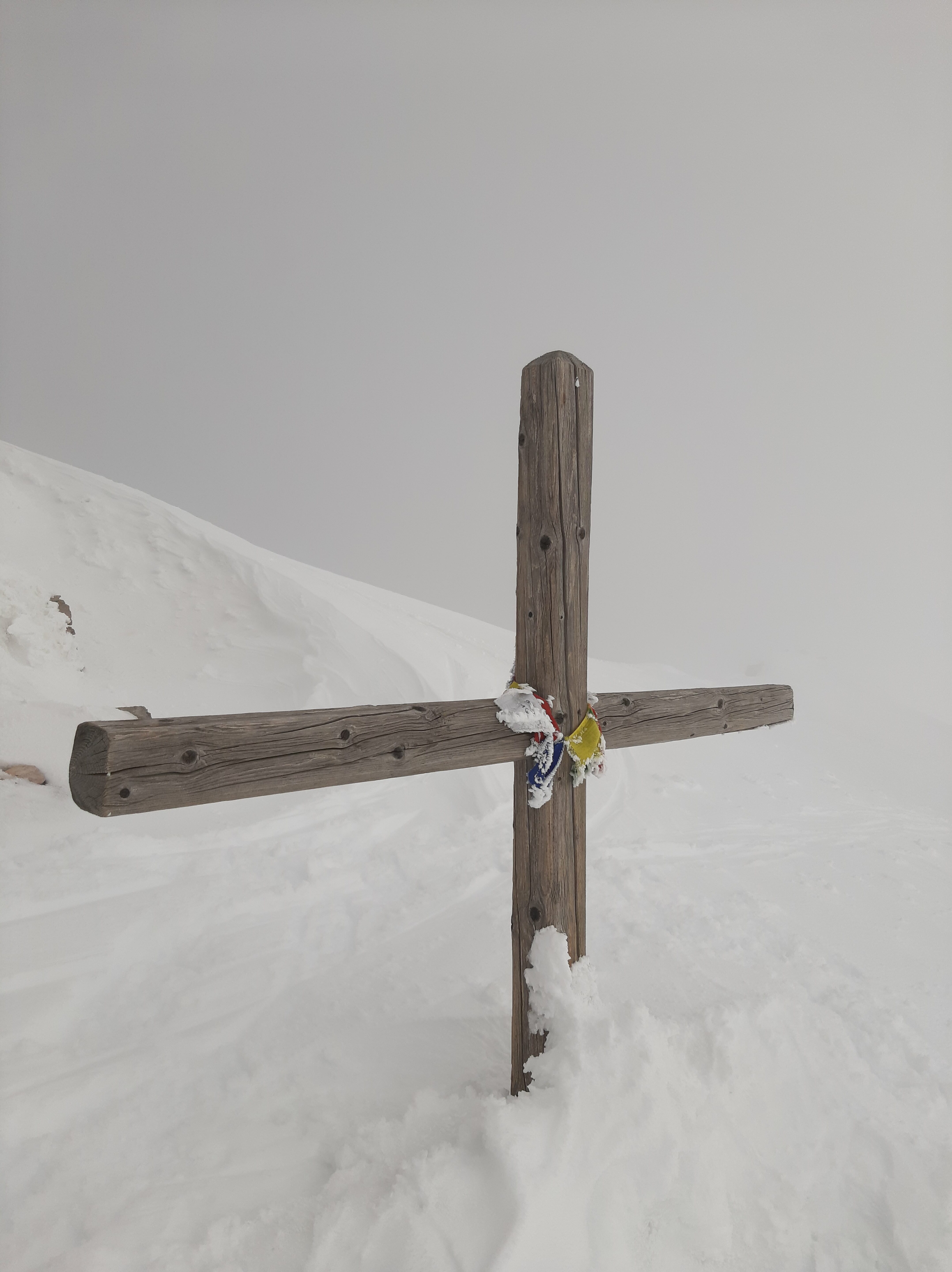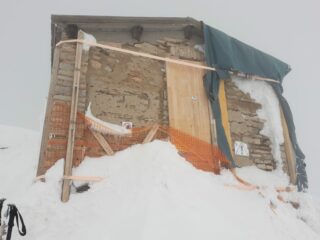 Portage fino a dietro la Maison de Chamois. Poi ciaspole fino in vetta, seguendo una traccia presente, provvidenziale perché dal colle eravamo nella nebbia totale. A salire la neve era perfetta. A scendere , ore 10.45, troppo scaldata, ma andava.