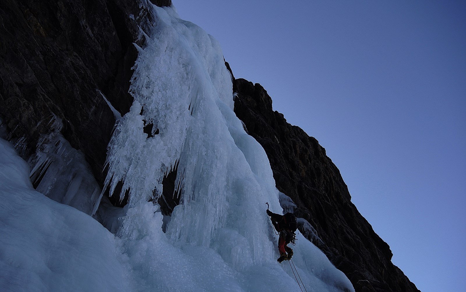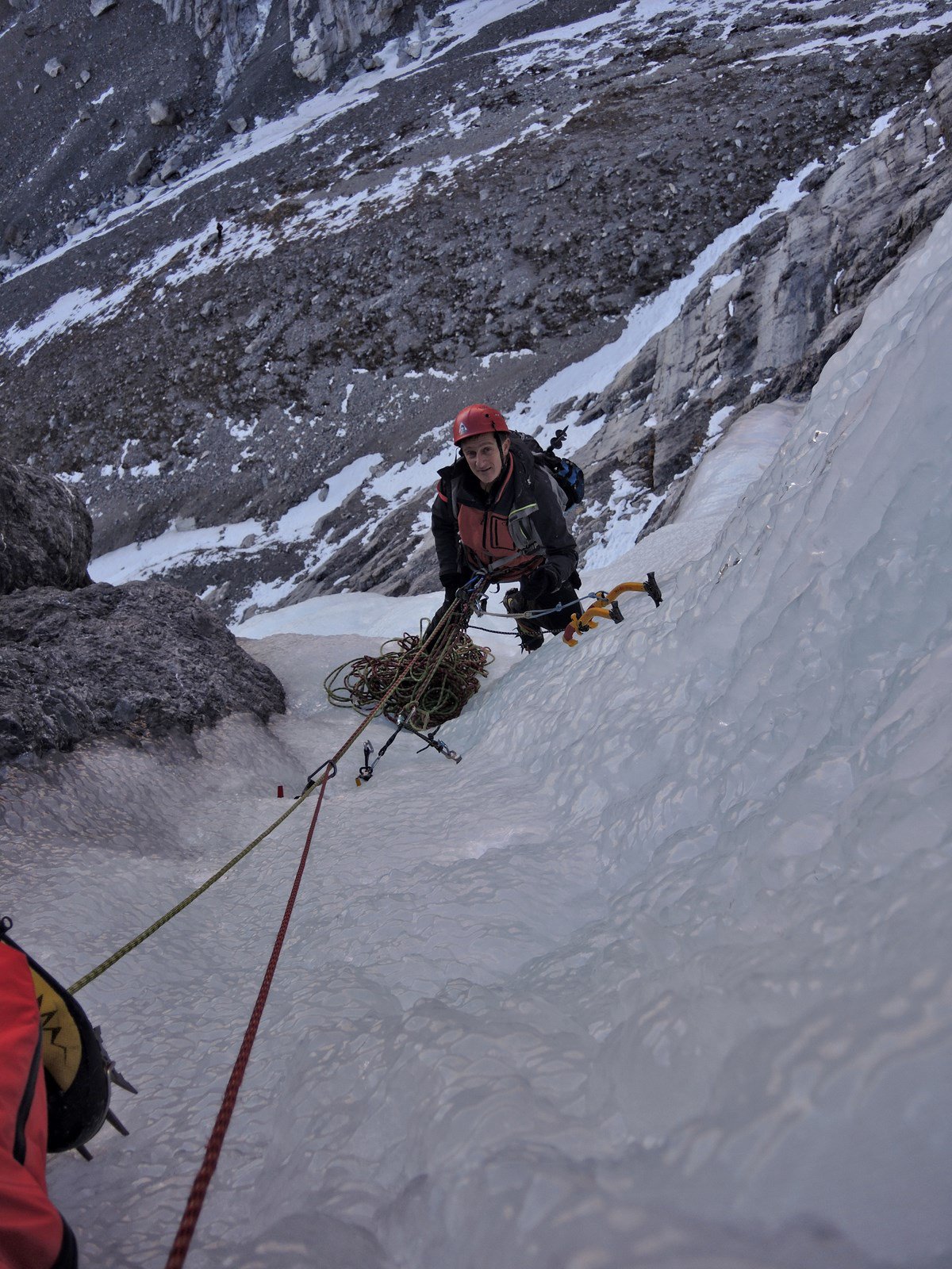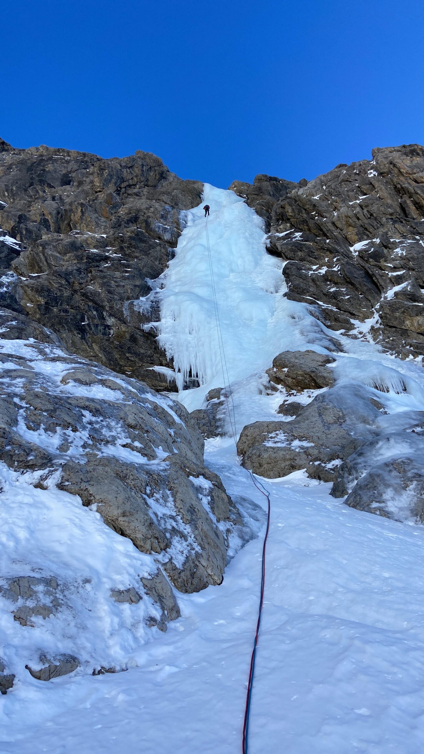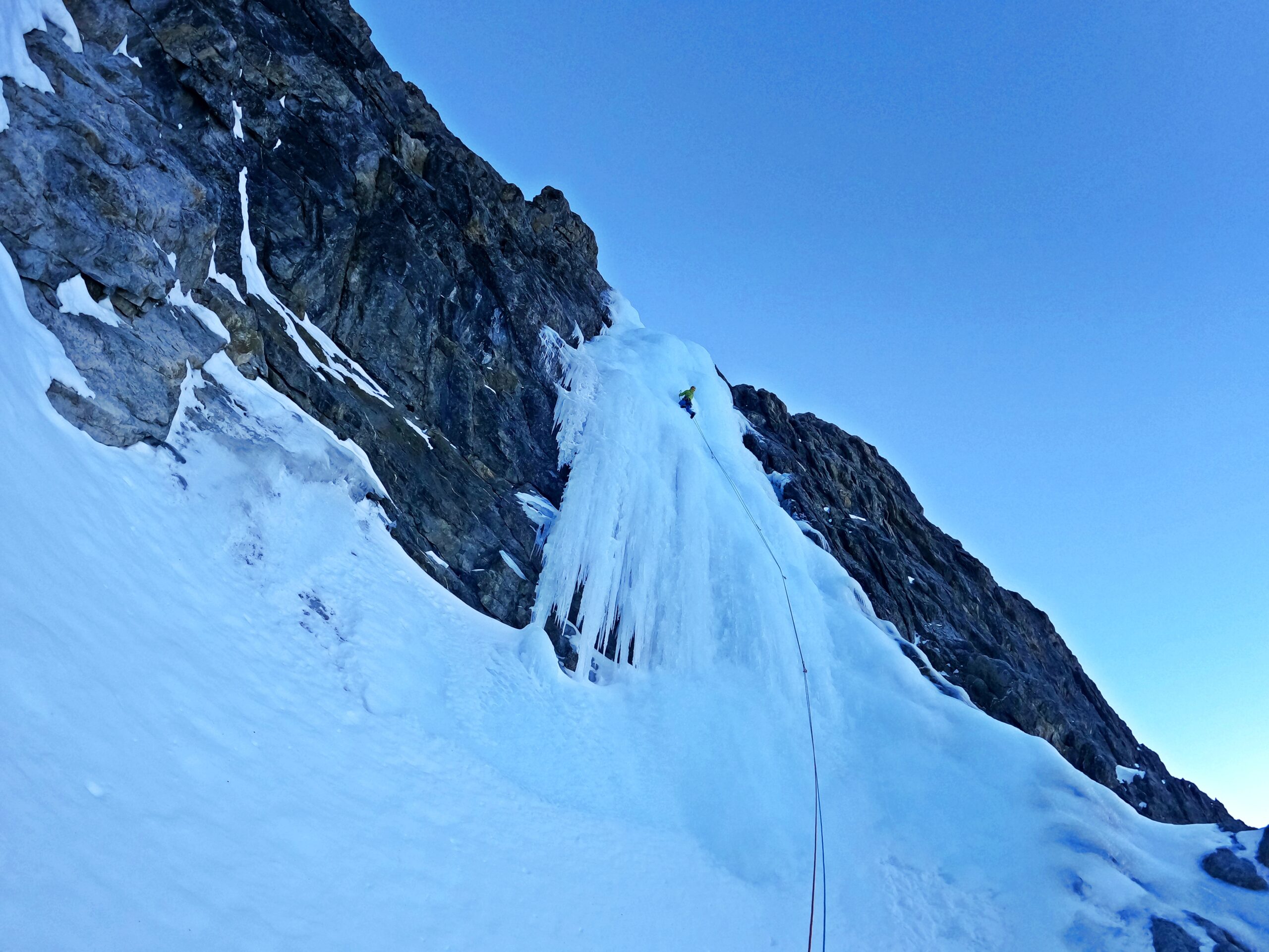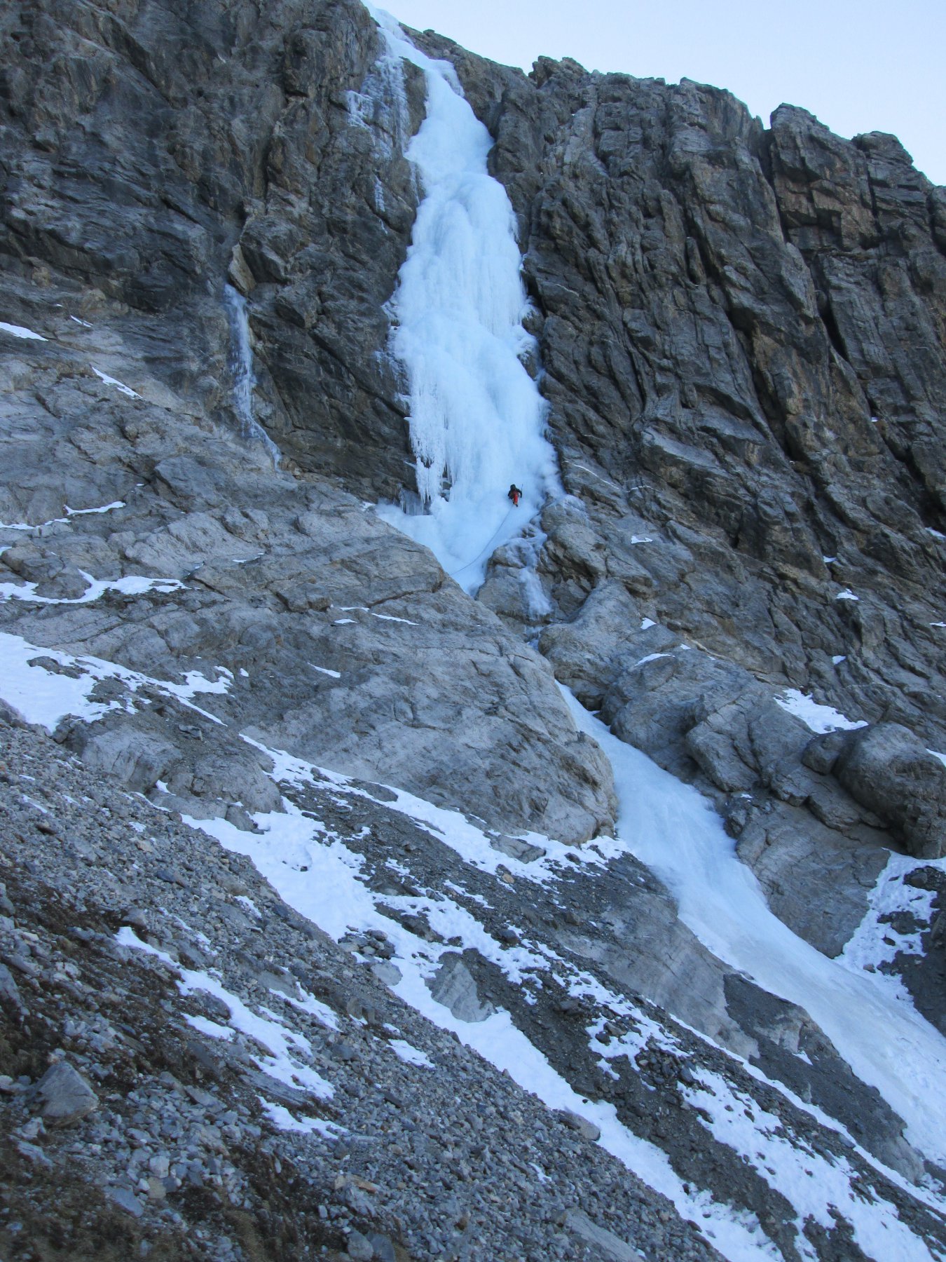 - Attaccare la cascata a sx (90°) o in un avvallamento al centro (85°). Salire verso sx fino alla fine del primo salto (70°-80°-85°), 45m.