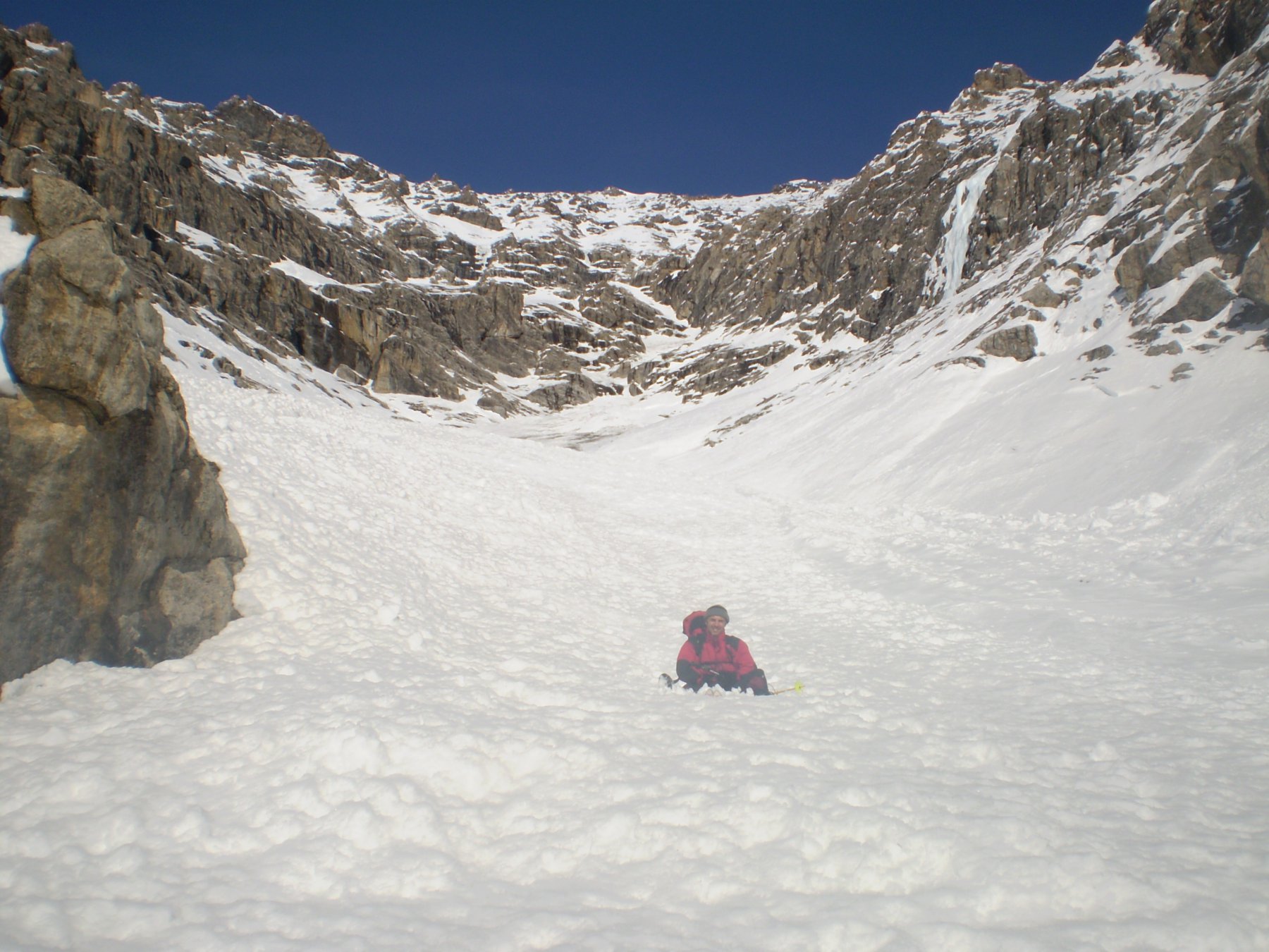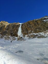 - Superare il salto nel centro (70°, tratti ad 80°) e dopo 50m uscire nel canalone che origina il cascatone.
