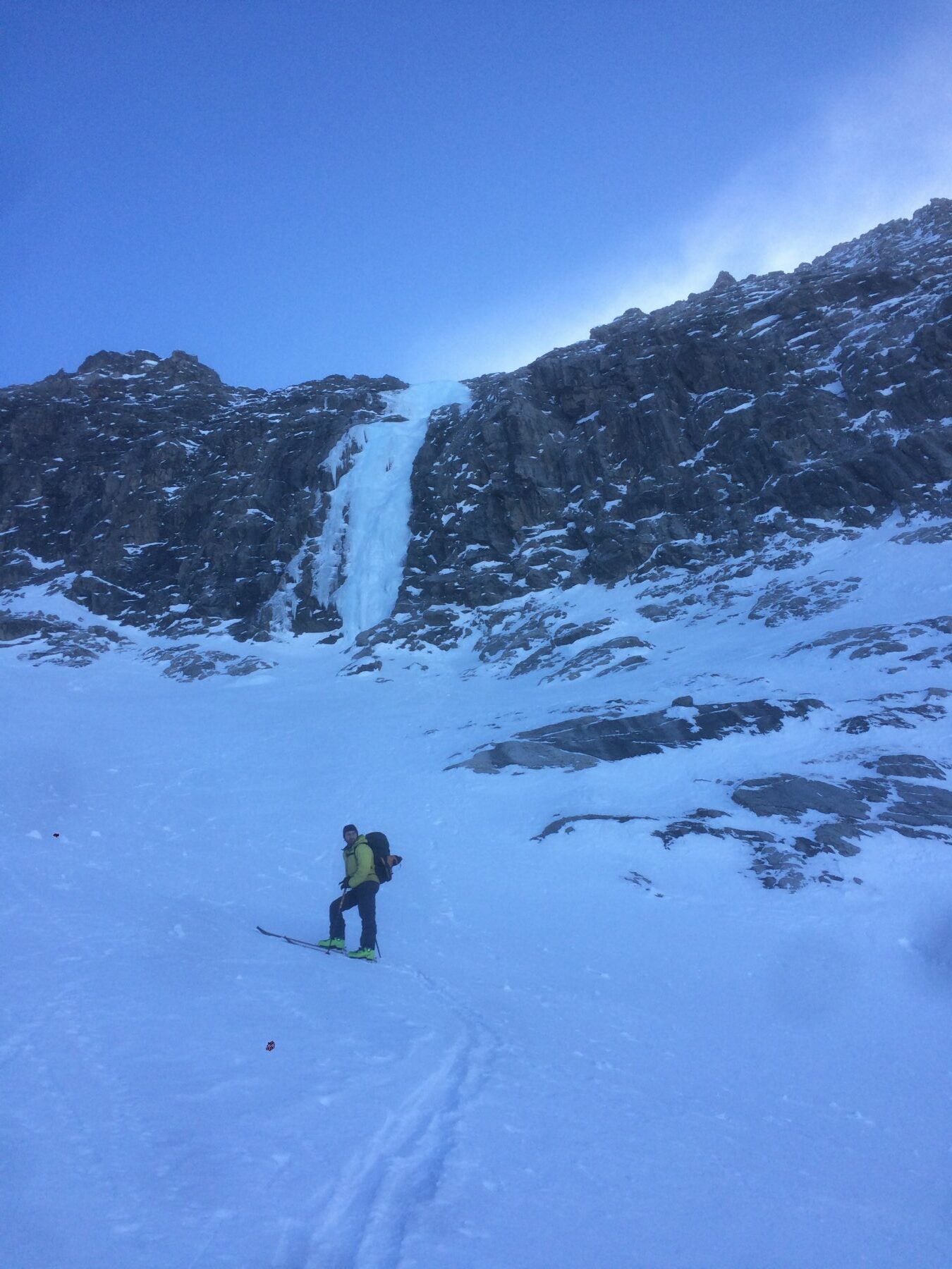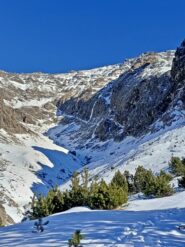 Discesa su abalakov oppure si individua a dx oltre uno speroncino un ripido e delicato canalino in neve e/o roccia conduce diagonalmente e in modo disagevole ai piedi della cascata.